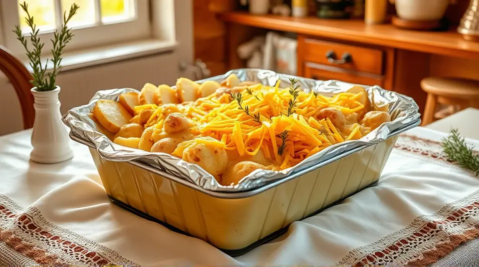 Cover the casserole with aluminum foil and bake for 40 minutes. Remove the foil, sprinkle the shredded cheddar cheese on top, and bake for an additional 15-20 minutes until the cheese is bubbly and golden, and the potatoes are tender.