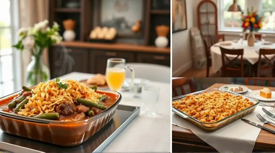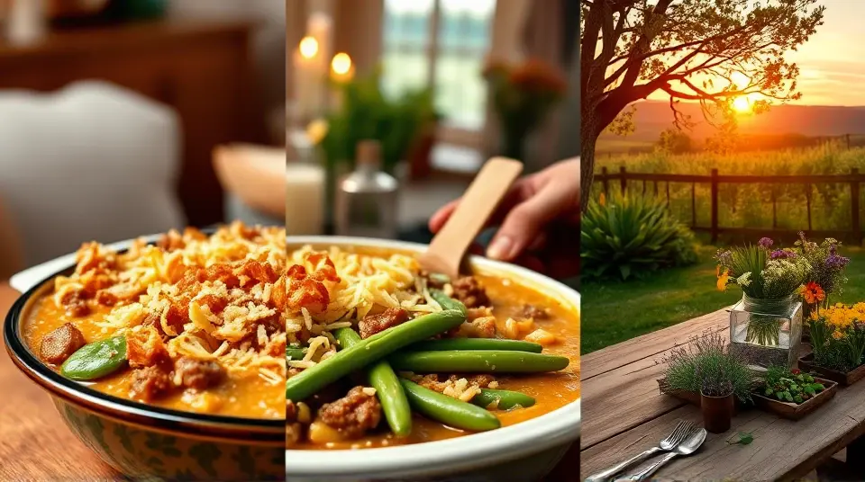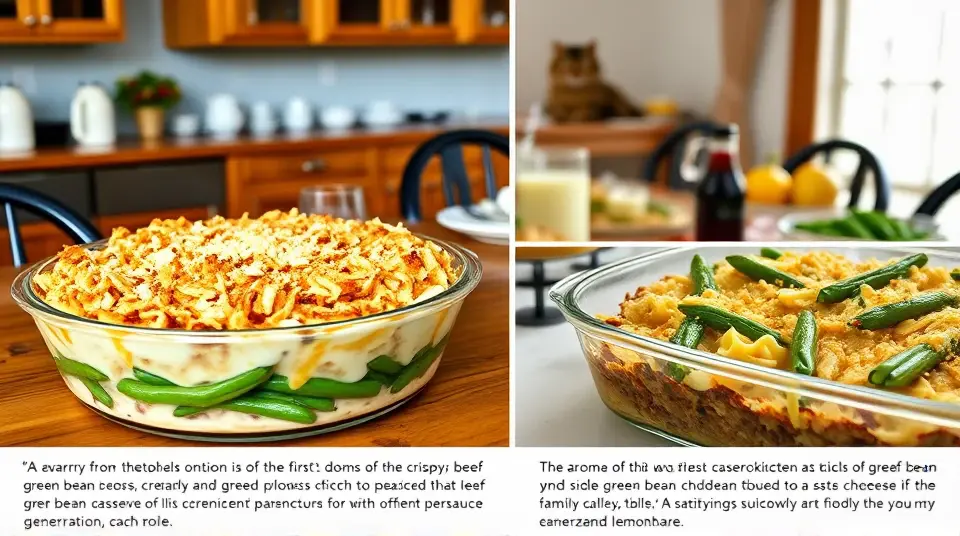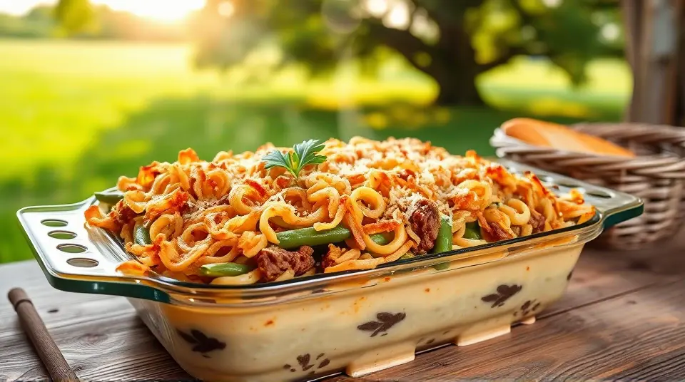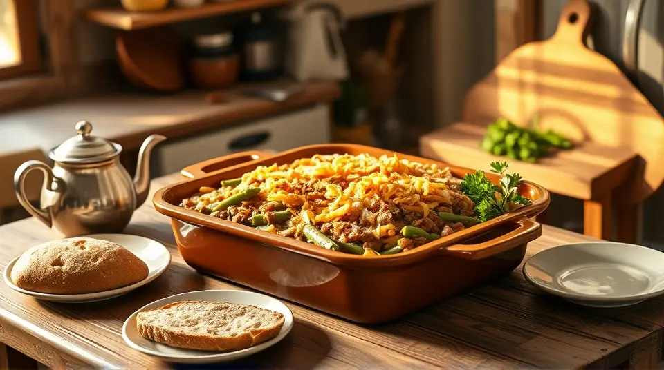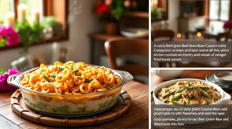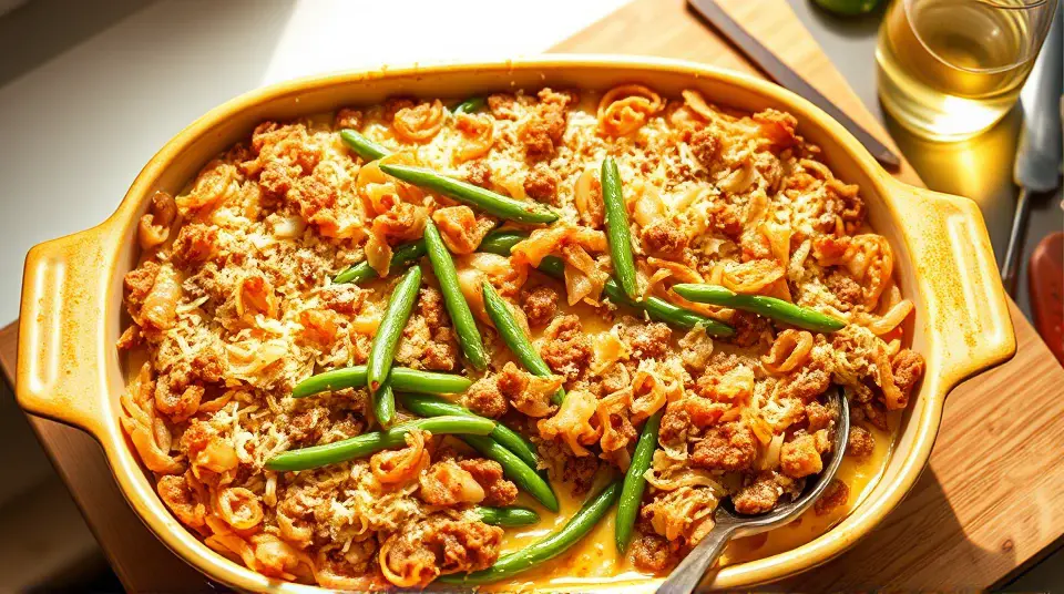 # Savory Beef Green Bean Casserole 🌱🥩 This comforting casserole is a delightful blend of tender beef, crisp green beans, and a creamy, savory sauce, topped off with crispy onions for that perfect crunch. It's an easy dish to whip up for family gatherings or a cozy weeknight dinner! Serve it with a side of crusty bread or a fresh salad for a complete meal. 🍞🥗 ## Ingredients ### For the casserole - 1 pound ground beef - 1 pound fresh green beans, trimmed and cut into 2-inch pieces - 1 medium onion, diced - 3 cloves garlic, minced - 1 cup sour cream - 1 can (10.5 oz) cream of mushroom soup - 1 teaspoon Worcestershire sauce - Salt and pepper, to taste - 1 teaspoon paprika - 1/2 cup shredded cheddar cheese (optional) ### For the topping - 1 1/2 cups crispy fried onions - 1/4 cup grated parmesan cheese ## Instructions 1. **Preheat the oven** to 350°F (175°C). 2. **Cook the beef**: In a large skillet over medium heat, cook the ground beef until browned. Drain excess fat, then add the diced onion and minced garlic. Sauté until the onion is translucent. > 🍳 For added flavor, consider seasoning the beef with your favorite spices while cooking. 3. **Prepare the sauce**: In a large mixing bowl, combine the sour cream, cream of mushroom soup, Worcestershire sauce, paprika, salt, and pepper. Mix until smooth. 4. **Combine everything**: Add the cooked beef mixture and green beans to the sauce, stirring gently until well coated. If using, fold in the shredded cheddar cheese for extra creaminess. > 🥬 If you want to add more vegetables, consider mixing in some sautéed mushrooms or bell peppers! 5. **Transfer to a baking dish**: Pour the mixture into a greased 9x13-inch casserole dish, spreading it evenly. 6. **Top it off**: Sprinkle the crispy fried onions and grated parmesan cheese evenly over the top of the casserole. 7. **Bake**: Place the dish in the preheated oven and bake for 30-35 minutes, or until bubbly and the topping is golden brown. 8. **Serve**: Let it cool for a few minutes before serving. Enjoy your hearty beef green bean casserole! > 🍽️ This dish can be stored in an airtight container in the fridge for up to 3 days. Reheat in the oven or microwave before serving! ## Variations - **Gluten-free**: Use a gluten-free cream of mushroom soup and ensure your crispy onions are gluten-free. - **Spicy**: Add some crushed red pepper flakes to the beef mixture for a bit of heat! 🌶️ - **Vegetarian**: Substitute sautéed mushrooms for the beef, using vegetable broth in place of the Worcestershire sauce for a richer flavor. - **Extra cheesy**: For a cheesier casserole, mix in more shredded cheese before baking and sprinkle some on top as well! Enjoy this savory dish that's bursting with flavor and is sure to become a family favorite! 🌟Images