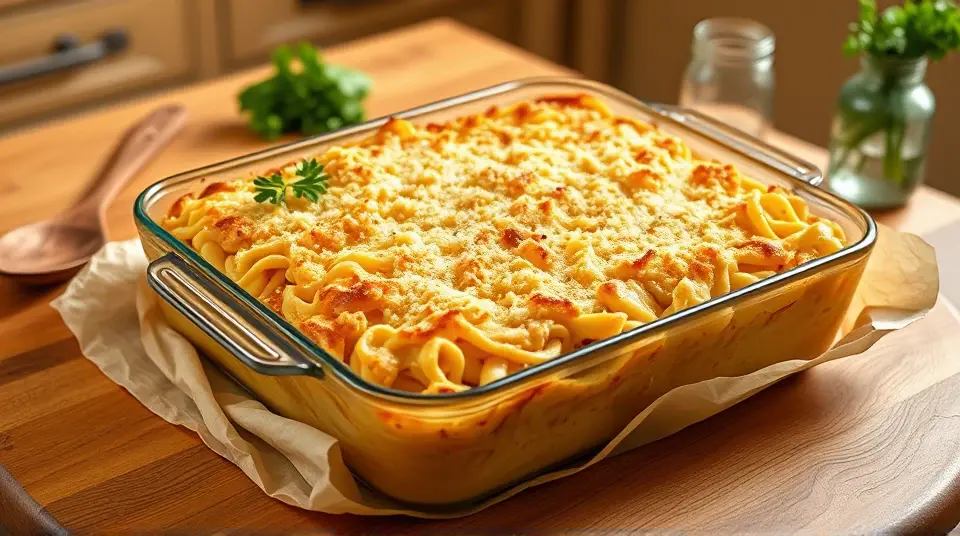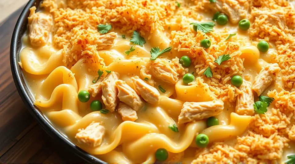 # Creamy Chicken Noodle Bake 🍗🍝 This hearty Chicken Noodle Bake is a comforting dish that brings warmth to any dinner table. It's packed with tender chicken, creamy sauce, and a delightful crunch on top! Perfect for a family meal or for batch-cooking to enjoy throughout the week, this dish is as delicious as it is easy to assemble. Pair it with a side salad for a complete meal! 🥗 ## Ingredients ### For the bake - 3 cups cooked egg noodles - 2 cups cooked, shredded chicken (rotisserie chicken works great!) - 1 cup frozen mixed vegetables (peas, carrots, and corn) - 1 can (10.5 oz) cream of chicken soup - 1 cup sour cream - 1 cup shredded cheddar cheese (plus extra for topping) - 1 teaspoon garlic powder - 1 teaspoon onion powder - Salt and pepper to taste ### For the topping - 1 cup crushed buttery crackers (like Ritz or Town House) - 2 tablespoons melted butter - 1/2 cup grated Parmesan cheese - Fresh parsley, chopped (for garnish) ## Instructions - Preheat your oven to 350°F (175°C). - In a large mixing bowl, combine the cooked egg noodles, shredded chicken, frozen mixed vegetables, cream of chicken soup, sour cream, garlic powder, onion powder, and cheddar cheese. Season with salt and pepper, and mix until everything is well combined. > 🥄 If you're short on time, use pre-cooked chicken from the grocery store. It's a game changer! - Pour the mixture into a greased 9x13 inch baking dish, spreading it out evenly. - In a separate bowl, mix the crushed crackers, melted butter, and Parmesan cheese until combined. Sprinkle this mixture evenly over the chicken noodle mixture in the baking dish. Add a little extra cheddar cheese on top for a cheesy, golden finish. - Bake in the preheated oven for 30-35 minutes, or until it is bubbly and golden brown on top. > 🕒 Keep an eye on it in the last few minutes of baking to prevent over-browning. You can cover it with foil if necessary. - Once done, remove from the oven and let it rest for about 5 minutes. Garnish with fresh parsley before serving. ## Variations - **Vegetarian**: Substitute chicken with sautéed mushrooms, zucchini, or chickpeas, and use a vegetable-based cream soup to maintain the creamy texture. 🍄 - **Spicy**: Add diced jalapeños or a dash of hot sauce to the mixture for a kick! 🌶️ - **Gluten-free**: Use gluten-free noodles and crushed gluten-free crackers to make this dish suitable for gluten sensitivities. - **Herb-packed**: Add 1 teaspoon of dried thyme or Italian seasoning to the mixture for extra flavor depth. This creamy chicken noodle bake is sure to become a family favorite! Enjoy! 😋Images