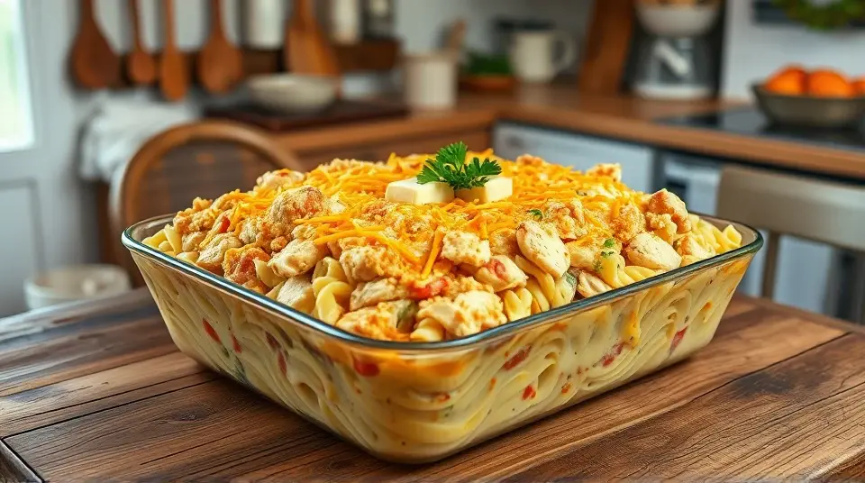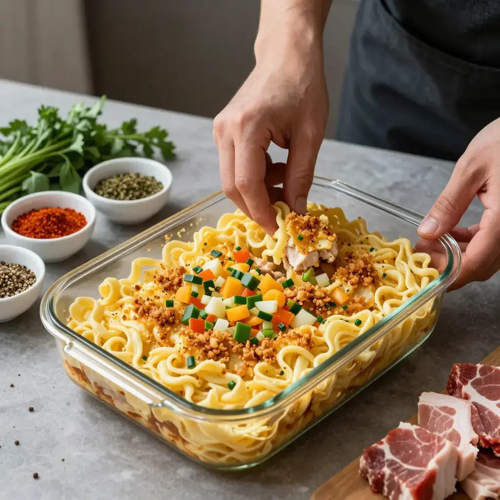 In a separate bowl, mix the crushed crackers, melted butter, and Parmesan cheese until combined. Sprinkle this mixture evenly over the chicken noodle mixture in the baking dish. Add a little extra cheddar cheese on top for a cheesy, golden finish.