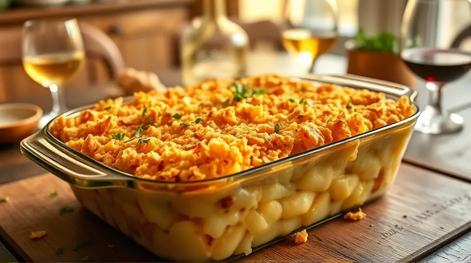 After 45 minutes, remove the casserole from the oven and sprinkle the cornflake mixture on top. Return to the oven and bake for an additional 10-15 minutes, until golden brown and crispy.