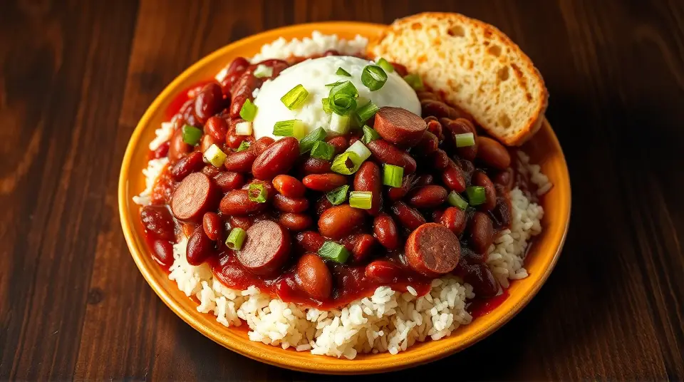 # Southern Comfort Louisiana Style Red Beans and Rice 🌶️🍚 This delightful dish embodies the heart of Cajun and Creole cooking, offering a perfect mix of flavors and textures that will transport you straight to the bayou. Rich, savory, and oh-so-satisfying, this Louisiana staple is best enjoyed with a side of cornbread or crusty French bread for soaking up every drop of the seasoned goodness! 🥖✨ ## Ingredients ### For the red beans - 1 lb dried red kidney beans (soaked overnight) - 1 tablespoon vegetable oil - 1 large onion, diced - 1 green bell pepper, diced - 2 celery stalks, diced - 4 cloves garlic, minced - 1 pound smoked sausage (like Andouille or kielbasa), sliced - 1 teaspoon smoked paprika - 1 teaspoon dried thyme - 2 bay leaves - 1 teaspoon cayenne pepper (adjust to taste) - 1 teaspoon black pepper - Salt to taste - 4 cups chicken broth - 2 tablespoons Worcestershire sauce - 1 tablespoon hot sauce (optional for extra heat) ### For the rice - 2 cups long-grain white rice - 4 cups water - 1 teaspoon salt - 1 tablespoon butter (optional) ## Instructions 1. **Preparation of Beans**: Drain and rinse the soaked kidney beans. Set aside. 2. **Sauté the Vegetables**: In a large pot or Dutch oven, heat the vegetable oil over medium heat. Add the diced onion, green bell pepper, and celery (the "Holy Trinity" of Cajun cooking). Sauté until softened, about 5-7 minutes. > 🥄 Remember to stir often to prevent the vegetables from sticking or browning too much. 3. **Add the Sausage and Garlic**: Stir in the sliced sausage and garlic, cooking for another 2-3 minutes until fragrant. 4. **Combine Ingredients**: Add the soaked beans, smoked paprika, thyme, bay leaves, cayenne pepper, black pepper, and season with salt. Pour in the chicken broth and Worcestershire sauce. Bring to a boil. 5. **Simmer**: Reduce the heat to low, cover, and let simmer for about 1.5 to 2 hours, or until the beans are tender. Stir occasionally and add more liquid if necessary. Adjust seasoning as needed. > 🧄 For added depth of flavor, you can also toss in a bay leaf or a piece of ham hock during the cooking process. 6. **Cook the Rice**: In a separate pot, bring the water to a boil with salt. Stir in the rice, cover, and reduce the heat to low. Cook for about 20 minutes or until the rice is tender and the water is absorbed. Fluff with a fork, adding butter if desired for a creamy touch. 7. **Serve**: Once the beans are ready, remove the bay leaves and serve the red beans over a generous scoop of rice. Drizzle with hot sauce if you like a spicy kick! > 🌶️ Pair with a side of cornbread or sautéed greens for a true Southern experience. ## Variations - **Vegetarian**: Swap the sausage for smoked tempeh or mushrooms for that umami flavor without the meat. - **Spicy**: Add fresh chopped jalapeños or a dash of chili powder for extra warmth. - **Meal Prep**: This dish keeps well in the fridge for several days, making it ideal for making ahead of time. Just reheat as needed. Enjoy this delicious Louisiana Style Red Beans and Rice with family and friends, and let the love and spice bring everyone together! ❤️🍽️Images