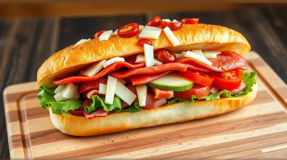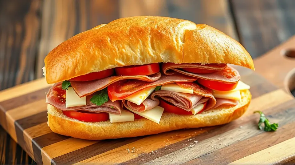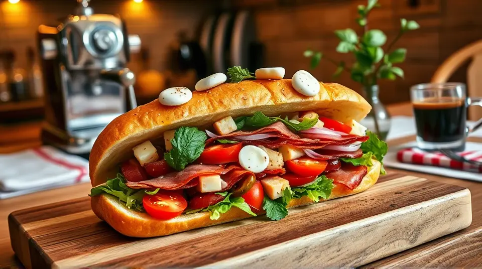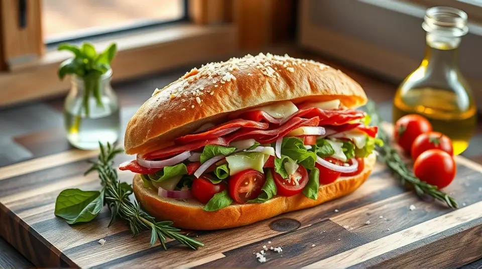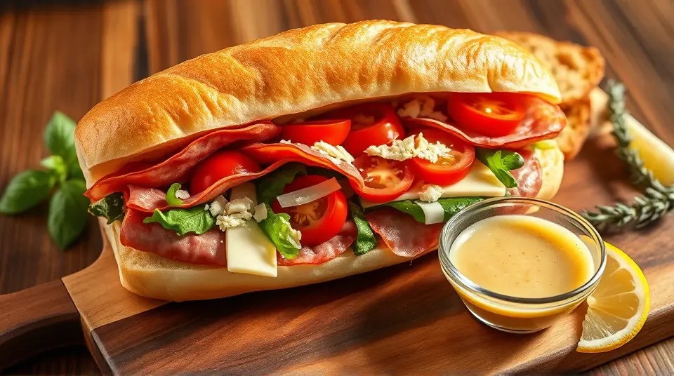 # Chopped Italian Sandwich 🇮🇹🥪 The Chopped Italian Sandwich is a vibrant, hearty meal perfect for lunch or a quick dinner. Packed with flavors of fresh Italian ingredients and a zesty dressing, this sandwich is not only satisfying but also easy to make. It’s an excellent choice for picnics, family gatherings, or just a delicious meal at home! Pair it with a side of chips or a light salad for a complete feast! 🍅🥗 ## Ingredients ### For the sandwich - 1 fresh Italian hoagie roll (or ciabatta bread) - 4 ounces of sliced salami - 4 ounces of sliced prosciutto - 4 ounces of capicola - 1 cup of chopped romaine lettuce - 1/2 cup of cherry tomatoes, halved - 1/4 cup of red onion, thinly sliced - 1/4 cup of pepperoncini peppers, sliced - 1/2 cup of provolone cheese, shredded ### For the dressing - 3 tablespoons of olive oil - 1 tablespoon of red wine vinegar - 1 teaspoon of dried oregano - 1 teaspoon of garlic powder - Salt and pepper to taste ## Instructions 1. **Prepare the dressing**: In a small bowl, whisk together olive oil, red wine vinegar, dried oregano, garlic powder, salt, and pepper until well combined. Adjust seasoning to taste. 2. **Chop the ingredients**: In a large bowl, combine chopped romaine lettuce, cherry tomatoes, red onion, pepperoncini peppers, and shredded provolone cheese. Add the sliced salami, prosciutto, and capicola. 3. **Dress the mixture**: Pour the dressing over the chopped mixture and toss to combine, ensuring everything is evenly coated. > 🥗 Feel free to adjust the proportions of meats or veggies based on your preference! A little more cheese or a few more tomatoes can elevate the flavors even more. 4. **Assemble the sandwich**: Slice the Italian hoagie roll in half and lightly toast it if desired. Spoon the chopped mixture onto the bottom half of the roll, draping it generously. 5. **Top it off**: Place the top half of the roll atop the filling, pressing down gently. 6. **Slice and Serve**: Cut the sandwich in half and serve it immediately or wrap it up for later! > 🧄 For an extra kick, consider adding a slice of fresh mozzarella or a drizzle of spicy garlic sauce before closing the sandwich. ## Variations - **Vegetarian**: Substitute the meats with grilled vegetables or marinated artichokes, and add extra cheese for richness. 🌱 - **Spicy**: Add sliced jalapeños or a sprinkle of crushed red pepper flakes to give the sandwich a fiery kick! 🌶️ - **Herbaceous**: Incorporate fresh basil or arugula for an aromatic twist that complements the Italian flavors perfectly. 🌿 - **Wrap it up**: For a portable option, consider using a large tortilla to wrap the filling for a delicious Italian wrap! Enjoy your Chopped Italian Sandwich, bursting with flavor and wholesome ingredients! Buon Appetito! 🍽️✨Images