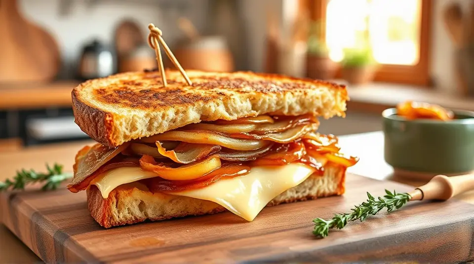 Assemble the sandwich: On two slices of sourdough, spread a generous layer of goat cheese. Top with equal portions of aged cheddar and Gruyère. Spoon some caramelized onions over the cheese, and top with the remaining slices of sourdough.