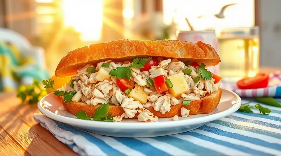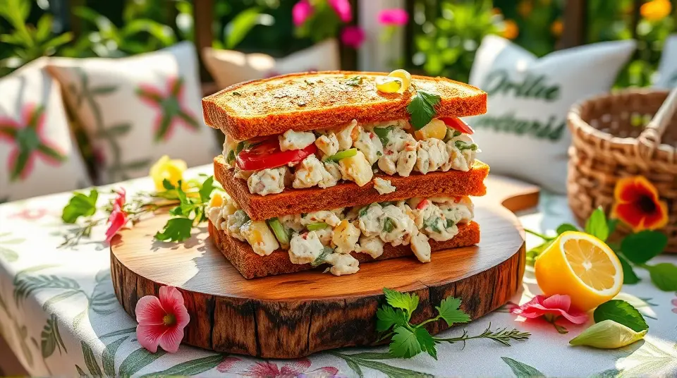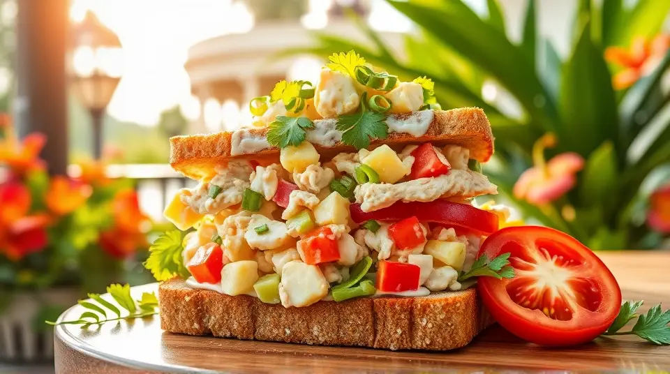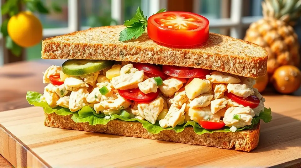 # Tropical Pineapple Chicken Salad Sandwich ๐๐ฅช This Pineapple Chicken Salad Sandwich is a delightful blend of savory and sweet flavors, perfect for a summer picnic or a quick lunch at home. The combination of tender chicken, juicy pineapple, and a creamy dressing creates a refreshing and satisfying meal. Serve it on your favorite bread, and you've got a sandwich that your taste buds will celebrate! ## Ingredients ### For the chicken salad - 2 cups cooked chicken, shredded or diced - 1 cup fresh pineapple, diced (or canned) - 1/2 cup celery, finely chopped - 1/4 cup red bell pepper, diced - 1/4 cup green onions, chopped - 1/2 cup plain Greek yogurt (or mayonnaise) - 1 tablespoon honey - 1 teaspoon Dijon mustard - Salt and pepper, to taste - Fresh cilantro or parsley, for garnish (optional) ### For assembly - 4 slices of whole grain or sourdough bread - Lettuce leaves (optional) - Sliced tomatoes (optional) ## Instructions - In a large mixing bowl, combine the shredded chicken, diced pineapple, celery, red bell pepper, and green onions. > ๐ Use leftover rotisserie chicken for a quick assembly, or poach your chicken breast for a fresher option. Both work beautifully! - In a separate small bowl, mix together the Greek yogurt, honey, Dijon mustard, salt, and pepper. Adjust seasoning according to your preference. - Pour the dressing over the chicken mixture and toss until everything is coated evenly. > ๐ฏ For a tangier kick, add a splash of lemon juice or a teaspoon of apple cider vinegar to the dressing. - Chill the chicken salad in the refrigerator for about 30 minutes to let the flavors meld. - When ready to serve, toast the bread slices if desired. Spread a layer of lettuce on the bread (if using) and generously scoop the pineapple chicken salad on top. - Top with sliced tomatoes, a sprinkle of fresh herbs, and the other slice of bread. > ๐ฟ Fresh herbs like cilantro or parsley add a burst of freshness that beautifully complements the sweet pineapple! ## Variations - **Substitute proteins**: Swapping chicken for diced turkey or even chickpeas will create a similar delicious flavor profile. ๐ฆ - **Creamy and crunchier**: Mix in some chopped nuts (like walnuts or almonds) for a delightful crunch! - **Spicy twist**: Add a finely diced jalapeรฑo or a sprinkle of cayenne pepper to the salad for a spicy kick! ๐ฅ - **Low-carb option**: Serve the chicken salad in lettuce wraps instead of bread for a refreshing, low-carb alternative. Enjoy each bite of this vibrant and tasty Pineapple Chicken Salad Sandwich! Perfect for any time you're craving something light yet satisfying. ๐ฅ๐ฝ๏ธImages