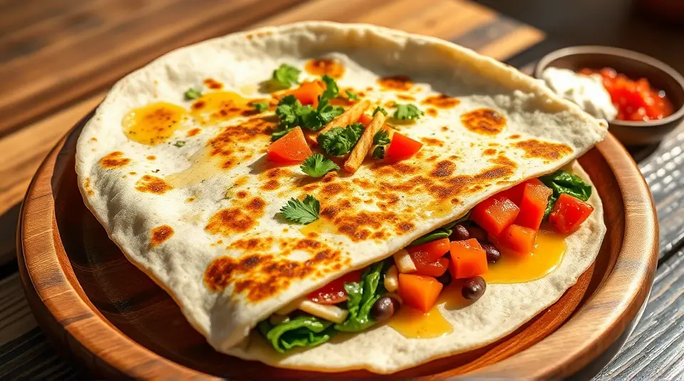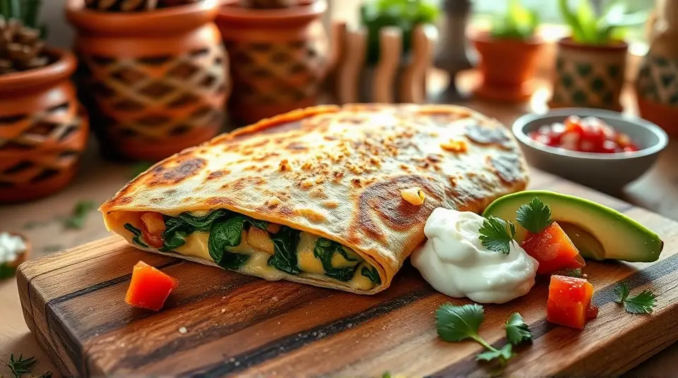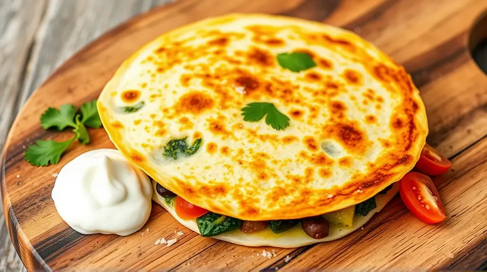 # Cheesy Spinach Tomato Quesadilla 🌮🍅 This delightful quesadilla combines the earthiness of spinach with the juicy sweetness of tomatoes and gooey cheese. It's quick to make and perfect for a savory lunch or a light dinner. Pair it with a zesty salsa or a dollop of sour cream for an added kick! 🌶️🥑 ## Ingredients ### For the quesadilla - 4 large flour tortillas (or whole wheat for a healthier option) - 1 cup fresh spinach, roughly chopped - 1 large tomato, diced - 1 cup shredded cheese (cheddar, mozzarella, or a Mexican blend work great) - 1/2 cup black beans, drained and rinsed (optional for extra protein) - 1 teaspoon olive oil - 1/2 teaspoon garlic powder - Salt and pepper to taste ### For serving - Salsa - Sour cream or Greek yogurt - Avocado or guacamole (optional) - Fresh cilantro, chopped (for garnish) ## Instructions - Heat the olive oil in a large skillet over medium heat. Once hot, add the chopped spinach and sauté for 2-3 minutes until wilted. - Stir in the diced tomato and black beans (if using). Season with garlic powder, salt, and pepper. Cook for another 2 minutes to warm through, then remove from heat. > 🥗 Feel free to add other veggies like bell peppers, onions, or corn for additional flavor and texture. - Place a tortilla in the skillet over low heat. Sprinkle half of the tortilla with 1/4 cup of shredded cheese, then add a generous spoonful of the spinach-tomato mixture on top of the cheese. Top with another 1/4 cup of cheese and fold the tortilla in half. - Cook for about 3-4 minutes, or until the bottom is golden brown and the cheese is melting. Flip carefully and cook the other side for another 3-4 minutes. > ⏰ Keep an eye on the quesadilla to prevent burning! You can adjust the heat as needed. - Once both sides are crispy and golden, transfer the quesadilla to a cutting board. Let it cool for a minute, then cut into wedges. - Serve with salsa, sour cream, and avocado on the side. Garnish with fresh cilantro for extra flavor! ## Variations - **Spicy**: Add a few jalapeño slices inside the quesadilla for heat! 🌶️ - **Vegan**: Use a dairy-free cheese substitute and skip the sour cream. You can also add nutritional yeast for a cheesy flavor. - **Protein-packed**: Mix in shredded chicken or cooked quinoa for added protein. - **Zucchini addition**: Grate some zucchini and add it to the spinach mixture for extra veggies! This Spinach Tomato Quesadilla is not only tasty but also a canvas for your culinary creativity—feel free to experiment with different ingredients! Enjoy! 🥳Images