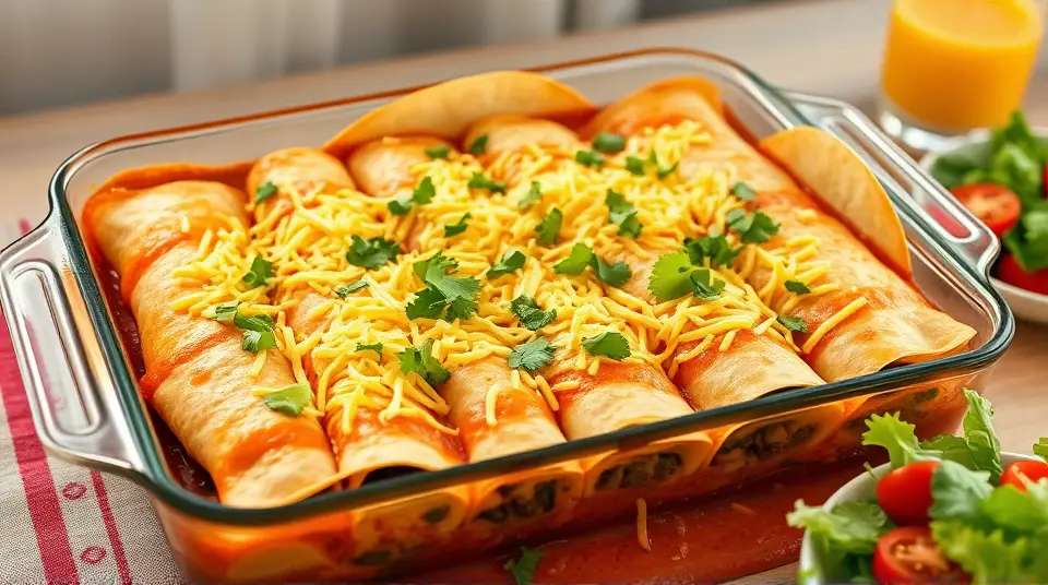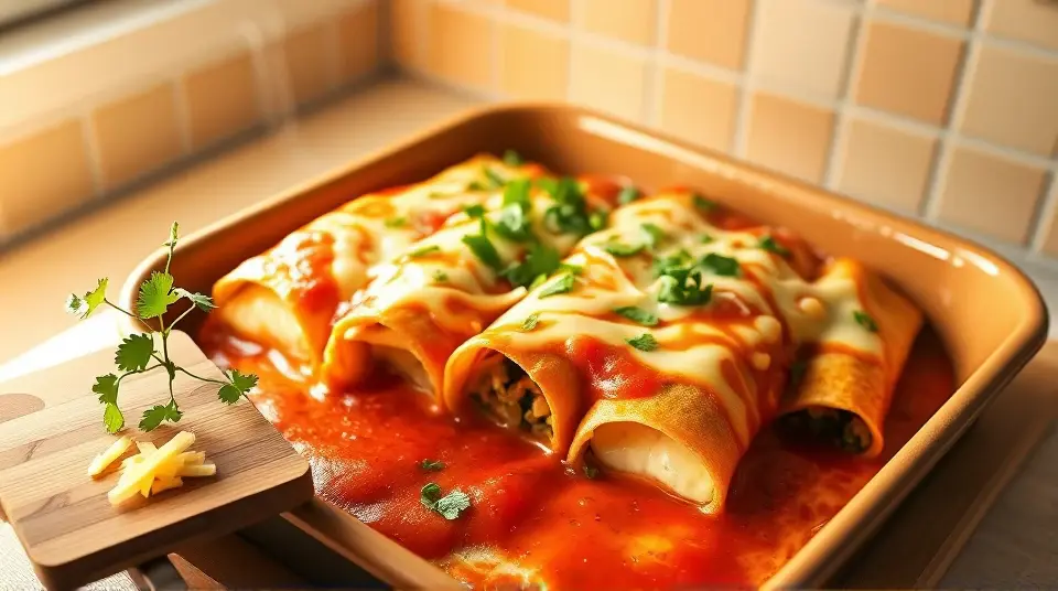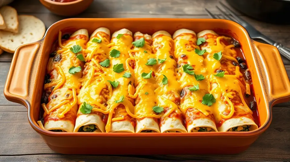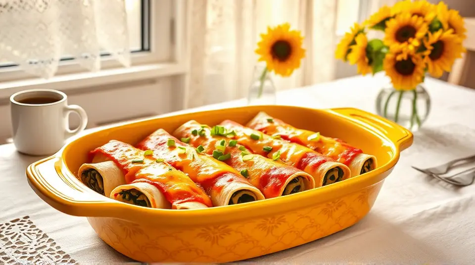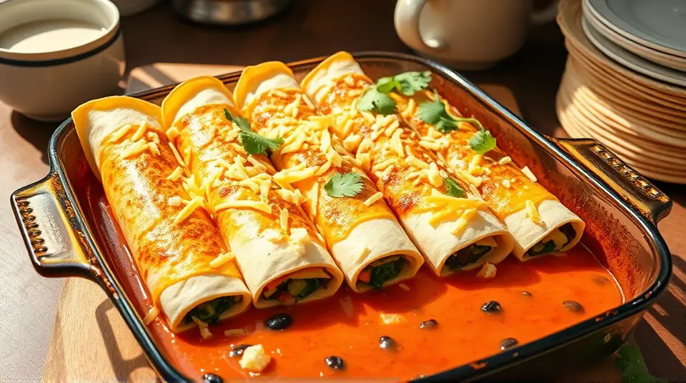 # Cheesy Veggie Breakfast Enchiladas 🌯🌶️ Start your day off right with these scrumptious Cheesy Veggie Breakfast Enchiladas! Packed with flavorful ingredients and topped with a zesty enchilada sauce, this dish is both hearty and satisfying. It's perfect for a leisurely weekend brunch or a fun breakfast-for-dinner night. Pair it with a side of fresh fruit or a light salad for a balanced meal! 🍳🥑 ## Ingredients ### For the filling - 8 small corn tortillas - 1 cup of cooked black beans (rinsed and drained) - 1 cup of diced bell peppers (red, green, or yellow) - 1 cup of chopped spinach - 1 cup of shredded cheese (cheddar or Monterey Jack) - 4 large eggs - 1/4 cup of milk - Salt and pepper to taste - 1 tsp cumin - 1/2 tsp paprika ### For the sauce - 1 ½ cups red enchilada sauce (store-bought or homemade) - 1/2 cup of diced onions - 1 tsp olive oil - 1 tsp garlic powder - Optional: Fresh cilantro for garnish ## Instructions - Preheat your oven to 375°F (190°C). - In a skillet, heat olive oil over medium heat. Add the diced onions and bell peppers, and sauté until the onions are translucent and the peppers are tender, about 5 minutes. > 🥄 Make sure to stir occasionally to prevent the onions from burning. If you prefer a milder flavor, you can omit the peppers or substitute with zucchini. - In a bowl, whisk the eggs with milk, salt, pepper, cumin, and paprika. Pour the egg mixture into the skillet with the veggies and continue cooking until the eggs are just set, stirring occasionally. Remove from heat and stir in the black beans and spinach. - To assemble the enchiladas, spread 1/4 cup of enchilada sauce in the bottom of a 9x13 inch baking dish. - Microwave the tortillas for 30 seconds to make them pliable. Take a tortilla, fill it with a scoop (about 1/4 cup) of the egg and veggie mixture, and top it with a little cheese. Roll it up and place it seam-side down in the baking dish. Repeat with all tortillas. - Once all enchiladas are in the dish, pour the remaining enchilada sauce over the top and sprinkle with the remaining cheese. > 🧊 If you want to add a bit of heat, feel free to mix in a chopped jalapeño pepper with the veggies or use a spicier enchilada sauce. - Cover the baking dish with foil and bake in the oven for 20 minutes. Remove the foil and bake for an additional 10 minutes, or until the cheese is bubbly and golden. - Garnish with fresh cilantro before serving. Enjoy your delicious breakfast enchiladas warm! ## Variations - **Vegetarian**: Substitute the black beans with refried beans or add other veggies like mushrooms or zucchini. - **Meat Lovers**: Add cooked sausage or chorizo to the filling for a heartier option. - **Dairy-Free**: Use a dairy-free cheese alternative and a plant-based milk for the eggs. - **Make-Ahead**: Prepare the filling and assemble the enchiladas the night before and store them in the fridge. Just add a few extra minutes to the baking time. Enjoy a delightful twist on breakfast with these Cheesy Veggie Breakfast Enchiladas! 🎉🥑✨Images
