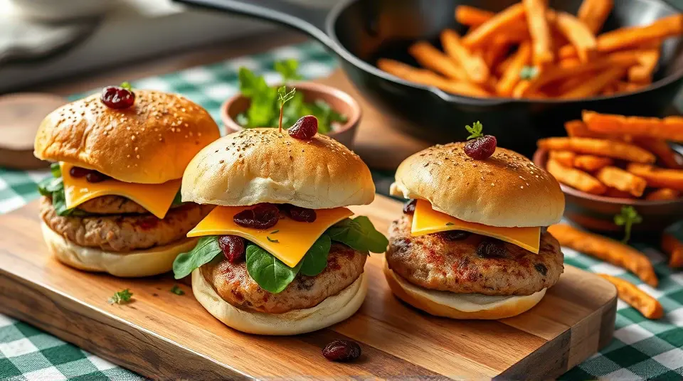 # Savory Turkey Sliders with Craisins 🦃🍔 These turkey sliders with a sweet and tangy twist of Craisins are the perfect bite-sized treat for any gathering. Moist, flavorful, and easy to customize, they offer a delightful combination of savory and sweet that everyone will love. Serve them at your next picnic or game day for a guaranteed hit! 🎉 ## Ingredients ### For the turkey sliders - 1 pound ground turkey - 1/2 cup Craisins (dried cranberries) - 1/4 cup finely chopped onion - 1/4 cup breadcrumbs (use whole wheat for a healthier option) - 1 egg - 1 tablespoon Dijon mustard - 1 teaspoon garlic powder - 1/2 teaspoon salt - 1/4 teaspoon black pepper - Slider buns (mini hamburger buns) ### For the toppings - Leafy greens (spinach or arugula) - Sliced cheese (cheddar or havarti) - Mayonnaise or your favorite sauce - Additional Craisins for garnish (optional) ## Instructions - In a large bowl, combine the ground turkey, Craisins, chopped onion, breadcrumbs, egg, Dijon mustard, garlic powder, salt, and pepper. Mix until well combined, but be careful not to overmix. > 🥄 For the juiciest sliders, handle the meat mixture gently. Overworking can lead to dense sliders, so just mix until everything is nicely incorporated. - Preheat a skillet or grill pan over medium heat. Lightly grease with cooking spray or a drizzle of olive oil. - Shape the turkey mixture into small patties (about 2-3 inches in diameter) and place them on the preheated skillet. - Cook the sliders for about 5-6 minutes on each side, or until they reach an internal temperature of 165°F (75°C). If you're adding cheese, place a slice on each patty during the last minute of cooking to melt. > 🔥 For a smoky flavor, consider adding a dash of smoked paprika to the turkey mixture! - Once cooked, remove the sliders from the skillet and let them rest briefly. Meanwhile, toast the slider buns lightly, if desired. - Assemble your sliders by placing a turkey patty on the bottom half of a bun. Top with leafy greens, a dollop of mayonnaise or your favorite sauce, and finish with the top half of the bun. > 🍽️ For a fun presentation, serve the sliders with toothpicks and a side of sweet potato fries or a fresh salad. ## Variations - **Spicy Kick**: Add diced jalapeños or a splash of hot sauce to the turkey mixture for a spicy version of these sliders! 🌶️ - **Herbs & Spices**: Fresh herbs like parsley or thyme can be mixed into the turkey for a burst of flavor. - **Gluten-free**: Substitute breadcrumbs with gluten-free breadcrumbs or ground oatmeal for a gluten-free option. - **Low-carb**: Skip the buns altogether and serve the sliders wrapped in lettuce for a delicious low-carb alternative! 🥬 Enjoy these quirky and tasty turkey sliders with Craisins at your next gathering, and watch them disappear in no time! 🥳Images