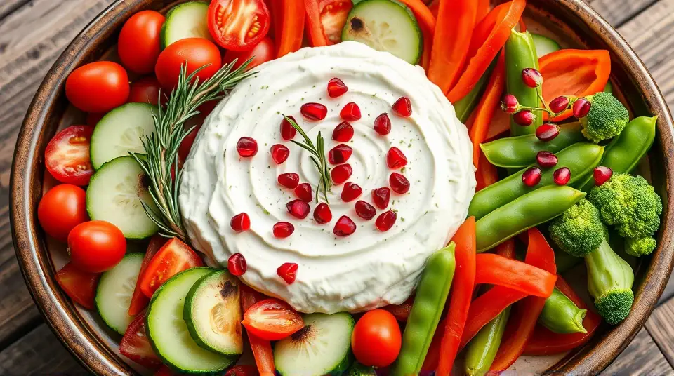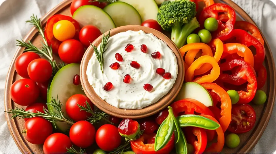 Arrange the red and green veggies around the dip in a colorful display. Sprinkle the pomegranate seeds on top of the dip for a festive pop of color.