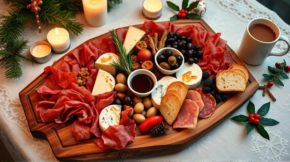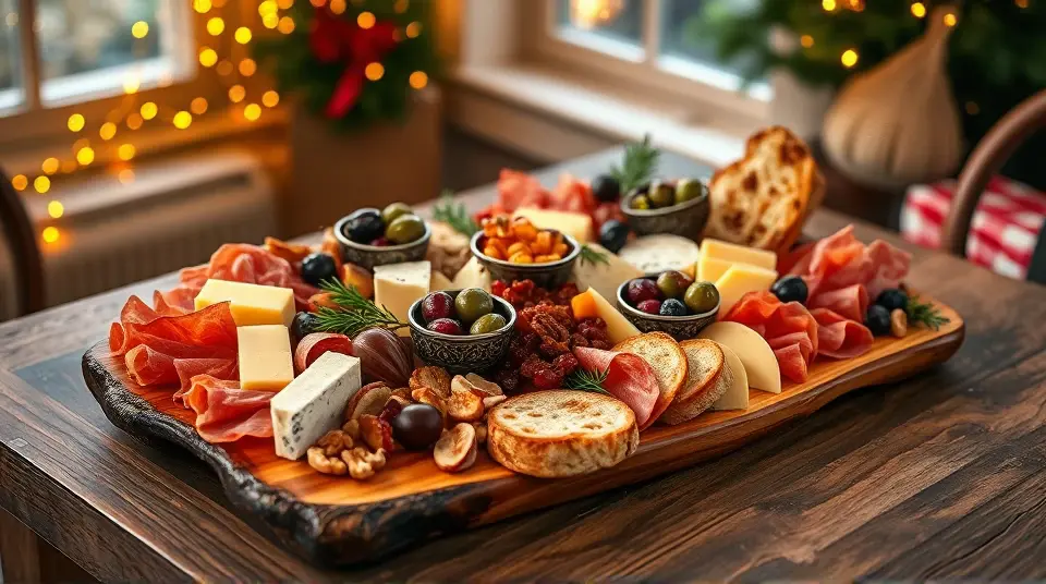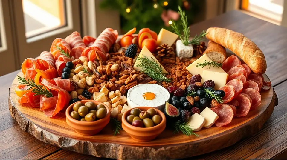 This festive platter is a delightful combination of savory meats and artisanal cheeses, perfect for holiday gatherings. It's easy to assemble and can be customized to include your favorite ingredients. Bring a touch of elegance to your holiday celebrations with this stunning hors d'oeuvre spread that's sure to impress your family and friends!