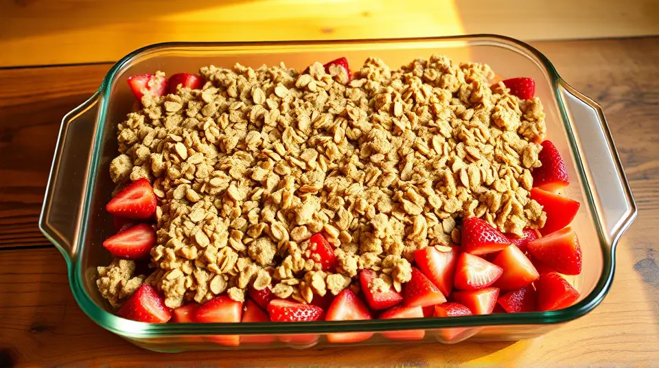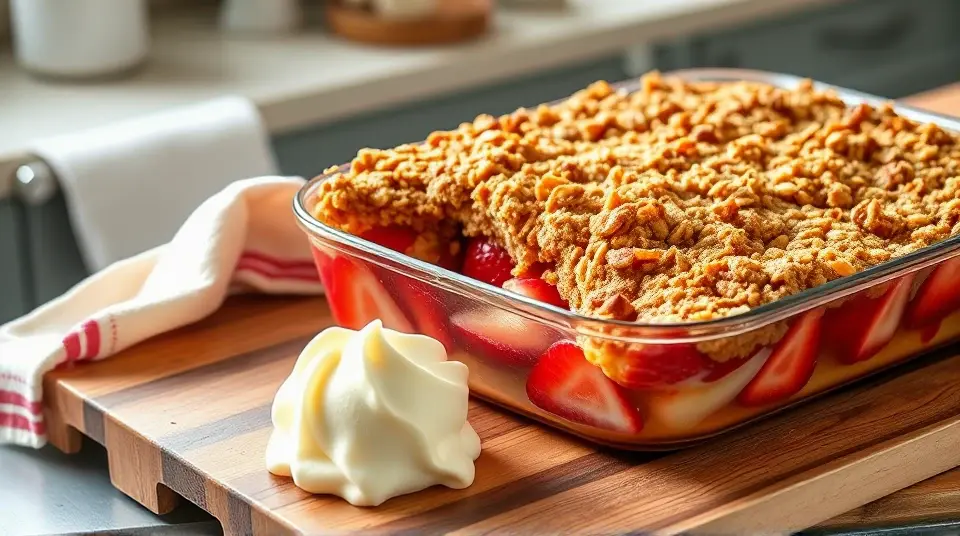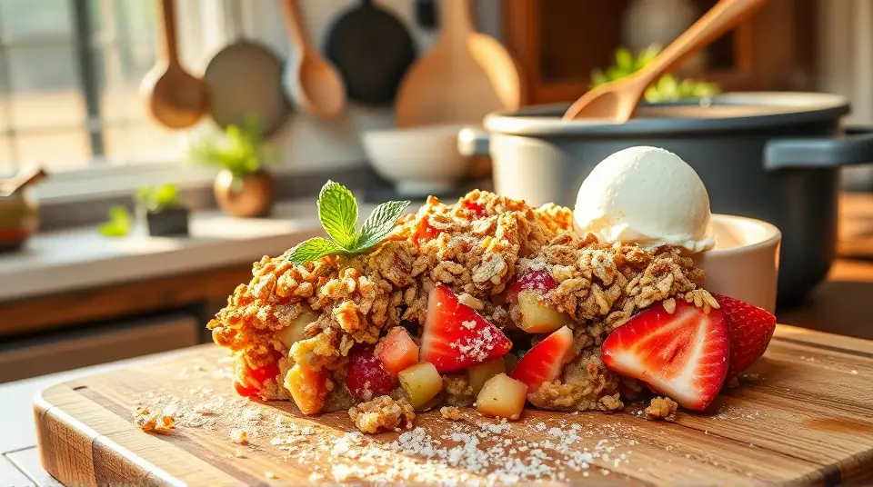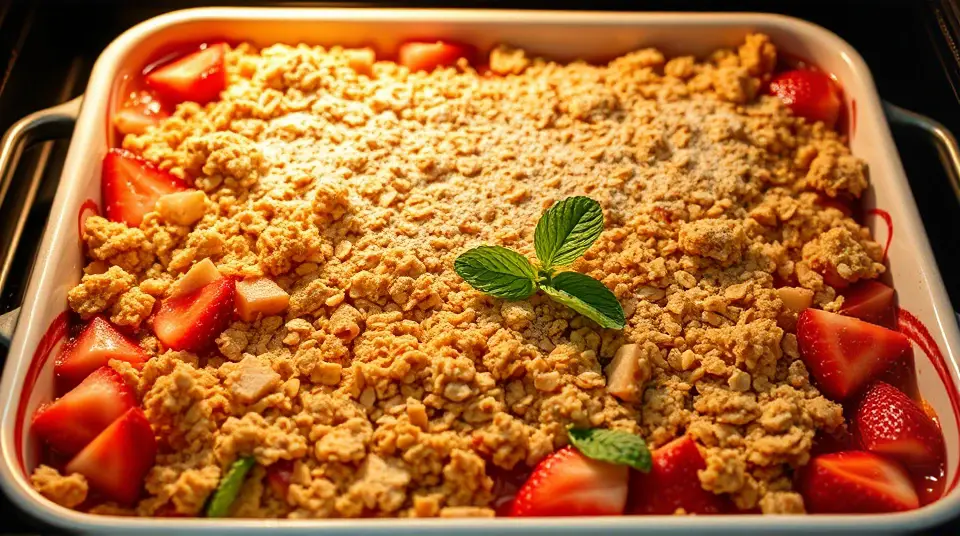 # Rhubarb Strawberry Crunch 🍓🍏 This delightful dessert combines the tartness of rhubarb with the sweetness of strawberries, all wrapped in a crispy, crumbly topping. It's perfect for spring and summer gatherings or as a cozy treat on a chilly evening. Serve it warm with a scoop of vanilla ice cream or a dollop of whipped cream for an indulgent dessert experience! 🍨✨ ## Ingredients ### For the filling - 3 cups sliced fresh strawberries - 3 cups diced rhubarb - 1 cup white sugar - 3 tablespoons all-purpose flour ### For the topping - 1 1/2 cups all-purpose flour - 1 cup packed brown sugar - 1 cup rolled oats - 1 cup butter (softened) ## Instructions 1. Preheat your oven to 375°F (190°C). 2. In a large bowl, combine the white sugar, 3 tablespoons of flour, sliced strawberries, and diced rhubarb. Mix well to coat the fruit evenly. 3. Pour the fruit mixture into a 9x13 inch baking dish, spreading it out evenly. > 🍓 To enhance the flavor of the filling, consider adding a teaspoon of vanilla extract or a sprinkle of cinnamon for a warm touch. 4. In another bowl, mix together the 1 1/2 cups of flour, brown sugar, rolled oats, and softened butter. Use a pastry blender, or your fingers, to combine until the mixture is crumbly. 5. Crumble the topping evenly over the fruit mixture in the baking dish. 6. Bake in the preheated oven for 45 minutes, or until the topping is crisp and lightly browned. > 🔥 Keep an eye on it towards the end of baking! If the topping is browning too quickly, cover it loosely with aluminum foil. ## Variations - **Seasonal twist**: Swap out the strawberries for raspberries or blueberries for a berry medley crunch! - **Nutty addition**: Stir in 1/2 cup of chopped nuts, like pecans or walnuts, into the topping for an extra crunch. - **Gluten-free**: Use a gluten-free flour blend and GF oats to make this dessert gluten-friendly. - **Reduced sugar**: Experiment with a natural sweetener or reduce the amount of sugar in the filling to let the fruit shine through. Enjoy this Rhubarb Strawberry Crunch as a crowd-pleaser at your next dinner party or family gathering! 🥳🎉Images