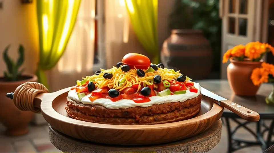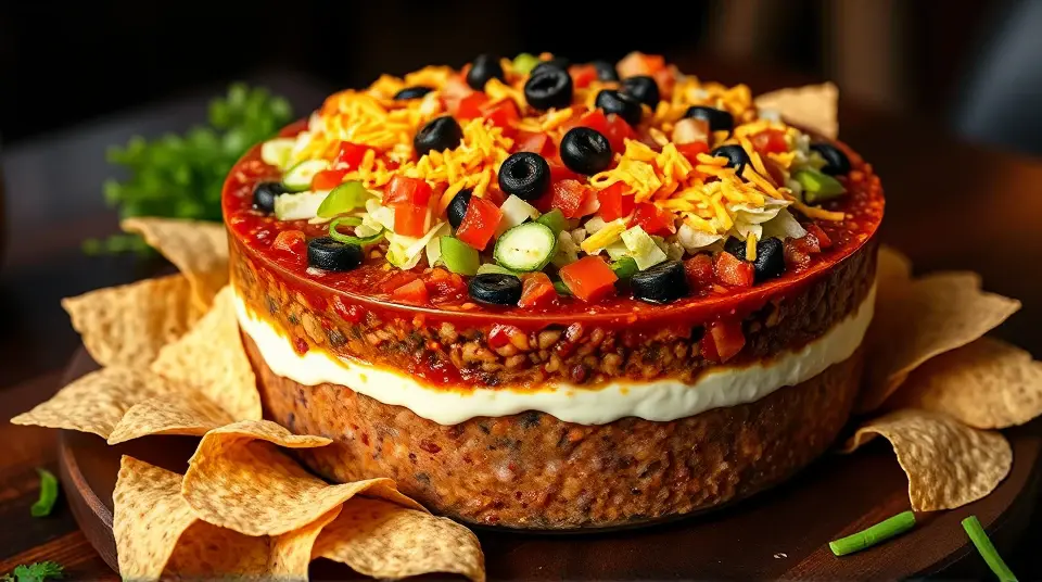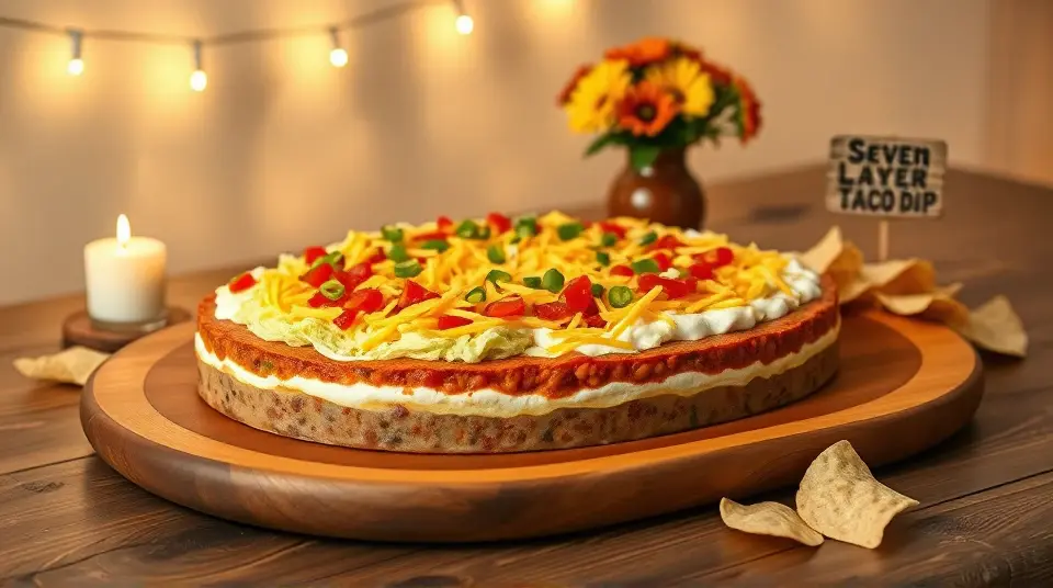 # Seven Layer Taco Dip 🌮🥑 This colorful and flavorful dip is the ultimate crowd-pleaser for any gathering! Layered with vibrant ingredients, it's perfect for game nights, potlucks, or just a cozy movie marathon at home. Each layer brings a burst of flavor that pairs beautifully with tortilla chips or fresh veggies. Get ready to impress your friends and family with this delightful dish! 🌟 ## Ingredients ### For the layered dip - 1 ounce taco seasoning mix - 16 ounces refried beans - 8 ounces cream cheese, softened - 16 ounces sour cream - 16 ounces salsa - 1 large tomato, chopped - 1 green bell pepper, chopped - 1 bunch green onions, chopped - 1 small head iceberg lettuce, shredded - 6 ounces sliced black olives, drained - 2 cups shredded Cheddar cheese ## Instructions 1. **Prepare the Beans**: - In a medium bowl, blend the taco seasoning mix with the refried beans until smooth. - Spread this mixture onto a large serving platter to form your base layer. 2. **Creamy Layer**: - In another bowl, mix the softened cream cheese with the sour cream until well combined. - Spread this delicious mixture evenly over the refried beans. 3. **Add Some Zing**: - Top the creamy layer with a generous amount of salsa, spreading it out evenly across the surface. 4. **Layer It Up**: - Add the chopped tomato, green bell pepper, green onions, and shredded lettuce in that order. - Finish with a delightful shower of Cheddar cheese and garnish with black olives. > 🥗 For added zest, consider adding sliced jalapeños or a sprinkle of hot sauce to the layers! Adjust the spice level to suit your taste. ## Tips for Serving - Serve with an assortment of tortilla chips, pita chips, or fresh veggie sticks for a fun and interactive snack experience! 🥕🍽️ - You can prepare the dip ahead of time; just cover it and refrigerate until you're ready to enjoy. This time allows the flavors to meld beautifully! ## Variations - **Bean Lovers**: Use different types of beans such as black beans or pinto beans for extra flavor and texture. - **Spicy Version**: Incorporate spicy salsa or add diced green chilies to kick up the heat. - **Healthy Twist**: Substitute Greek yogurt for sour cream for a lighter option that's still creamy! - **Vegetarian**: This recipe is already vegetarian-friendly! Add layers of chopped avocado or corn for even more freshness. Dive in and enjoy this delightful Seven Layer Taco Dip with your favorite dips! 🎉🥳Images