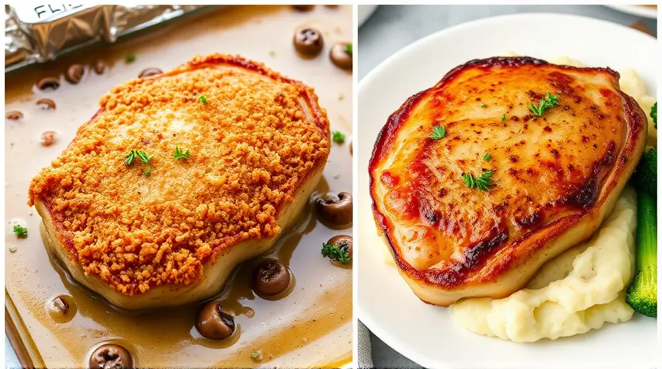 # Savory Baked Pork Chops 🍖✨ These delightful baked pork chops are a family favorite—crispy on the outside and tender on the inside! The combination of seasoned breadcrumbs and a creamy mushroom sauce creates a deliciously comforting dish that pairs perfectly with your favorite sides like mashed potatoes or steamed veggies. 🌿🥔 ## Ingredients ### For the pork chops - 6 pork chops - 1 teaspoon garlic powder - 1 teaspoon seasoning salt - 2 eggs, beaten - 1/4 cup all-purpose flour - 2 cups Italian-style seasoned bread crumbs - 4 tablespoons olive oil ### For the sauce - 1 can (10.75 ounces) condensed cream of mushroom soup - 1/2 cup milk - 1/3 cup white wine (optional) ## Instructions 1. **Preheat the Oven** Preheat your oven to 350°F (175°C). 2. **Prepare the Pork Chops** Rinse the pork chops and pat them dry. Season both sides with garlic powder and seasoning salt to taste. 3. **Breading Station** Set up your breading station: - Place the beaten eggs in a small bowl. - In another shallow dish, add the flour. - In a third bowl, pour the seasoned breadcrumbs. 4. **Coat the Chops** Dredge each pork chop lightly in flour, followed by dipping in the egg, and finally, coat generously with the breadcrumbs. > 🔥 Tip: For extra crunch, let the coated chops sit for about 10 minutes before frying. This helps the breading adhere better! 5. **Frying Time** Heat the olive oil in a medium skillet over medium-high heat. Fry the pork chops for about 5 minutes on each side or until the breading is golden brown. 6. **Baking Prep** Transfer the fried chops to a 9x13 inch baking dish and cover with foil. Bake in the preheated oven for 1 hour. 7. **Make the Sauce** While the pork chops are baking, mix together the cream of mushroom soup, milk, and white wine in a medium bowl. 8. **Final Bake** After an hour, remove the foil and pour the sauce mixture over the pork chops, then recover with foil. Bake for an additional 30 minutes. > 🍷 Wine Note: If you're not a fan of white wine, feel free to replace it with chicken broth for a different flavor profile! ## Variations - **Herbed Version**: Add fresh herbs like thyme or rosemary to the breadcrumbs for an aromatic twist. 🌱 - **Spicy Kick**: Mix some cayenne pepper into the breading for a spicy layer of flavor! 🌶️ - **Cheesy Delight**: Sprinkle some shredded cheese over the pork chops during the last 10 minutes of baking for a cheesy topping. - **Low-carb**: Substitute the breadcrumbs with crushed pork rinds for a keto-friendly option. With this savory dish, you'll have a hearty meal that's sure to impress! Enjoy! 🍽️❤️Images
