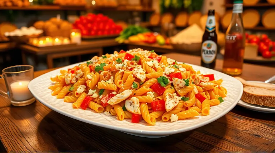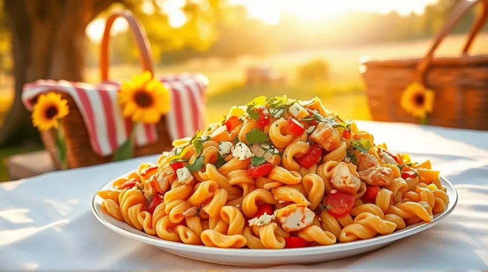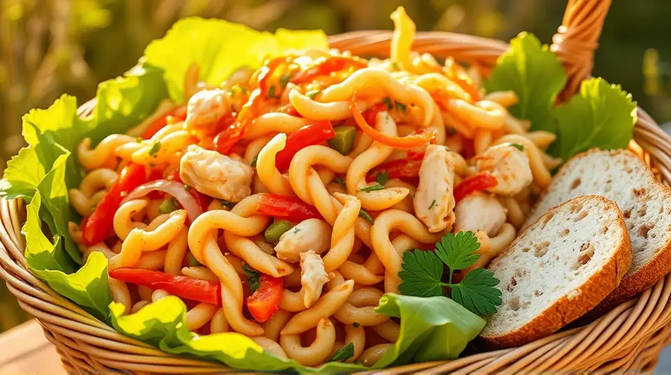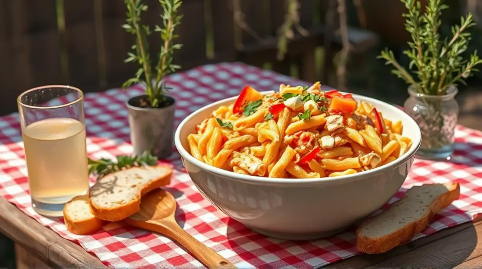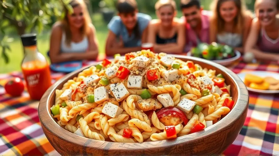 # Spicy Buffalo Chicken Pasta Salad 🌶️🍝 This vibrant and zesty pasta salad is a crowd-pleaser that's perfect for picnics, potlucks, or a fun weeknight dinner! With the bold flavors of buffalo sauce and creamy dressing, this dish is sure to be a hit. The combination of tender chicken, crunchy bell peppers, and mellow red onion creates a delightful contrast in texture. Pair it with a cold beverage for a refreshing meal! 🥤 ## Ingredients ### For the salad - 1 (16 ounce) package uncooked rotini pasta - 1 pound frozen cooked chicken strips, defrosted and diced - 1/2 cup red bell pepper, diced - 1/2 cup green bell pepper, diced - 1 cup red onion, diced ### For the dressing - 1/2 cup mayonnaise - 1 cup chunky blue cheese dressing - 1/2 cup buffalo wing sauce - 1 teaspoon salt - 1/2 teaspoon black pepper ## Instructions 1. **Cook the Pasta**: Fill a large pot with lightly salted water and bring it to a rolling boil. Stir in the rotini and cook uncovered for about 8 minutes or until the pasta is al dente. Drain well in a colander. > 🥄 To prevent the pasta from becoming mushy, avoid overcooking it. Al dente pasta will hold up better in the salad and provide the perfect bite. 2. **Make the Dressing**: In a large bowl, whisk together the mayonnaise, blue cheese dressing, buffalo wing sauce, salt, and pepper until smooth. 3. **Combine Ingredients**: Add the cooked pasta, chicken, bell peppers, and red onion to the bowl, tossing everything together until well coated. 4. **Chill**: Cover and refrigerate for at least 1 hour before serving. This allows the flavors to meld beautifully. > 🧊 For a spicier kick, you can add extra buffalo wing sauce to taste. Alternatively, for a milder version, use ranch dressing instead of blue cheese. ## Variations - **Vegetarian**: Substitute the chicken with chickpeas or your favorite plant-based protein for a satisfying meatless option. - **Creamy Avocado**: Add diced avocado for a rich, creamy texture that complements the buffalo flavors perfectly. - **Pasta Choice**: Experiment with different pasta shapes like penne or farfalle for a fun twist! - **Gluten-Free**: Use gluten-free pasta to make this dish accommodating for those with dietary restrictions. Enjoy your deliciously spicy buffalo chicken pasta salad! 🎉🥗Images