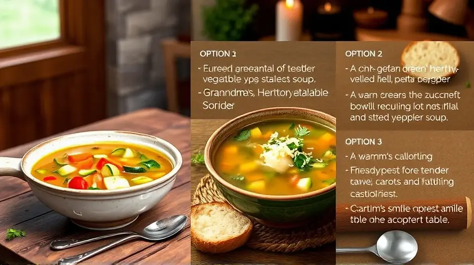 # Grandma's Hearty Vegetable Soup 🥕🍲 Warm up with this comforting vegetable soup that's both nourishing and delicious. Packed with a rainbow of veggies, it's not only a feast for the eyes but also an excellent way to get your daily nutrients. This recipe is perfect for chilly days or when you need a quick, healthy meal. Serve it with a slice of rustic bread for a cozy experience! 🍞💕 ## Ingredients ### For the soup - 2 tablespoons of olive oil - 1 onion, diced - 2 carrots, sliced - 2 celery stalks, chopped - 3 cloves of garlic, minced - 1 zucchini, diced - 1 bell pepper, chopped - 4 cups of vegetable broth - 1 can of diced tomatoes - 1 teaspoon of dried thyme - Salt and pepper to taste ### Optional toppings - Fresh parsley, chopped - Grated cheese - Croutons ## Instructions - In a large pot, heat the olive oil over medium heat. Add the onion, carrots, and celery, and sauté for about 5 minutes until they're softened. > 🔪 Sautéing the vegetables at the beginning builds a strong flavor base for the soup. Don’t rush this step; it makes a big difference! - Add the garlic, zucchini, and bell pepper to the pot, stirring for another 3-4 minutes until they become tender. - Pour in the vegetable broth and diced tomatoes. Stir in the dried thyme, and season with salt and pepper to taste. - Bring the mixture to a boil, then reduce heat and let it simmer uncovered for 20-30 minutes, allowing the flavors to meld together. > ⏳ The longer you let it simmer, the deeper the flavors become. If you have time, let it sit for an hour on low heat! - Taste and adjust seasoning if necessary. Serve hot, garnished with your choice of toppings. ## Variations - **Protein-Packed**: Add a can of drained beans (like chickpeas or kidney beans) for extra protein and fiber. - **Spicy Kick**: Incorporate some red pepper flakes or a diced jalapeño for a little heat! - **Creamy Version**: Stir in a splash of coconut milk or a dollop of sour cream for a creamy texture. - **Seasonal Veggies**: Feel free to substitute with whatever vegetables you have on hand, like kale, spinach, or sweet potatoes! Enjoy your homemade soup, and remember, cooking is all about experimenting and finding what you love! 🍽️✨Images