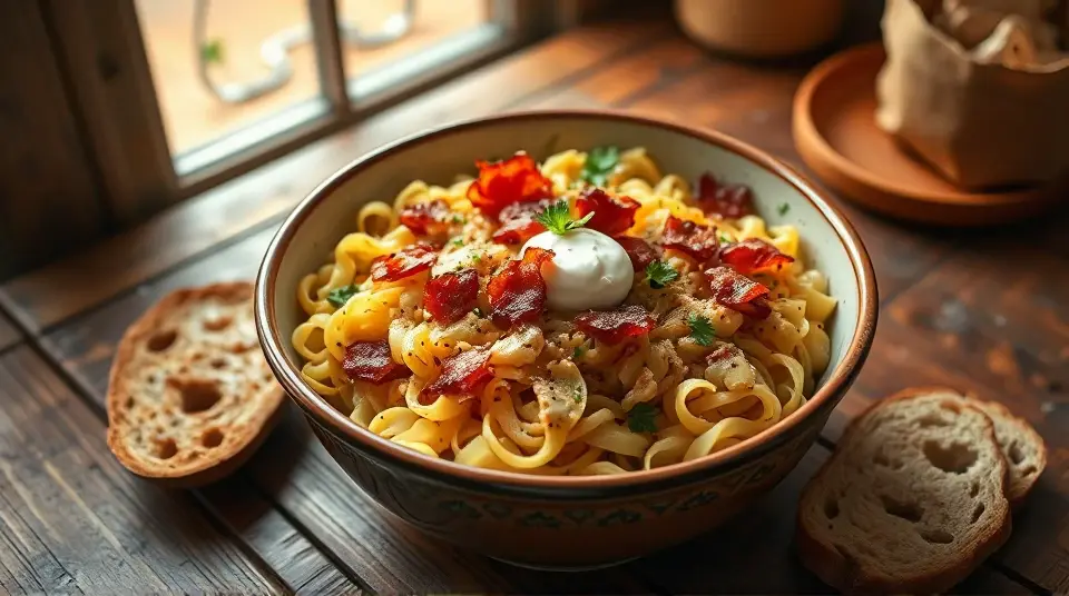 # Quick and Easy Halushki 🥓🍜 This comforting dish combines crispy bacon, tender cabbage, and hearty egg noodles for a satisfying meal that's perfect for any night of the week. It's a hearty recipe that's not just filling but also packed with flavor, making it a family favorite! Pair it with a side salad or some crusty bread for a complete dinner. 🥗🍞 ## Ingredients ### Main Ingredients - 1 pound of bacon, snipped into small pieces - 1 onion, diced - 1 (16-ounce) package of egg noodles - 1 head of cabbage, sliced - Salt and ground black pepper, to taste ## Instructions 1. **Sizzle the Bacon**: In a large skillet, cook the snipped bacon over medium heat until crisp, stirring often (about 10 minutes). 2. **Add the Onion**: Once the bacon is cooked, stir in the diced onion and continue cooking until the onion is translucent (about 5 more minutes). Set the bacon and onion mixture aside, leaving the drippings in the skillet. 3. **Cook the Noodles**: In a large pot, bring lightly salted water to a boil. Add the egg noodles and cook, stirring occasionally, until they're firm to the bite (about 5 minutes). Drain the noodles and set aside. 4. **Combine Ingredients**: Return the bacon and onion mixture to the pot, along with the cabbage. Stir until the cabbage is coated in bacon drippings. Cover the pot and cook until the cabbage is tender (10 to 12 minutes), stirring occasionally. 5. **Mix in the Noodles**: Gently stir the cooked noodles into the cabbage mixture. Season with salt and black pepper to taste. > 🌟 Feel free to adjust the seasoning to your liking! You can add some garlic or a pinch of red pepper flakes for an extra kick. ## Tips & Tricks - **Cabbage Options**: Savoy or napa cabbage can be used for a milder flavor and softer texture. - **Protein Boost**: If you'd like to add some extra protein, consider incorporating cooked chicken or sausage into the mix! - **Leftovers**: This dish can be stored in the refrigerator for a few days. Simply reheat it on the stovetop or in the microwave. ## Variations - **Vegetarian**: Omit the bacon and use olive oil or plant-based butter for sautéing the onions and cabbage. Add in your favorite vegetables for extra texture and taste! 🥕🌽 - **Creamy Version**: Stir in a dollop of sour cream or a splash of cream just before serving for a richer taste. - **Spicy Twist**: Toss in some chopped jalapeños or your favorite hot sauce to elevate the flavor profile! Enjoy your delicious homemade Halushki! 🍽️✨Images