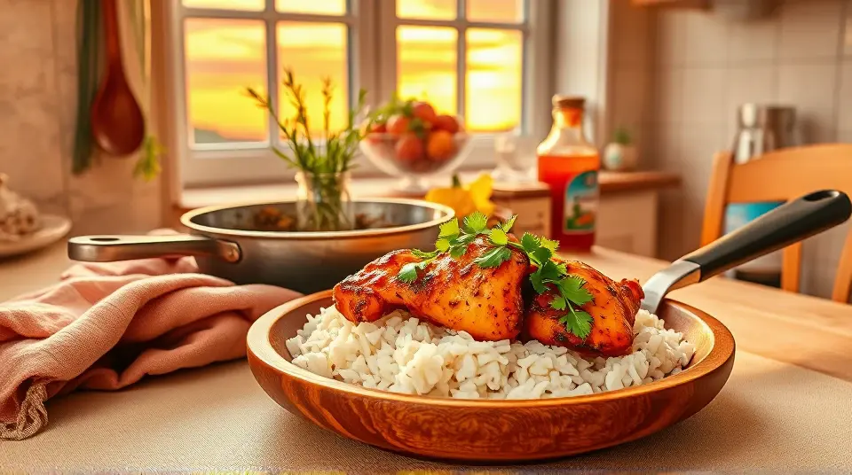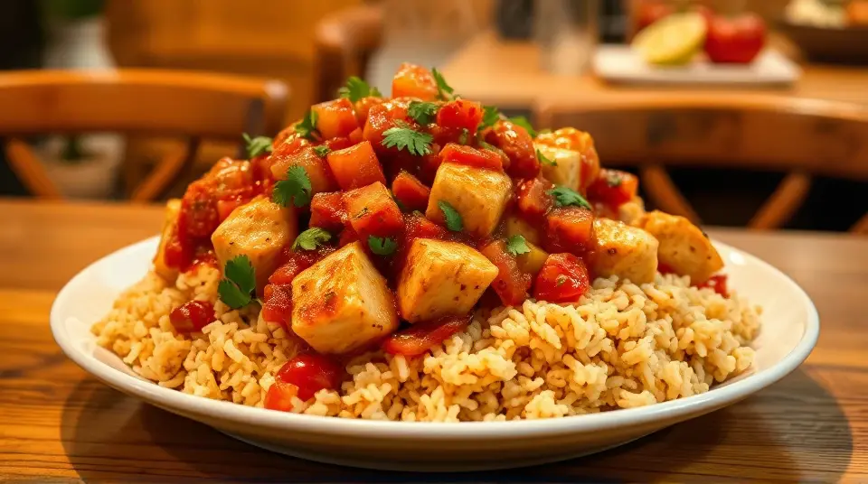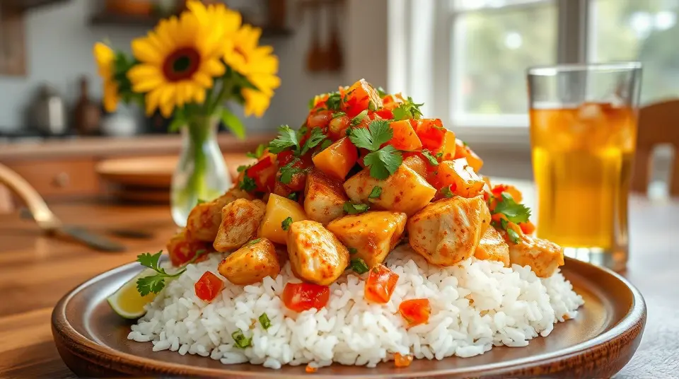 # Sweet and Spicy Chicken over Rice 🌶️🍚 This vibrant dish combines the heat of taco seasoning with the sweetness of peach preserves, making it a delightful meal perfect for busy weeknights or family gatherings. The juicy chicken and flavorful salsa come together beautifully over a bed of rice, creating a satisfying and delicious experience. Consider serving it with a side of steamed vegetables or a fresh salad for a well-rounded meal! 🥗✨ ## Ingredients ### For the chicken - 1 pound chicken breast, cut into 1-inch cubes - 3 teaspoons taco seasoning - 2 teaspoons oil (for frying) ### For the sauce - 11 ounces chunky salsa - 1/2 cup peach preserves ### For serving - Cooked rice ## Instructions 1. In a resealable bag, toss the chicken cubes with the taco seasoning until evenly coated. > 🥡 This method helps ensure that each piece of chicken is well seasoned. If you have time, marinate the chicken for 30 minutes to enhance the flavor even more! 2. Heat oil in a pan over medium-high heat. Add the chicken and brown until no longer pink, about 5-7 minutes. > 🔥 Make sure not to overcrowd the pan; you may need to do this in batches. Browning the chicken creates a nice sear, adding depth to the flavor. 3. In a separate bowl, combine the chunky salsa and peach preserves. Add this mixture to the pan once the chicken is cooked. 4. Reduce the heat to low, cover, and let it simmer for 2-5 minutes to meld the flavors. > 🍑 Feel free to adjust the sweetness by adding more or less peach preserves depending on your taste! 5. Serve the sweet and spicy chicken over the cooked rice. > 🍽️ For an extra kick, top with sliced jalapeños or a sprinkle of cilantro! ## Variations - **Spicy**: Add diced jalapeños or hot sauce to the salsa for more heat. 🌶️🔥 - **Sweet and savory**: Substitute peach preserves with mango or apricot jam for a different flavor profile. - **Vegetarian**: Replace chicken with hearty vegetables like zucchini and bell peppers or use plant-based protein for a lighter dish. - **Meal prep**: Make a larger batch and store leftovers in the fridge for easy lunches throughout the week! Enjoy your cooking adventure with this easy and flavorful recipe! 🎉Images