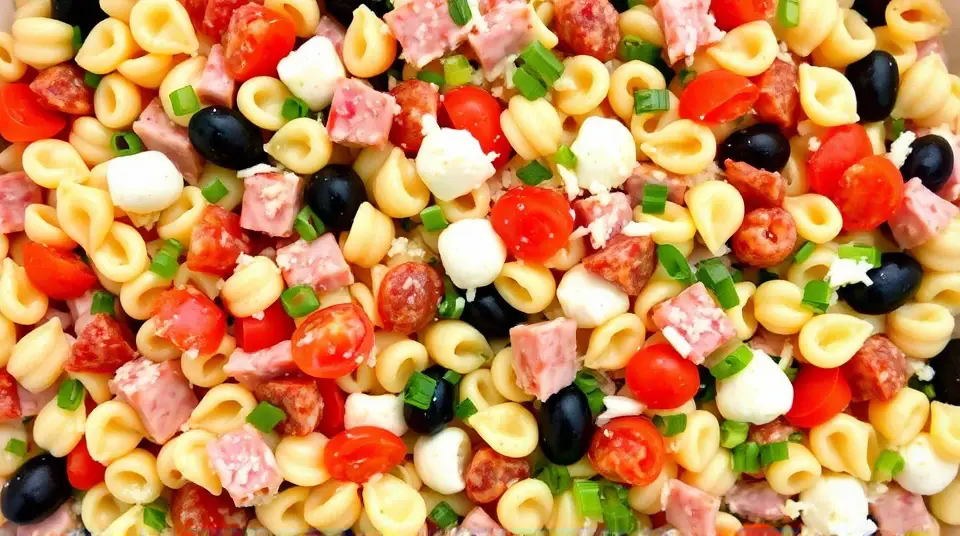 - Combine the Ingredients: In a large bowl, mix the cooled pasta with black olives, tomatoes, pepperoni, green olives, green onions, and chopped ham or turkey.