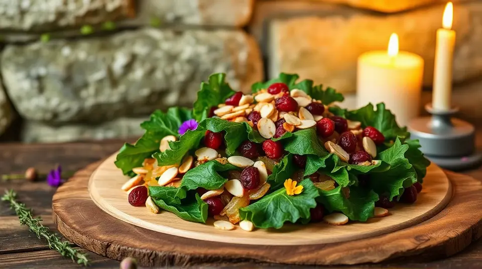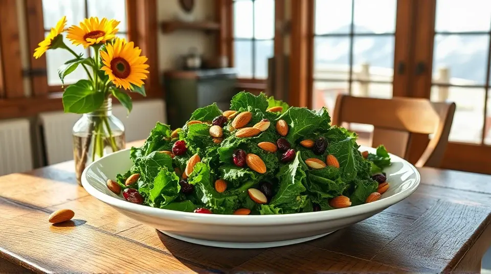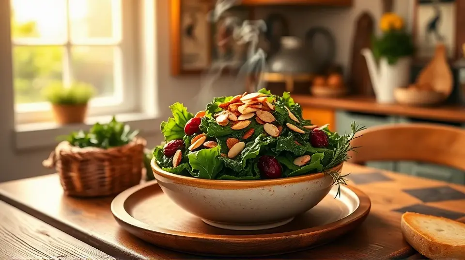 # Sweet and Savory Kale Delight 🥬✨ This vibrant dish combines the earthiness of kale with a touch of sweetness from cranberries and sugar, making it both healthy and delightful! Perfect as a side dish or a light main course, it’s great for impressing guests or simply enjoying on a cozy night in. Plus, the crunch of almonds adds an irresistible texture! ## Ingredients ### For the sauté - 2 tablespoons olive oil - 1 small onion, diced - 2 cloves garlic, minced ### For the sauce - 1 tablespoon Dijon mustard - 4 teaspoons white sugar - 1 tablespoon cider vinegar - 1 1/2 cups chicken broth (or vegetable broth for a vegetarian option) ### For the kale - 4 cups stemmed, torn, and rinsed kale - 1/4 cup dried cranberries - Salt and pepper to taste - 1/4 cup sliced almonds ## Instructions 1. In a large pot, heat the olive oil over medium heat. Add the diced onion and minced garlic, cooking until the onion softens and turns translucent (about 5 minutes). > 🔥 Make sure to stir occasionally to prevent the garlic from burning, as it can become bitter if overcooked. 2. Stir in the Dijon mustard, white sugar, cider vinegar, and chicken broth. Bring to a boil over high heat. 3. Add the kale to the pot, cover, and let it cook for about 5 minutes until wilted. 4. Mix in the dried cranberries, then continue to boil uncovered until the liquid has reduced by about half and the cranberries have softened (approximately 15 minutes). 5. Season to taste with salt and pepper, and sprinkle with sliced almonds before serving. > 🌿 For a pop of color, feel free to toss in other veggies like bell peppers or carrots along with the kale! ## Variations - **Vegan**: Substitute chicken broth with vegetable broth for a completely plant-based dish. - **Nut-free**: Omit the sliced almonds or replace them with pumpkin seeds for a crunchy texture without nuts. - **Spicy Kick**: Add a pinch of red pepper flakes while sautéing the onions for added heat. - **Extra Flavor**: Consider adding a splash of soy sauce or balsamic vinegar for a tangy twist! Enjoy your healthy and delicious Sweet and Savory Kale Delight as a side or main dish! 🌟🥗Images