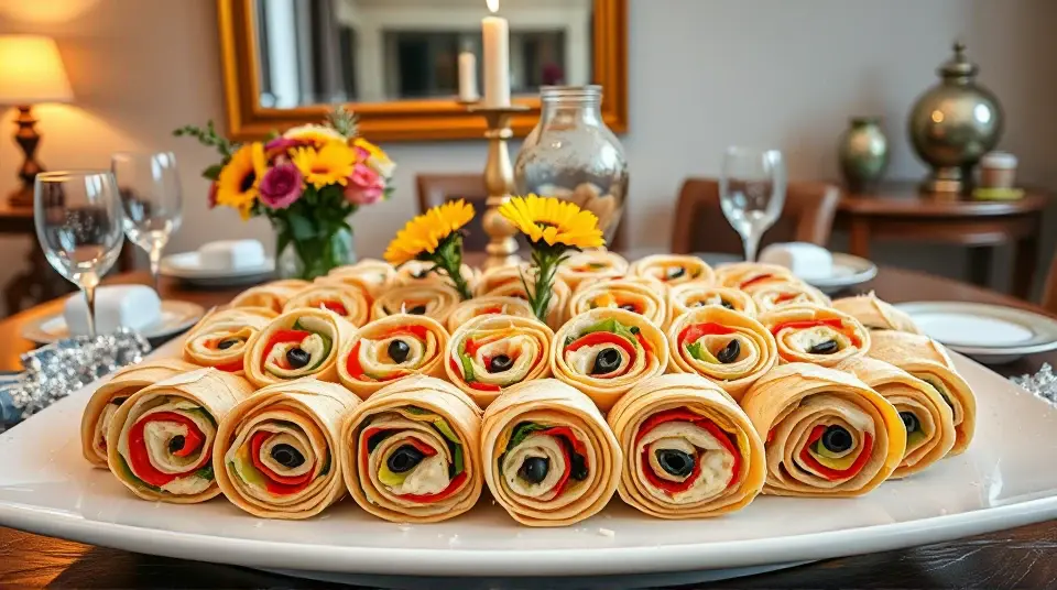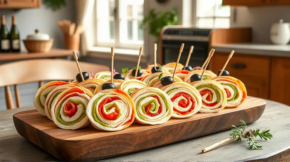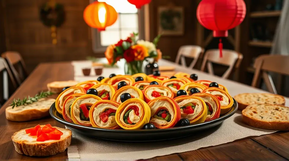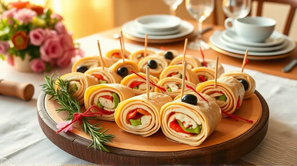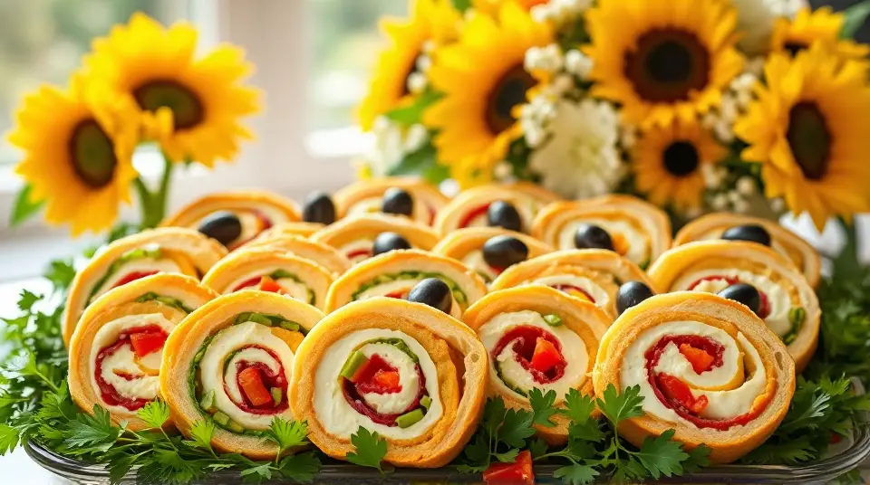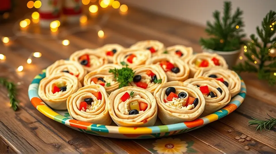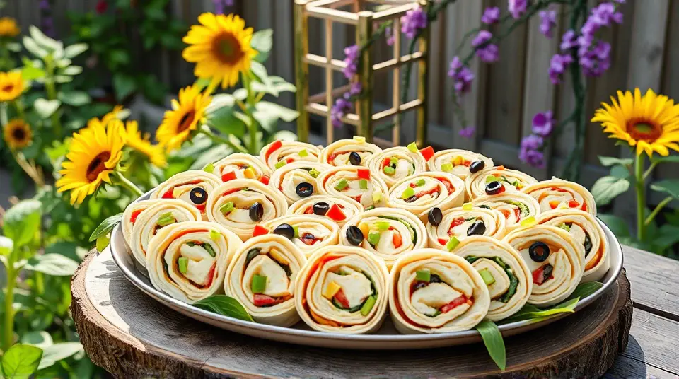 # Festive Party Pinwheels 🌯🎉 These colorful and flavorful party pinwheels are perfect for gatherings, game nights, or as a fun snack for your family. With a creamy center and fresh fillings, these bite-sized delights are sure to please a crowd. Plus, they can be made ahead of time and stored in the refrigerator, making them a convenient option for busy days! ## Ingredients ### For the filling - 2 packages (8 ounces each) cream cheese, softened - 1 package (1 ounce) ranch dressing mix - 2 green onions, minced ### For assembly - 4 large flour tortillas (12-inch) - 1/2 cup red bell pepper, diced - 1/2 cup celery, diced - 1 can (2 ounces) sliced black olives, drained - 1/2 cup shredded cheese of your choice (optional) ## Instructions 1. In a medium mixing bowl, combine the softened cream cheese, ranch dressing mix, and minced green onions. Mix well until smooth and creamy. > 🎈 *Tip: To make mixing easier, let the cream cheese sit at room temperature for about 30 minutes before using.* 2. Spread the cream cheese mixture evenly over each tortilla. 3. Sprinkle the diced red pepper, celery, black olives, and shredded cheese (if using) over the cream cheese layer. 4. Roll up each tortilla tightly, starting from one end to the other. 5. Wrap the rolled tortillas tightly in aluminum foil or plastic wrap, then refrigerate for at least 2 hours or overnight. 6. Once chilled, trim the ends, and slice each roll into 1-inch thick pieces. > 🍽️ *Serving suggestion: Arrange pinwheels on a platter and garnish with extra diced bell peppers or olives for a colorful display.* ## Variations - **Spicy twist**: Add diced jalapeños or a splash of hot sauce to the cream cheese mixture for a little kick! 🌶️ - **Herbaceous touch**: Mix in fresh herbs like dill or parsley for added flavor and freshness. - **Wrap it up**: Try using spinach or tomato tortillas for a vibrant look and different taste. - **Meaty option**: Incorporate sliced turkey or ham into the filling for a heartier snack. These delightful pinwheels are not only quick to prepare but also versatile and delicious! Enjoy these at your next celebration or gathering!Images