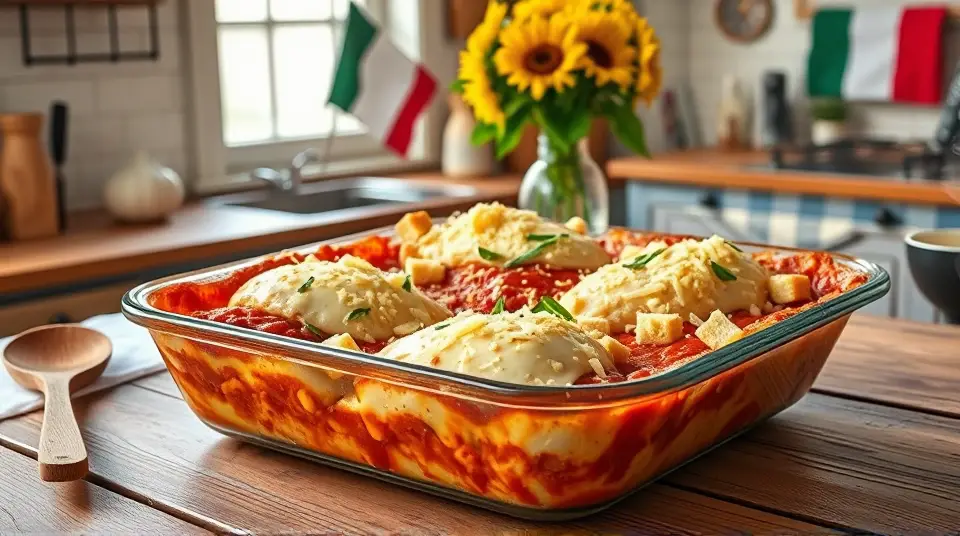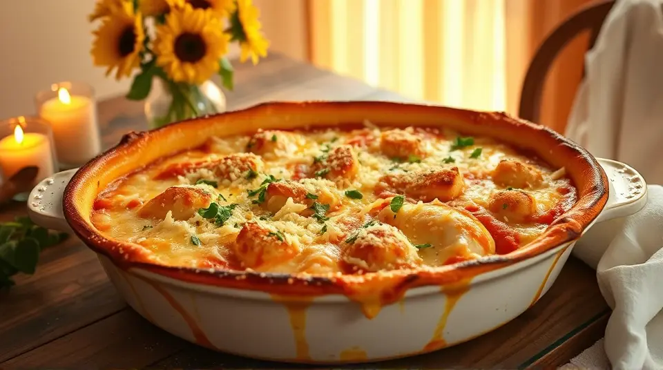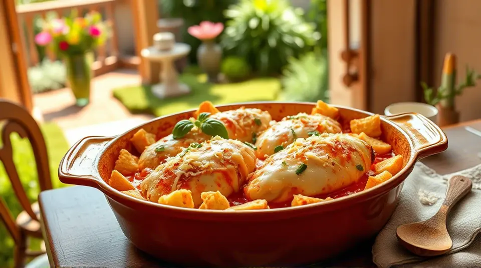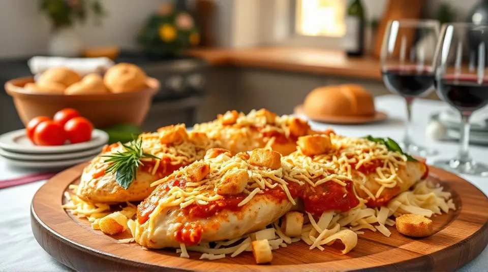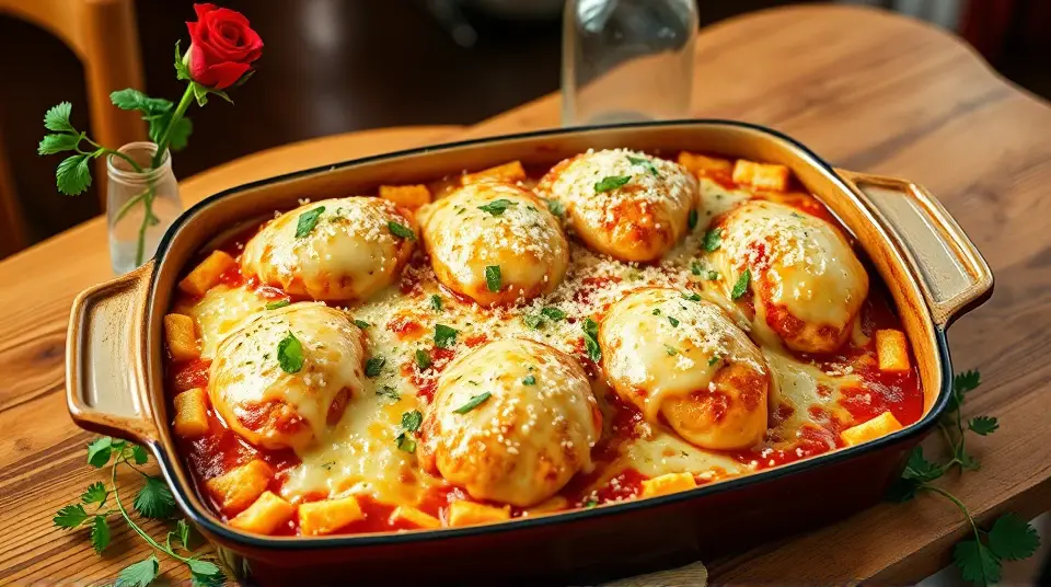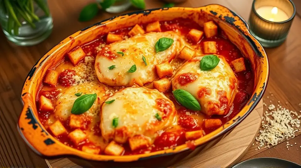 # Cheesy Parmesan Chicken Bake 🍗🧀 Looking for a comforting and satisfying dish? This Cheesy Parmesan Chicken Bake is a family favorite that's easy to prepare and packed with flavor! With juicy chicken, tangy marinara, and a melty cheese topping, it's perfect for a weeknight dinner or a gathering with loved ones. Serve it with a fresh salad or crusty bread for a complete meal! 🥗🍞 ## Ingredients ### For the bake - 2 tablespoons olive oil - 2 cloves garlic, crushed and finely chopped - 1/4 teaspoon crushed red pepper flakes (adjust to taste) - 6 skinless, boneless chicken breast halves - 2 cups marinara sauce - 1/4 cup fresh basil, chopped - 1 (8-ounce) package shredded mozzarella cheese, divided - 1/2 cup grated Parmesan cheese, divided - 1 (5-ounce) package garlic croutons ## Instructions 1. Preheat your oven to 350°F (175°C). 2. Coat the bottom of a 9x13 inch casserole dish with olive oil. Sprinkle the crushed garlic and red pepper flakes evenly over the oil. > 🥘 This aromatic base enhances the dish's flavor, so don't skip this step! 3. Arrange the chicken breasts in the dish, ensuring they fit snugly. Pour the marinara sauce generously over the chicken. 4. Sprinkle chopped basil over the sauce, then add half of the shredded mozzarella and half of the grated Parmesan on top. 5. Spread the croutons over the cheese layer and finish with the remaining mozzarella and Parmesan. 6. Bake in the preheated oven until the cheese is golden brown and bubbly, and the chicken is cooked through (about 35 minutes to 1 hour). Use an instant-read thermometer to ensure the thickest part of the chicken reads at least 160°F (70°C). > 🍽️ Letting the bake sit for a few minutes before serving allows the flavors to meld beautifully. ## Serving Suggestions Pair this dish with a side of spaghetti, a garden salad, or some roasted vegetables for added color and nutrition. ## Variations - **Healthier**: Swap out the croutons for whole-grain breadcrumbs or skip them entirely for a lighter option. - **Spicy**: If you like heat, add more crushed red pepper flakes or a splash of hot sauce into the marinara. - **Herb-infused**: Experiment with other herbs, like oregano or thyme, to give this dish a different flavor profile. - **Make it vegetarian**: Replace the chicken with slices of eggplant or zucchini, and use a plant-based cheese for a delicious vegetarian alternative. Your kitchen will smell amazing, and your family won't be able to resist this cheesy masterpiece! Enjoy! 😋🥳Images