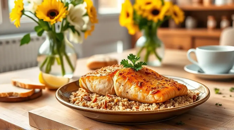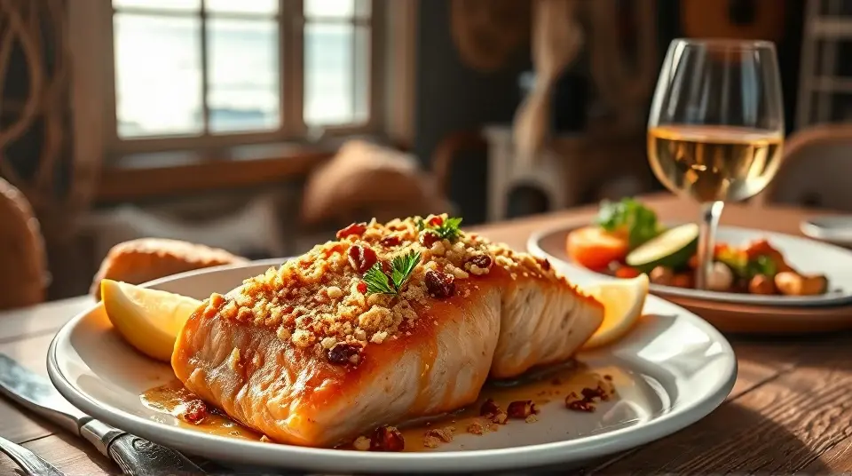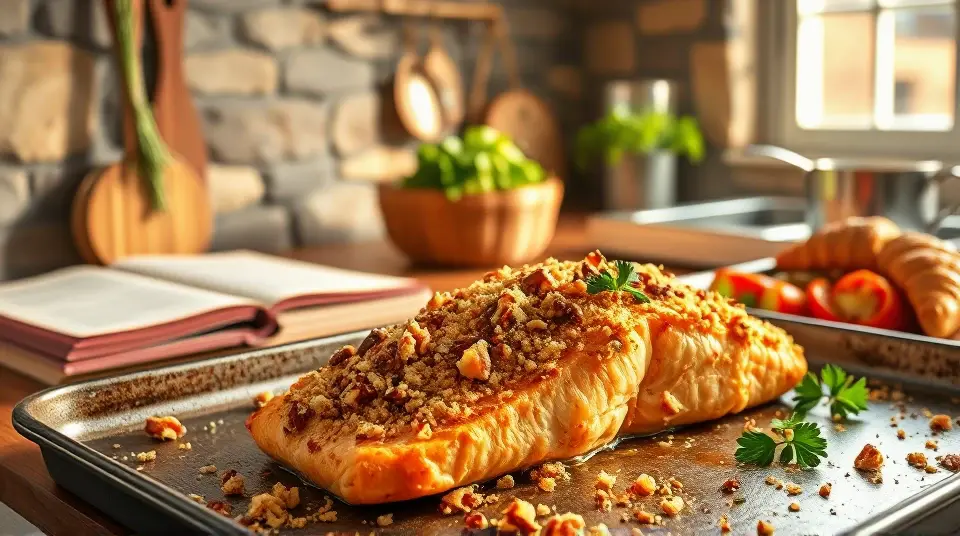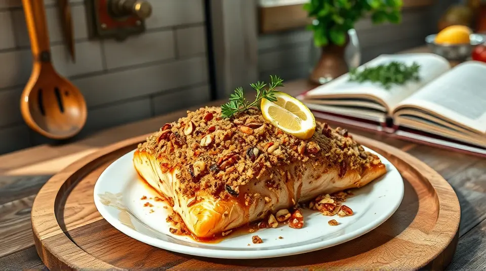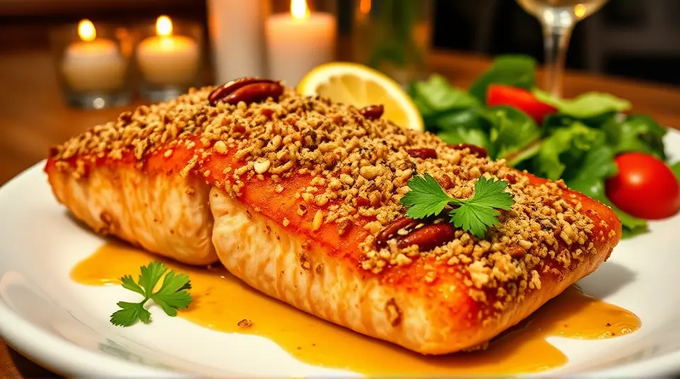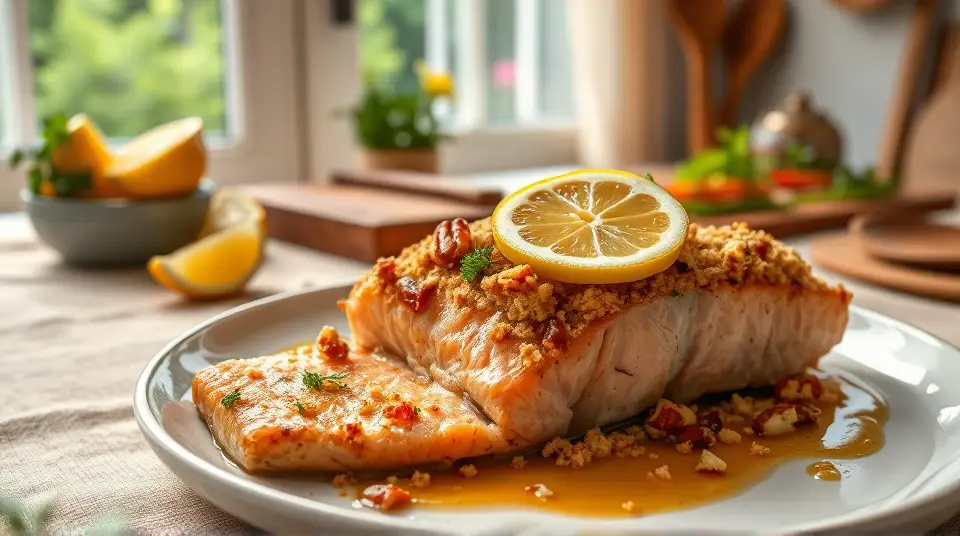 # Baked Dijon Salmon π£π This delectable Baked Dijon Salmon recipe combines the rich flavors of salmon with a tangy honey mustard glaze, topped with a crunchy pecan and breadcrumb mixture. Itβs not just nutritious but also a delightful feast for your taste buds, perfect for weeknight dinners or entertaining guests! Pair it with a side of roasted vegetables or a fresh salad for a complete meal. ## Ingredients ### For the salmon - 1/4 cup melted butter - 3 tablespoons Dijon mustard - 1 1/2 tablespoons honey - 4 (4-ounce) salmon fillets - Salt and pepper to taste - 1 lemon, cut into wedges for garnish ### For the topping - 1/4 cup dry bread crumbs - 1/4 cup finely chopped pecans - 4 teaspoons chopped fresh parsley ## Instructions 1. Preheat your oven to 400Β°F (200Β°C). 2. In a small bowl, whisk together the melted butter, Dijon mustard, and honey until well combined. Set aside this sweet and tangy mixture. 3. In another bowl, mix the bread crumbs, chopped pecans, and parsley. This will create a crunchy topping that adds great flavor and texture. 4. Brush each salmon fillet lightly with the honey mustard mixture, ensuring each piece is well-coated. Then, sprinkle the breadcrumb mixture on top of the salmon. > π£ Salmon is a great source of omega-3 fatty acids, which are beneficial for heart health. If you have fresh herbs available, feel free to use them for an extra burst of flavor! 5. Place the salmon fillets on a baking sheet lined with parchment paper or a greased baking dish. Bake in the preheated oven for 12 to 15 minutes, or until the salmon flakes easily with a fork. 6. Once done, season with salt and pepper to taste, and serve garnished with lemon wedges to add a zesty finish. > π½οΈ For crispier topping, consider broiling the salmon for the last couple of minutes of cooking. Just keep a close eye on it to avoid burning! ## Variations - **Herbaceous Twist**: Add some freshly chopped dill or thyme into the breadcrumb mixture for an herbal flavor that complements the salmon perfectly. πΏ - **Spicy Kick**: Mix a pinch of cayenne pepper or crushed red pepper flakes into the honey mustard glaze for a delightful heat. - **Nut-Free**: Substitute breadcrumbs with crushed cornflakes or oats if you need a nut-free topping alternative. - **Vegetarian Option**: Try this same topping with thick slices of eggplant or portobello mushrooms as a delicious vegetarian main dish! Enjoy your scrumptious Baked Dijon Salmon that brings together convenient preparation and flavorful delight in every bite! π₯π₯Images