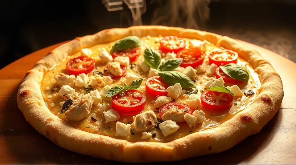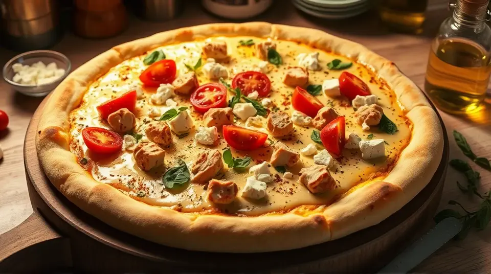 # Gourmet White Pizza 🍕✨ This gourmet white pizza is a delightful fusion of flavors that’s sure to impress anyone at your table! With a creamy Alfredo base, juicy chicken, and tangy feta cheese, this pizza is a standout recipe for family dinners or casual gatherings. Serve it with a side salad for a complete meal! ## Ingredients ### For the sauce - 2 tablespoons melted butter - 1 tablespoon olive oil - 3 tablespoons minced garlic - 2 tablespoons sun-dried tomato pesto - 1 teaspoon dried basil - 1 teaspoon dried oregano - 1 tablespoon grated Parmesan cheese - 1 cup Alfredo sauce ### For the toppings - 2 cups chopped cooked chicken breast meat - 1 (12 inch) pre-baked pizza crust - 1 medium tomato, sliced - 1 (4 ounce) package feta cheese ## Instructions 1. Preheat your oven to 375°F (190°C). 2. In a small bowl, mix together the melted butter, olive oil, minced garlic, sun-dried tomato pesto, dried basil, dried oregano, grated Parmesan cheese, and Alfredo sauce. 3. Arrange the chopped chicken evenly over the pre-baked pizza crust. 4. Pour the Alfredo sauce mixture evenly over the chicken, ensuring it’s well covered. 5. Top with slices of tomato and crumbled feta cheese. 6. Bake in the preheated oven for 10 to 15 minutes, or until the crust is lightly browned and the toppings are toasted. 7. Cut into wedges, serve warm, and enjoy! > 🍽️ For an extra touch, add a sprinkle of fresh herbs like basil or parsley on top before serving. For those who love a bit of heat, consider adding some red pepper flakes! ## Variations - **Veggie Delight**: Skip the chicken and add your favorite vegetables such as spinach, mushrooms, or bell peppers for a delicious vegetarian pizza. - **Extra Cheesy**: Mix in a blend of mozzarella and ricotta with the Alfredo sauce for an irresistibly cheesy experience! 🧀 - **Spicy Kick**: Add some sliced jalapeños or spicy sausage to add some flavor and heat to your meal. - **Low-carb**: Swap the pizza crust for a cauliflower crust or eggplant slices for a low-carb option. With its creamy texture and flavorful toppings, this gourmet white pizza recipe is guaranteed to become a new favorite! Enjoy your pizza night! 🍕❤️Images