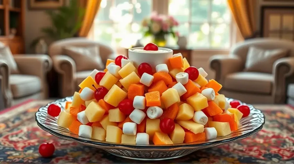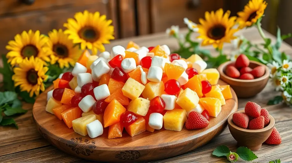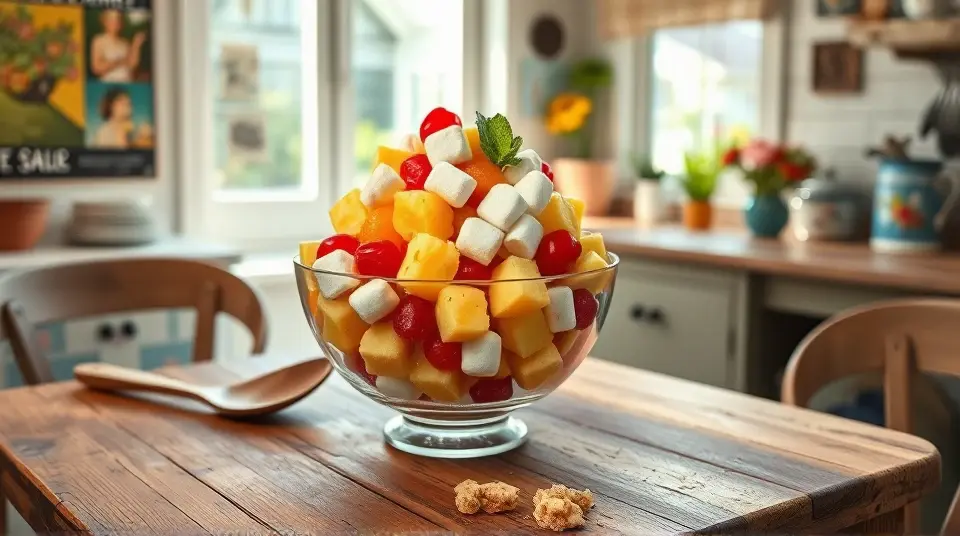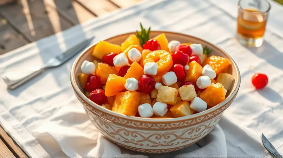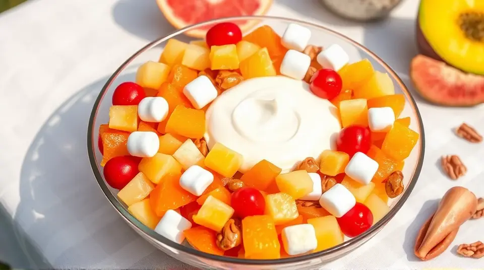 # Refreshing Fruit Salad 🍍🍊🍒 This delightful fruit salad is a colorful blend of flavors and textures, making it a perfect side dish for gatherings or a light dessert. It's simple to prepare and can be customized to include your favorite fruits! The creamy dressing adds a touch of sweetness that pairs wonderfully with the juicy fruits. Enjoy it chilled for a refreshing treat on warm days! 🍽️✨ ## Ingredients ### For the salad - 1 can of pineapple chunks, drained - 2 cans of mandarin oranges, drained - 1 jar of maraschino cherries, halved - 1 package of miniature marshmallows ### For the dressing - 1 container of sour cream ## Instructions 1. In a large bowl, combine the pineapple, mandarin oranges, cherries, and marshmallows. > 🍴 Mixing fruits right after draining prevents excess liquid from making the salad too watery. 2. Gently fold in the sour cream until all the fruits are coated. > 🎉 You can use yogurt in place of sour cream for a tangy twist or to reduce calories. 3. Cover and chill for at least an hour before serving to meld the flavors. ## Variations - **Tropical Twist**: Add diced mango or kiwi for an exotic flair! 🥭 - **Nuts About It**: Sprinkle in some chopped pecans or walnuts for added crunch and protein. 🌰 - **Berry Good**: Include strawberries or blueberries for a pop of color and additional flavor. 🍓 - **Sweetness Level**: If you like it a bit sweeter, drizzle with honey or maple syrup to taste. > 🌈 Feel free to get creative! This recipe is flexible and can adapt to whatever fruits are in season or what you have on hand.Images
