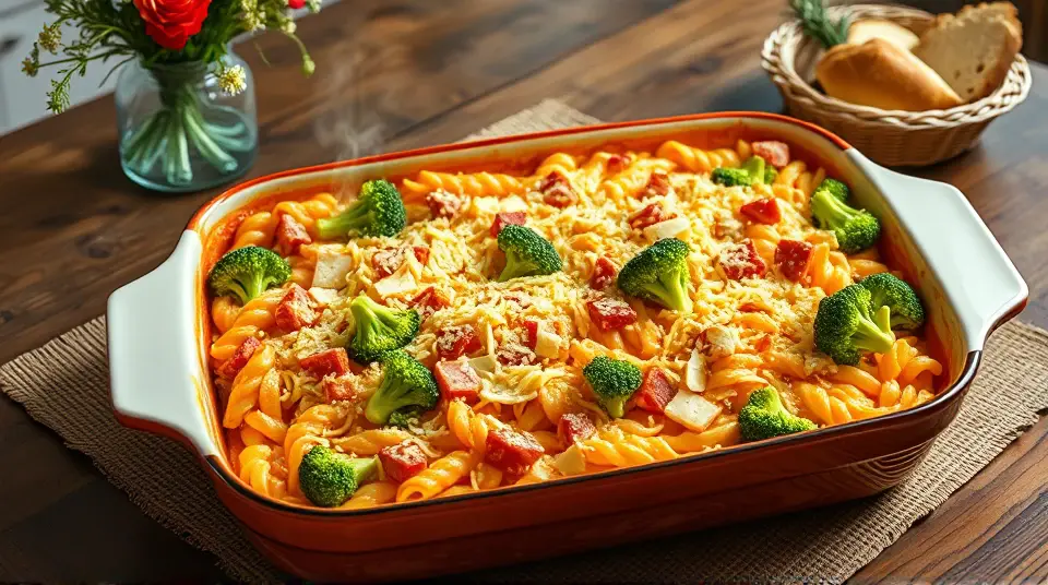 # Cheesy Ham and Broccoli Bake 🥦🧀 This hearty and comforting casserole is a family favorite, bringing together the savory goodness of ham, the vibrant crunch of broccoli, and creamy Alfredo sauce, all topped with gooey melted cheese. It's the perfect dish for a busy weeknight dinner or a cozy weekend gathering! Pair it with a crisp garden salad for a well-rounded meal. ## Ingredients ### For the bake - 14 ounces whole wheat rotini pasta - 1 (10 ounce) package frozen broccoli - 1 tablespoon olive oil - 2 cups diced fully cooked ham - 1 (15 ounce) jar Alfredo sauce - 1/2 cup milk - Ground black pepper, to taste - 1 cup shredded Colby-Monterey Jack cheese ## Instructions 1. Preheat your oven to 350°F (175°C). Grease a 9x13-inch baking dish to ensure the casserole doesn't stick. 2. Bring a large pot of lightly salted water to a boil. Cook the rotini pasta in the boiling water, stirring occasionally, until tender but firm (about 10 minutes). Drain and set aside. > 🔥 Cooking the pasta al dente ensures it holds up well in the bake and doesn't get mushy in the oven! 3. Thaw the broccoli in the microwave until it's soft enough to break apart into small pieces. 4. In a large skillet, heat the olive oil over medium heat. Cook the diced ham in the hot oil until the edges start to brown (about 10 minutes). Add the broccoli and stir until any excess water has evaporated and both the ham and broccoli are hot. 5. Pour in the Alfredo sauce and milk, stirring to combine. Season with ground black pepper to taste. Gently fold in the cooked pasta until everything is well-coated with the sauce. 6. Transfer the bubbling pasta mixture into the prepared baking dish. Top with the shredded Colby-Monterey Jack cheese. 7. Bake in the preheated oven until the casserole is hot and the cheese is melted and bubbling, approximately 30 minutes. ## Tips & Tricks > 🥄 If you prefer a bit of heat, sprinkle some red pepper flakes over the top before baking for a flavorful kick! > 🧊 For a cooler twist, you can add a handful of frozen peas along with the broccoli for added color and sweetness. ## Variations - **Vegetarian**: Swap ham for more vegetables like bell peppers, mushrooms, or zucchini for a delicious plant-based version. - **Low-carb**: Use spiralized zucchini or cauliflower rice instead of pasta for a lighter, keto-friendly dish. - **Extra cheesy**: Add a layer of mozzarella cheese in addition to Colby-Monterey Jack for a cheesier, stretchier topping. This Cheesy Ham and Broccoli Bake is sure to become a staple in your home, combining convenience and flavor with every bite! Enjoy! 🍽️✨Images