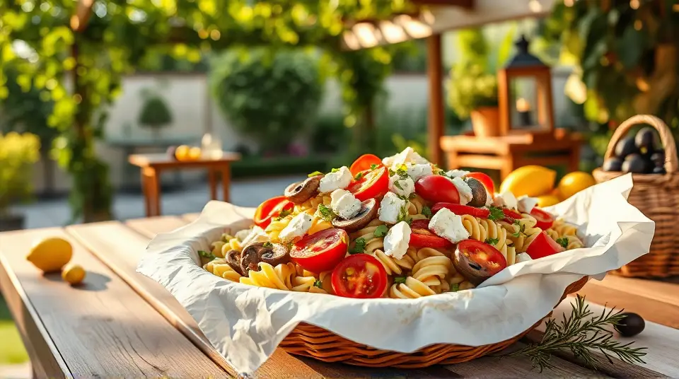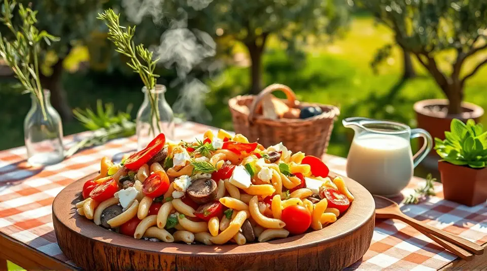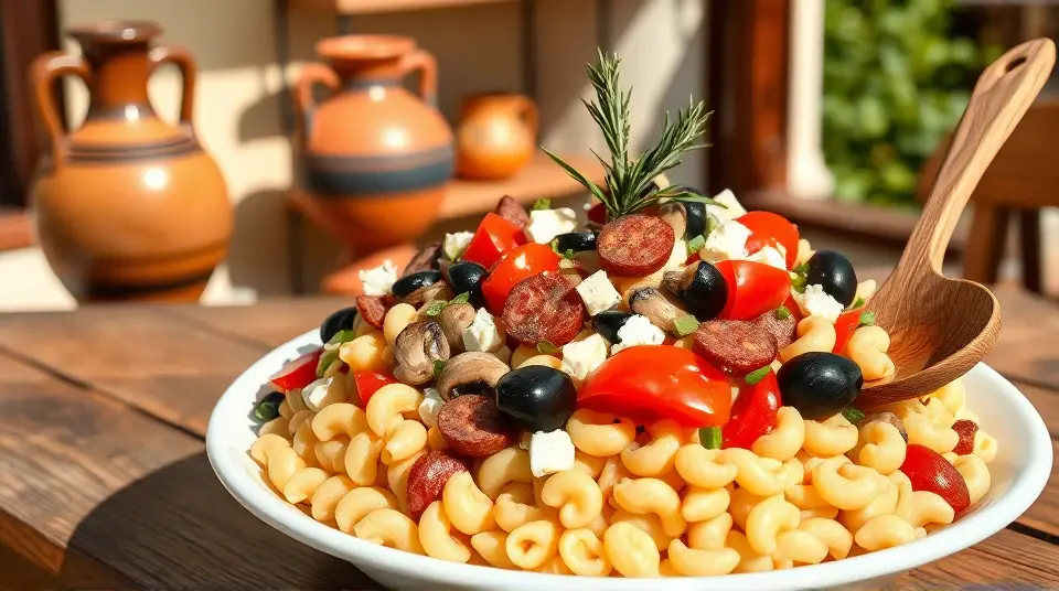 # Greek Pasta Salad ππ₯ This vibrant and flavorful Greek Pasta Salad is perfect for picnics, potlucks, or as a side dish for your summer barbecues. Bursting with fresh vegetables and tangy feta, it's a refreshing dish thatβs easy to prepare and can be made ahead of time. You can also customize it with your favorite ingredients for a personalized touch. Consider serving it alongside grilled chicken or fish for a complete meal, or enjoy it on its own as a light lunch! π ## Ingredients ### For the dressing - 1/2 cup olive oil - 1/2 cup red wine vinegar - 1 1/2 teaspoons garlic powder - 1 1/2 teaspoons dried basil - 1 1/2 teaspoons dried oregano - 3/4 teaspoon ground black pepper - 3/4 teaspoon sugar ### For the salad - 2 1/2 cups cooked elbow macaroni - 3 cups fresh sliced mushrooms - 15 cherry tomatoes, halved - 1 cup sliced red bell peppers - 3/4 cup crumbled feta cheese - 1/2 cup chopped green onions - 1 (4-ounce) can whole black olives - 3/4 cup sliced pepperoni sausage (optional) ## Instructions - In a large bowl, whisk together the olive oil, red wine vinegar, garlic powder, basil, oregano, black pepper, and sugar until well combined. > π₯ Mixing the dressing in advance allows the flavors to meld beautifully, enhancing the overall taste of your salad. - Add the cooked elbow macaroni, mushrooms, cherry tomatoes, red bell peppers, feta cheese, green onions, olives, and pepperoni (if using) to the bowl. Toss until everything is evenly coated in the dressing. > π₯ For a vegetarian version, simply omit the pepperoni and consider adding more veggies or chickpeas for extra protein! - Cover the salad and chill in the refrigerator for at least 2 hours, or overnight for best results. This helps to infuse the flavors together. ## Variations - **Whole wheat pasta**: Swap elbow macaroni for whole wheat pasta for added fiber and a nuttier flavor. - **Add protein**: Toss in grilled shrimp, chicken, or chickpeas to make it a heartier meal. - **Herb swap**: Use fresh herbs like parsley or dill instead of dried herbs for a fresh twist. - **Make it gluten-free**: Use gluten-free pasta for a delicious option everyone can enjoy. Enjoy your Greek Pasta Salad, bursting with delightful flavors and fresh ingredients! ππ₯Images