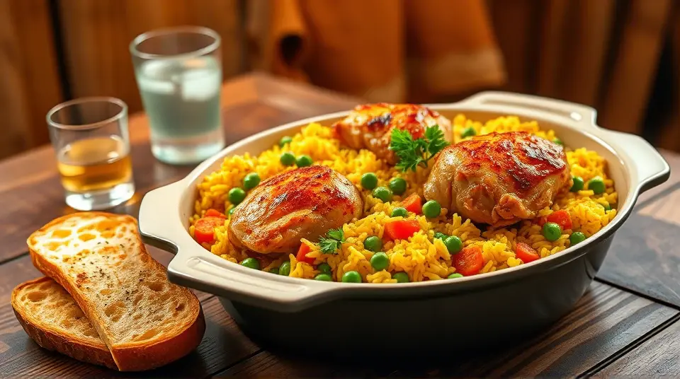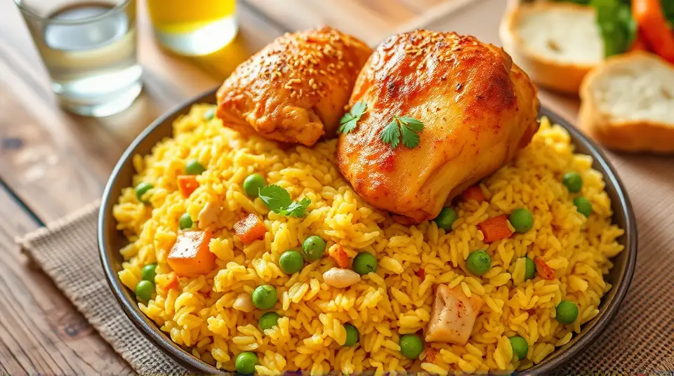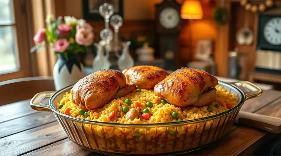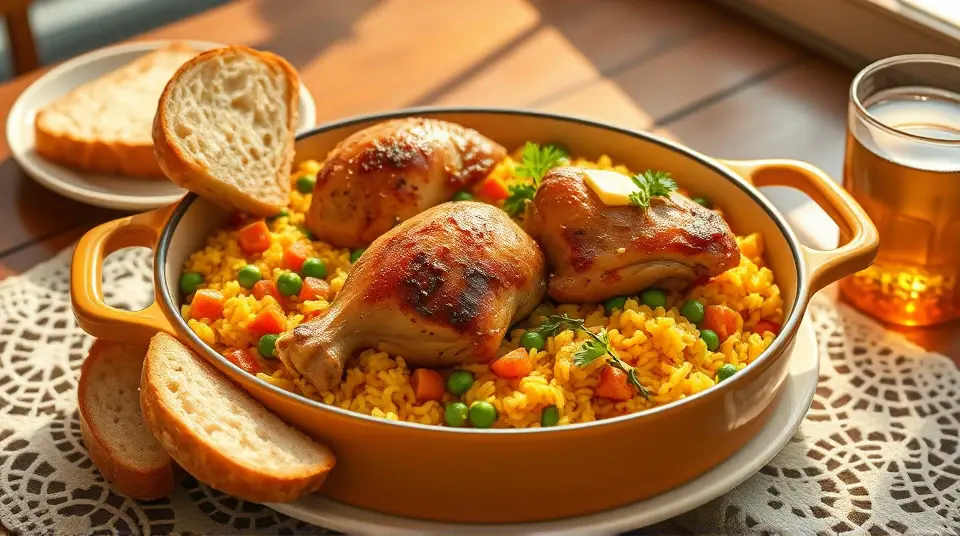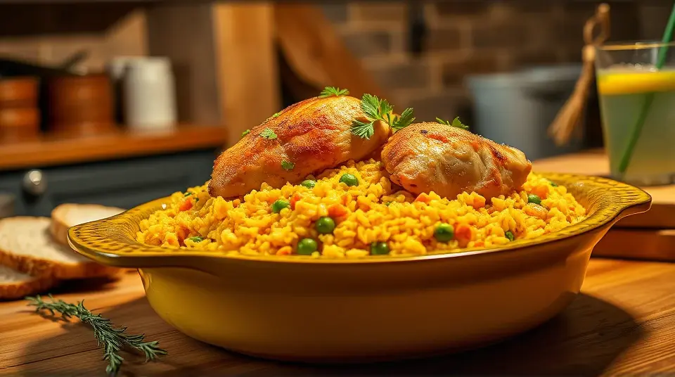 # Mom's Comforting Chicken and Yellow Rice 🍗🍚 This hearty dish is a family favorite that's both nourishing and satisfying. Packed with tender chicken, vibrant peas, and delicious yellow rice, it's a wonderful meal for any time of the year. Plus, it's easy to prepare and can be customized with your choice of chicken! Serve it warm, and watch it disappear from the table! 🌟 ## Ingredients ### For the dish - 2 packets (10 oz each) rice mix (yellow rice) - 3 cups cooked chicken (white and dark meat, torn) or 6 chicken thighs - 16 oz frozen peas and carrots - 28 oz chicken stock ### For seasoning - Paprika (to taste) - Oil (for frying) ## Instructions 1. **Prepare the chicken**: If using chicken thighs, rinse and pat dry. Generously sprinkle paprika on all sides. > 🌶️ Don't be shy with the paprika; it adds a wonderful flavor and color to the chicken! 2. In a pan, heat oil over medium heat. Fry the seasoned chicken thighs until the juices run clear, about 8 minutes per side. Set aside. 3. **Prepare the rice**: Follow the package directions for the rice mix, substituting chicken stock for water to enhance the flavor. > 🍲 Using chicken stock really elevates the taste — the rice will absorb all that savory goodness! 4. Stir in the frozen peas and carrots into the cooked rice, mixing gently. 5. If using torn chicken, fold it into the rice and vegetables. 6. Transfer the rice mixture into a baking dish and top with the whole chicken thighs. 7. Cover the dish with aluminum foil and bake at 350°F (175°C) for 35 minutes. > ⏲️ If you prefer a crispy topping, uncover the dish for the last 10 minutes of baking! ## Variations - **Spice it up**: Add a pinch of cayenne pepper for an extra kick! 🔥 - **Vegetarian Option**: Replace the chicken with sautéed mushrooms and bell peppers, and use vegetable stock for the rice. - **Herbed Rice**: Mix in fresh herbs like parsley or cilantro before serving for a burst of freshness. - **One-Pot Wonder**: Cook everything in a Dutch oven instead! You can add the rice, peas, and carrots right after frying the chicken and simmer everything together for a simpler preparation. ## Serving Suggestions - Pair this dish with a simple salad or garlic bread for a complete meal. - A glass of chilled lemonade or iced tea complements it perfectly, especially on warm days! 🍹 Enjoy the comforting flavors of this delightful chicken and rice casserole that brings everyone to the table!Images