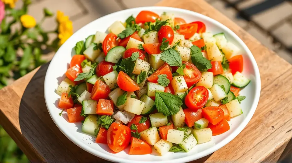 # Refreshing Israeli Salad 🥗✨ This vibrant salad is not only a feast for the eyes but also a refreshing addition to any meal! With its crisp cucumbers, juicy tomatoes, and aromatic herbs, it brings a burst of fresh flavor that’s perfect for warm days or hearty feasts. It's a great side for grilled meats or simply as a light lunch on its own. Pair with pita bread for a complete Mediterranean experience! 🍞🍋 ## Ingredients ### Salad Base - 6 cucumbers, diced - 4 roma (plum) tomatoes, seeded and diced - 5 green onions, sliced - 1 red bell pepper, seeded and diced - 1 cup chopped fresh parsley - 1/2 cup minced fresh mint leaves ### Dressing - 1/2 cup olive oil - 2 tablespoons fresh lemon juice - 1 tablespoon salt - 1 tablespoon ground black pepper ## Instructions 1. In a large bowl, combine the diced cucumbers, tomatoes, green onions, red bell pepper, parsley, and mint. Toss to mix the vegetables evenly. > 🥗 Tip: For extra crunch, allow the cucumbers to sit for a few minutes in salt before dicing. This will draw out some moisture and keep your salad crisp! 2. In a small bowl, whisk together the olive oil, lemon juice, salt, and pepper until well combined. 3. Drizzle the dressing over the salad mixture and toss gently to coat all the ingredients. > 🍋 Fresh lemon juice enhances flavor beautifully. If you prefer a milder tang, try using lime or balsamic vinegar for a different twist! 4. Serve immediately or let it chill in the refrigerator for 30 minutes to allow the flavors to meld. ## Variations - **Grain Boost**: Add a cup of cooked quinoa or couscous for added texture and protein. This makes the salad more substantial as a meal. 🌾 - **Spice it Up**: Include diced jalapeños or a pinch of red pepper flakes for a little heat. Perfect for those who enjoy a kick! 🔥 - **Feta Love**: Crumble feta cheese over the top before serving for a tangy creaminess that complements the fresh veggies. 🧀 - **Herb Swap**: Experiment with different herbs like cilantro or dill to give the salad a unique flavor profile. Enjoy this salad as a bright, refreshing addition to your table, and share the joy of vibrant, healthy eating! 🌿🥗Images