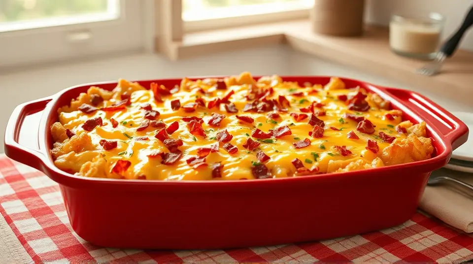 # Cheesy Amish Breakfast Casserole 🍳🧀 This breakfast casserole is a hearty and satisfying dish that makes for a great start to your day or a delightful brunch option. Packed with flavors from crispy bacon, creamy cheeses, and fluffy eggs, it’s sure to please everyone at the table! Best of all, it can be prepared ahead of time, allowing you to relax and enjoy your morning. ### Tip: Pair it with fresh fruit or a light salad for a well-rounded meal. 🍉🥗 ## Ingredients ### For the casserole - 1 pound sliced bacon, diced - 1 sweet onion, chopped - 4 cups frozen shredded hash brown potatoes, thawed - 9 eggs, lightly beaten - 2 cups shredded Cheddar cheese - 1 1/2 cups small curd cottage cheese - 1 1/4 cups shredded Swiss cheese ## Instructions 1. Preheat your oven to 350°F (175°C) and grease a 9x13-inch baking dish. 2. In a large skillet over medium-high heat, cook the diced bacon and chopped onion together until the bacon is crispy and the onion is translucent, about 10 minutes. Drain any excess grease. > 🍽️ Tip: Keep some of the bacon grease to sauté vegetables for an extra burst of flavor! 3. Transfer the bacon and onion mixture to a large bowl. Add the thawed hash browns, beaten eggs, Cheddar cheese, cottage cheese, and Swiss cheese. Stir until everything is well combined. 4. Pour the mixture into the prepared baking dish, spreading it evenly. 5. Bake in the preheated oven for 45 to 50 minutes, or until the eggs are set and the cheese is melted. 6. Allow the casserole to stand for about 10 minutes before cutting into squares and serving. > ⏰ Serving Tip: This casserole is great for meal prep! It can be made ahead of time and stored in the fridge. Just reheat individual portions in the microwave for a quick breakfast. ## Variations - **Vegetarian**: Substitute the bacon with sautéed mushrooms, bell peppers, and spinach for a veggie-packed version. 🌱 - **Spicy Twist**: Add diced jalapeños or a pinch of cayenne pepper to the egg mixture for some heat! 🌶️ - **Biscuit Topping**: For a fun twist, top the casserole with biscuit dough before baking for a delightful biscuit experience. Feel free to customize this dish with your favorite ingredients or spices—make it your own! Enjoy! 🌞Images