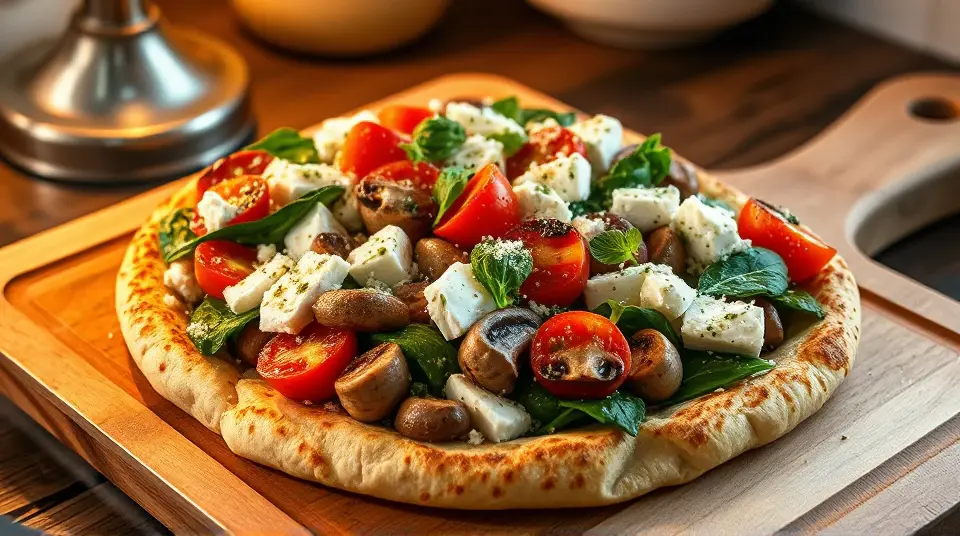 # Spinach and Feta Pita Bake 🥗🍕 This Spinach and Feta Pita Bake is a quick and flavorful dish that's perfect for a light lunch or a tasty appetizer. Packed with the vibrant taste of sun-dried tomato pesto and fresh veggies, this bake is as satisfying as it is easy to prepare. Plus, it’s a delightful way to enjoy healthy greens! ## Ingredients ### For the bake - 1 (6-ounce) tub sun-dried tomato pesto - 6 (6-inch) whole wheat pita breads - 2 roma (plum) tomatoes, chopped - 1 bunch spinach, rinsed and chopped - 4 fresh mushrooms, sliced - 1/2 cup crumbled feta cheese - 2 tablespoons grated Parmesan cheese - 3 tablespoons olive oil - Ground black pepper to taste ## Instructions 1. Preheat your oven to 350°F (175°C). 2. Spread the sun-dried tomato pesto onto one side of each pita bread. Place the pita breads pesto-side up on a baking sheet. 3. Top each pita with a layer of chopped tomatoes, spinach, sliced mushrooms, crumbled feta, and grated Parmesan cheese. Drizzle with olive oil and season generously with black pepper. 4. Bake in the preheated oven until the pita breads are crispy and golden, about 12 minutes. 5. Remove from the oven and let cool for a moment. Cut the pitas into quarters and serve warm. > 🧄 Feel free to get creative! You can add other vegetables like bell peppers or zucchini, or even toss in some cooked chicken for extra protein. ## Tips for the Best Bake - **Choose your Pita:** Whole wheat pita adds a nutty flavor, but feel free to experiment with other types, such as pita with herbs or a gluten-free option. - **Make Ahead:** Assemble everything ahead of time and cover with foil in the fridge. Bake just before you're ready to serve for a fresh and warm dish. - **Garnish:** A sprinkle of fresh herbs like basil or oregano can elevate the flavors even more! ## Variations - **Vegan**: Replace the feta with a plant-based alternative or a homemade tofu feta. This bake will retain its deliciousness without dairy! - **Spicy Kick**: Add sliced jalapeños or a dash of chili flakes for a bit of heat to the dish. - **Mediterranean Twist**: Incorporate olives and artichokes for a more authentic Mediterranean flavor profile. This Spinach and Feta Pita Bake not only combines wonderful textures and flavors, but it’s also a fun recipe to get the whole family involved in preparing. Enjoy your delightful and healthy creation! 🌿✨Images
