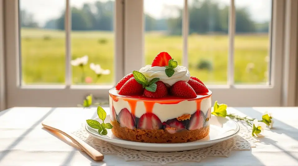 In a separate bowl, dissolve the gelatin in boiling water. Stir in the still-frozen strawberries and allow the mixture to set briefly. When it reaches a consistency similar to egg whites, pour and spread it over the cream cheese layer.