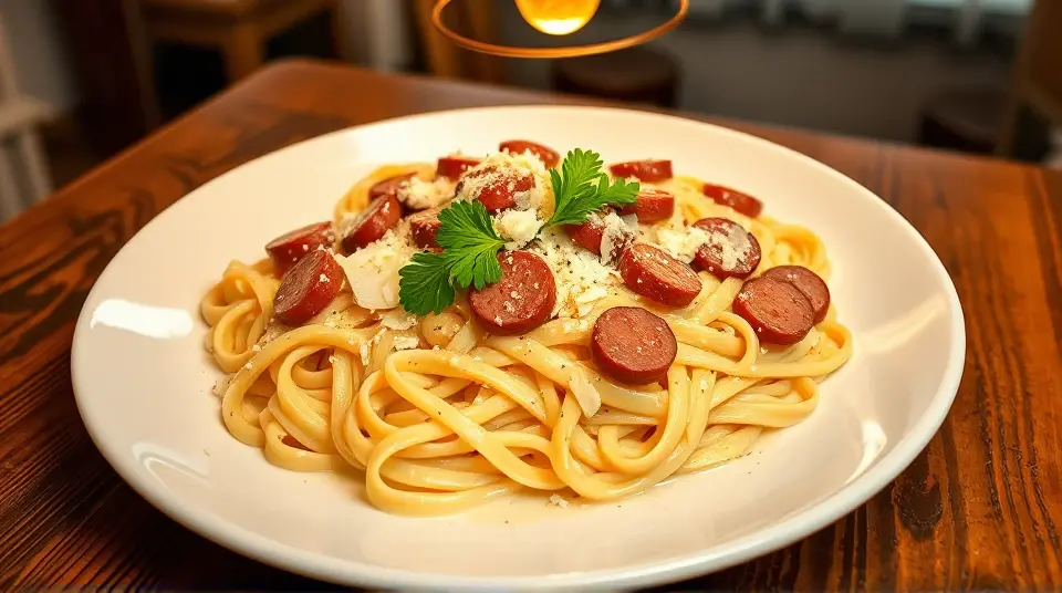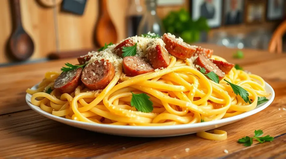 # Creamy Sausage Alfredo Pasta 🍝✨ Indulge in this rich and satisfying Creamy Sausage Alfredo Pasta that is easy to whip up for a weeknight dinner or impress guests! The combination of savory sausage and velvety cream sauce makes every bite comforting and delicious. Perfectly seasoned with a hint of Cajun spice, this dish brings flavor to the table in less than 30 minutes! Pair it with a side salad or garlic bread for a complete meal. 🥗🍞 ## Ingredients ### For the pasta - 8 ounces of your favorite pasta (fettuccine, penne, or rotini work well) - 1 tablespoon of olive oil (optional, for tossing the pasta) ### For the sauce - 1 package (14 ounces) of smoked sausage, diagonally sliced - 2 cups of heavy cream - 2 teaspoons of Cajun seasoning - 1/2 cup of grated Parmesan cheese - Salt and pepper to taste ## Instructions 1. **Cook the pasta**: Prepare the pasta according to package instructions, drain, and set aside. If desired, toss with a little olive oil to prevent sticking. > 🥄 Tip: You can save some pasta water to adjust the sauce consistency later, if needed! 2. **Sauté the sausage**: In a large skillet over medium-high heat, add the sliced sausage. Cook for about 5 minutes, turning occasionally, until nicely browned. 3. **Make the sauce**: Pour in the heavy cream and add the Cajun seasoning. Bring to a gentle boil, then reduce heat and let it simmer for 3-4 minutes, stirring occasionally, until the sauce begins to thicken. > 🧄 Add minced garlic to the sausage for an extra burst of flavor! 4. **Combine**: Remove from heat and stir in the grated Parmesan cheese until melted and smooth. If the sauce is too thick, add a splash of the reserved pasta water until your desired consistency is achieved. Add salt and pepper to taste. 5. **Toss it all together**: Add the cooked pasta to the sauce and toss until well coated. 6. **Serve**: Plate your pasta and garnish with additional Parmesan cheese or fresh herbs if desired. Enjoy! > 🌿 Fresh parsley or basil can add a lovely touch of color and freshness! ## Variations - **Vegetarian**: Replace the sausage with a medley of sautéed vegetables like bell peppers, mushrooms, and zucchini. - **Spicy**: For an extra kick, use hot sausage or add red pepper flakes to the sauce. - **Low-carb**: Substitute pasta with spiralized zucchini or cauliflower rice for a healthier option. - **Alfredo with a twist**: Stir in some sun-dried tomatoes or spinach for added flavor and nutrition. Treat yourself to this creamy delight, and enjoy every creamy, flavorful bite! 🍽️❤️Images