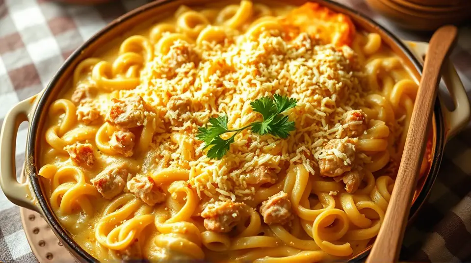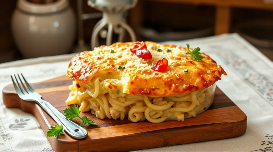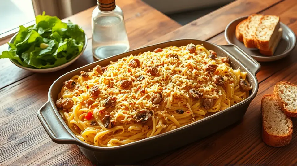 # Cozy Turkey Tetrazzini ππ¦ Looking for a comforting dish to utilize leftover turkey? This Turkey Tetrazzini is a creamy, cheesy delight that brings together tender pasta, savory turkey, and a luscious sauce. Perfect for family dinners or cozy nights in, this dish will have everyone asking for seconds! Consider serving it with a crisp green salad or some garlic bread for a complete meal. Everyone will love the gooey cheese and rich flavors! π₯π§ ## Ingredients ### For the casserole - 1 (8 ounce) package angel hair pasta - 2/3 cup sliced onion - 1/4 cup butter - 1/4 cup all-purpose flour - 1 teaspoon salt - 1/4 teaspoon ground white pepper - 1/2 teaspoon poultry seasoning - 1/4 teaspoon ground mustard - 2 cups milk - 1 cup shredded sharp cheese - 2 tablespoons chopped pimento peppers - 1 (4.5 ounce) can sliced mushrooms, undrained - 1 pound cooked turkey, chopped ## Instructions 1. Preheat your oven to 400Β°F (200Β°C). This will ensure that your casserole bubbles perfectly when you pop it in the oven! 2. In a large pot, bring lightly salted water to a boil. Add the pasta and cook for about 4 minutes, until it's almost tender. Drain and set aside. > π‘ To avoid mushy pasta, make sure not to overcook it, as it will continue to cook in the oven. 3. In a saucepan over medium heat, melt the butter. Add the onion and cook until tender, stirring frequently. 4. Stir in the flour until well blended. Gradually whisk in the milk, ensuring there are no lumps. 5. Season with salt, white pepper, poultry seasoning, and ground mustard. Cook the mixture over medium heat, stirring constantly, until it thickens. 6. Remove from heat and stir in 2/3 cup of cheese and the pimento peppers until the cheese melts completely. Then, add the undrained mushrooms to the sauce. 7. In a 9x13 inch baking dish, layer half of the pasta on the bottom. Follow with half of the chopped turkey and then half of the cheese sauce. Repeat the layers, finishing with the remaining cheese on top. 8. Bake for about 25 minutes, or until the sauce is bubbly and the cheese on top is beautifully golden and crispy. > π₯ Be sure to keep an eye on your casserole towards the end of the baking time to prevent any burning! ## Variations - **Vegetarian**: Substitute cooked turkey with roasted vegetables or a can of chickpeas for a delicious vegetarian-friendly option! ππ₯ - **Cheesy Twist**: Experiment with different types of cheese like mozzarella or Monterey Jack for a different flavor profile! - **Low-Carb**: Use spiralized zucchini or spaghetti squash instead of pasta for a low-carb alternative that still satisfies! π₯ - **Make it Spicy**: Add in some chopped green chilies or jalapeΓ±os for a zesty kick! Now you're ready to dish up this scrumptious Turkey Tetrazzini! Enjoy and share with the ones you love! ππ½οΈImages