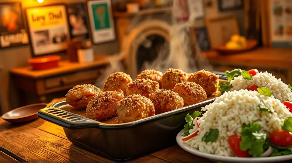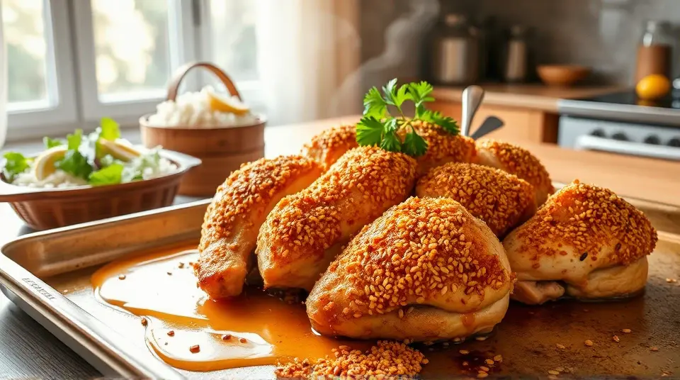# Crunchy Sesame Chicken 🍗✨ This flavorful recipe for Sesame Chicken combines crispy coating with juicy chicken, making it an irresistible crowd-pleaser for any occasion! Perfect for family dinners or gatherings, this dish is sure to leave everyone asking for seconds. Pair it with steamed rice and a crisp salad for a complete meal that’s packed with flavor. ## Ingredients ### For the chicken coating - 2 eggs - 1/3 cup water - 1 cup matzo meal - 1.5 teaspoons kosher salt - 2 teaspoons paprika - 1 teaspoon oregano - 1 teaspoon basil - 1/2 teaspoon onion powder - 1/2 teaspoon garlic powder - 1/2 cup sesame seeds ### For the chicken - 2 chickens (2.5 - 3 pounds each), cut into eighths - 1/3 cup melted margarine or canola oil ## Instructions 1. Preheat the oven to 350 degrees Fahrenheit (175 degrees Celsius). 2. In a bowl, beat the eggs together with water until well combined. 3. In a separate bowl, mix the matzo meal with kosher salt, paprika, oregano, basil, onion powder, garlic powder, and sesame seeds. 4. Dip each chicken piece into the egg mixture, shaking off excess, and then roll it in the matzo meal mixture until well coated. 5. Place the coated chicken pieces in a large baking dish. Drizzle melted margarine or canola oil over the chicken for added flavor and crispiness. 6. Roast the chicken in the preheated oven for about 1.5 hours, or until the chicken is golden brown and cooked through. > 🍽️ For crispy skin, make sure to leave space between the chicken pieces in the baking dish. This allows hot air to circulate and achieve that perfect crunch! ## Serving Suggestions - **Side Dish**: Serve with a side of steamed rice and your favorite sautéed vegetables or a refreshing salad to balance the richness of the chicken. - **Sauce**: Consider drizzling with a sweet and spicy sauce for an extra layer of flavor! ## Variations - **Baked Alternative**: For a lighter version, you can spray the coated chicken with cooking spray instead of drizzling with oil, then bake until crispy. - **Spicy Kick**: Add some cayenne pepper to the matzo meal mixture for a bit of heat. Adjust to your tolerance, of course! 🌶️ - **Herb Blend**: Customize the herbs in the coating according to your taste preferences; thyme or rosemary pairs well, too! - **Gluten-Free**: Substitute matzo meal with crushed gluten-free breadcrumbs or almond flour for a gluten-free option without sacrificing taste. Enjoy your delectable sesame chicken, and watch as it becomes a family favorite! 🥳🥡Images
