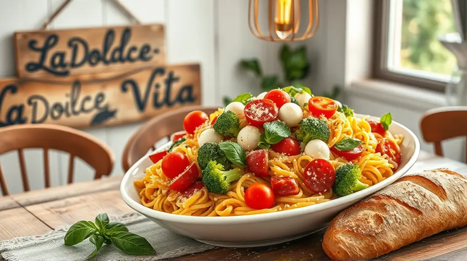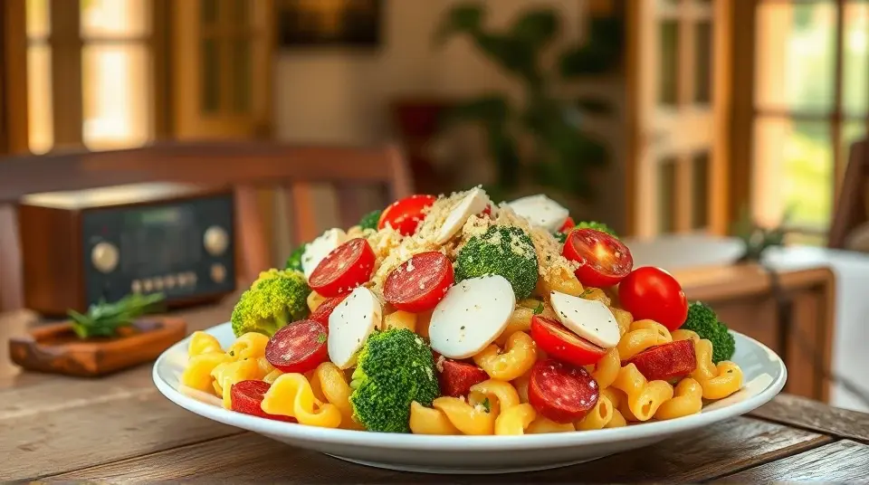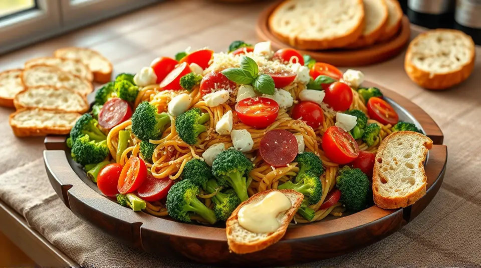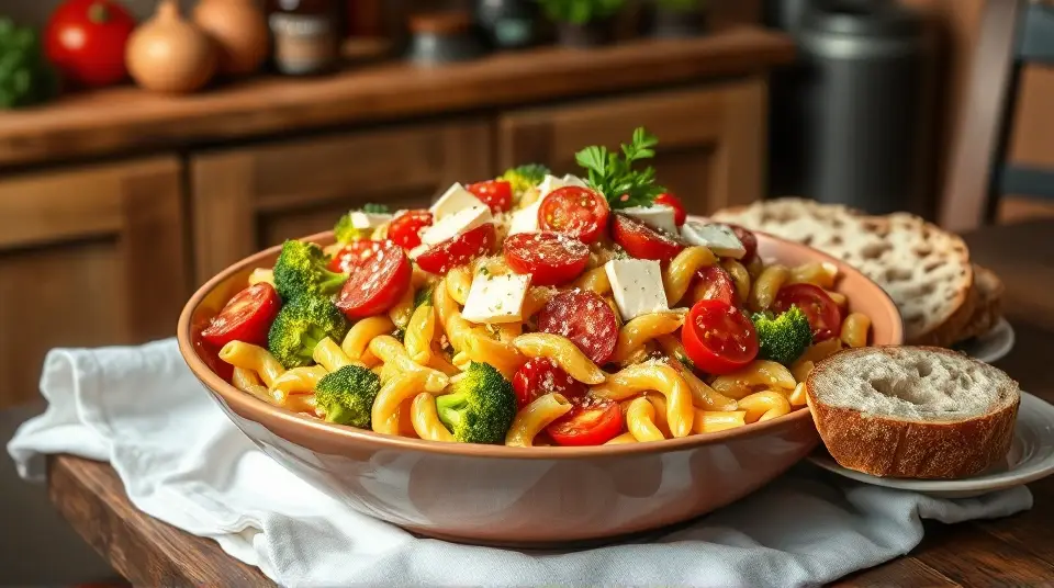 Add the Vegetables & Serve: Just before serving, toss in the broccoli florets, sliced pepperoni, and halved cherry tomatoes. Top with shredded mozzarella cheese.