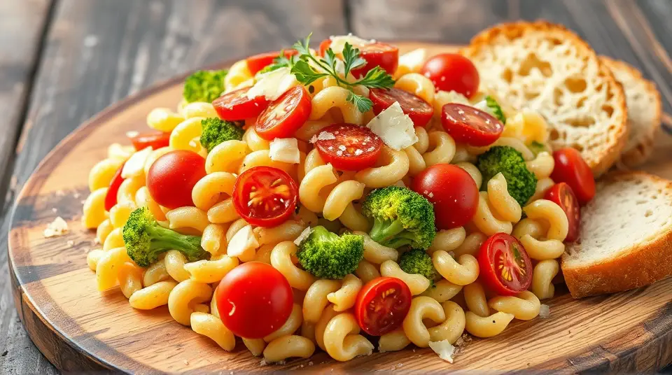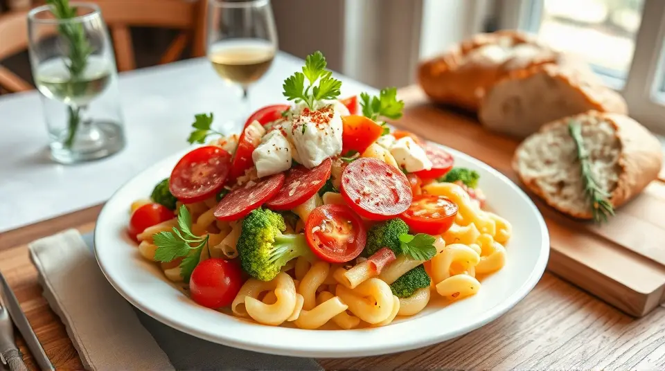 # Zesty Antipasto Salad 🥗🍅 This vibrant and refreshing antipasto salad is a delightful addition to any meal or a perfect light lunch on its own. Bursting with a medley of flavors, it's both satisfying and healthy! The combination of crunchy broccoli, savory pepperoni, and creamy mozzarella creates a harmonious blend that everyone will love. For an extra zing, serve it with some crusty bread on the side to soak up all those delicious juices! 🍞✨ ## Ingredients ### For the dressing - 1/2 cup vegetable oil - 3 tablespoons red wine vinegar - 1 clove garlic, minced - 1 teaspoon dried basil - 1/8 teaspoon crushed red pepper flakes - 1 teaspoon salt ### For the salad - 6 ounces macaroni - 1/4 cup grated Parmesan cheese - 2 cups broccoli florets - 4 ounces sliced pepperoni sausage - 10 cherry tomatoes, halved - 1/2 cup shredded mozzarella cheese ## Instructions 1. **Cook the Pasta**: In a pot of boiling salted water, cook the macaroni until al dente. Drain and set aside to cool slightly. 2. **Make the Dressing**: In a large bowl, whisk together the vegetable oil, red wine vinegar, minced garlic, dried basil, crushed red pepper flakes, and salt. > 🌿 The dressing can be made ahead of time to let the flavors meld together beautifully! 3. **Combine Pasta and Dressing**: Toss the warm macaroni with the dressing until well coated. Sprinkle in the grated Parmesan cheese and mix well. 4. **Chill the Salad**: Cover the bowl and refrigerate for 2 to 3 hours, allowing the flavors to develop further. 5. **Add the Vegetables & Serve**: Just before serving, toss in the broccoli florets, sliced pepperoni, and halved cherry tomatoes. Top with shredded mozzarella cheese. > ❄️ For best results, serve the salad chilled: the refreshing combination of ingredients makes it a perfect dish for hot summer days! ## Variations - **Pasta Choice**: Swap macaroni for your favorite pasta shape, such as rotini or penne, for varied textures. - **Veggie Delight**: Add diced bell peppers, cucumbers, or olives for extra crunch and flavor! - **Meat-Free**: Omit the pepperoni and add chickpeas or grilled tofu for a plant-based protein boost. - **Italian Herbs**: Mix in some Italian seasoning for an extra layer of flavor and aroma. Enjoy this versatile antipasto salad—perfect for picnics, potlucks, or simply a meal at home! 🍽️✨Images