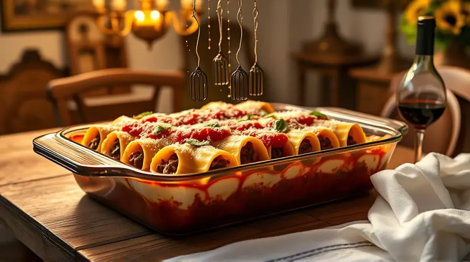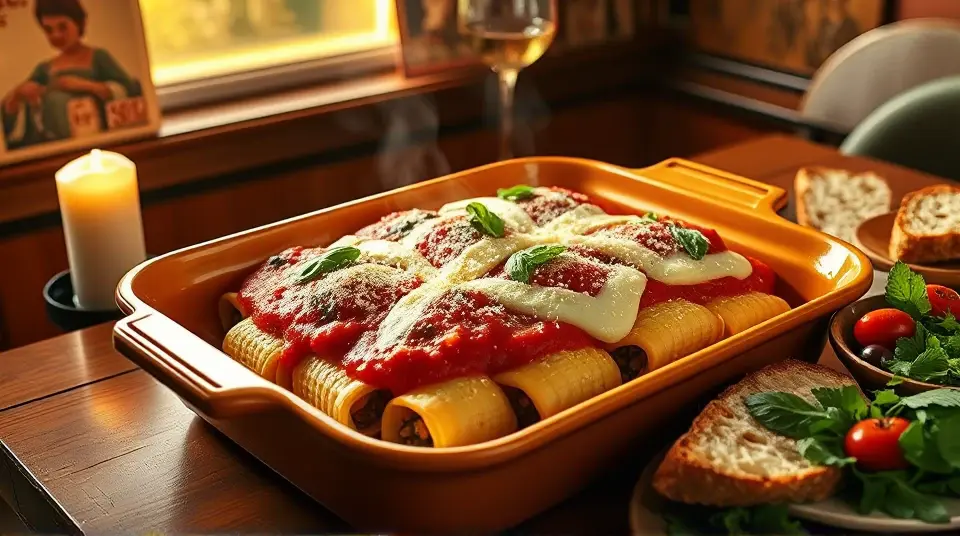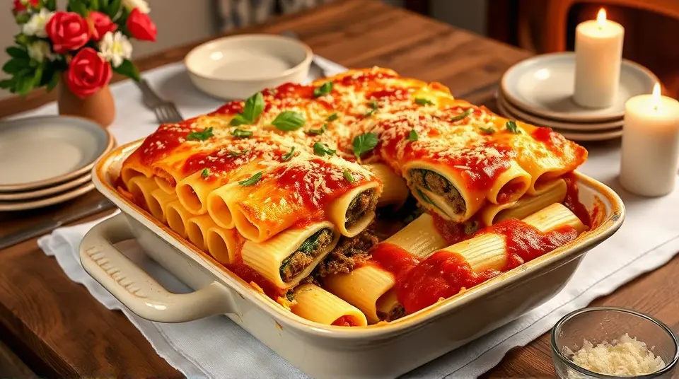 # Manicotti Alla Romana 🍝✨ This dish is a delightful twist on classic Italian comfort food that combines tender manicotti shells with a rich filling of seasoned ground beef, spinach, and creamy ricotta. The layers of luscious white sauce and marinara create a beautiful presentation that’s as pleasing to the eye as it is to the palate. Perfect for a family gathering, a date night, or simply a cozy evening at home, this recipe is sure to impress! ## Ingredients ### For the filling - 2 tablespoons olive oil - 1/2 cup chopped onion - 6 cloves garlic, finely chopped - 1 pound ground beef - Salt, to taste - 1 (10 ounce) package frozen chopped spinach, thawed and drained - 2 cups ricotta cheese - 2 eggs, beaten ### For the shells - 1 (12 ounce) package manicotti shells ### For the sauces - 3 cups spaghetti sauce, divided - 2 tablespoons butter - 2 tablespoons all-purpose flour - 2 tablespoons chicken bouillon granules - 2 cups half-and-half - 1/4 cup chopped fresh parsley - 1 tablespoon chopped fresh basil - 1/2 cup grated Parmesan cheese ## Instructions 1. **Prepare the filling**: Heat olive oil in a large skillet over medium heat. Sauté the onions until translucent, then add garlic and sauté for an additional minute. 2. **Brown the meat**: Stir in the ground beef and cook until well browned, breaking it apart as it cooks. Season with salt and set aside to cool slightly. > 🔥 Make sure to cook the beef thoroughly for the best flavor, and drain any excess fat if needed. 3. **Cook the spinach**: While the meat is cooling, cook the spinach according to package directions. 4. **Parboil the shells**: Bring a large pot of lightly salted water to a boil. Add manicotti shells and parboil for half the time recommended on the package. Drain and place them in cool water to stop the cooking and prevent cracking. 5. **Mix the filling**: In a bowl, combine the cooled ground beef mixture, cooked spinach, ricotta cheese, and beaten eggs. 6. **Prepare the dish**: Spread 1/4 cup of spaghetti sauce in the bottom of a 9x13 inch baking dish. Carefully stuff each manicotti shell with the meat and cheese filling and place them in the prepared dish. > 🌟 Tip: Use a piping bag or a zip-top bag with the corner cut off for easy filling of the shells! 7. **Make the white sauce**: Preheat your oven to 350°F (175°C). In a small saucepan, melt butter over medium heat. Stir in flour and chicken bouillon granules, cooking until it bubbles. Gradually stir in half-and-half and bring to a boil, stirring constantly for about a minute. Remove from heat and mix in parsley. 8. **Layer the sauces**: Pour the white sauce evenly over the stuffed shells. In a separate bowl, mix basil into the remaining spaghetti sauce, then carefully pour it over the white sauce to create layers. 9. **Bake**: Cover the baking dish with foil and bake for 40 minutes. Remove the foil, sprinkle with Parmesan cheese, and bake for an additional 10 minutes uncovered until bubbly and golden. 10. **Serve and enjoy**: Allow to cool for a few minutes before serving. Pair with a fresh green salad or your favorite garlic bread for a complete meal! > 🍷 Pair this dish with a nice red wine to enhance the flavors and elevate your dining experience. Enjoy your homemade Italian feast! ## Variations - **Vegetarian**: Substitute the ground beef with lentils or a mix of sautéed mushrooms and chopped bell peppers for a hearty veggie option. - **Spicy**: Add crushed red pepper flakes or diced jalapeños to the meat mixture for a spicy kick! - **Cheesy**: For extra creaminess, mix in some shredded mozzarella cheese with the ricotta, or top it before baking for a delicious stretch! Enjoy making and sharing this classic Italian dish with your loved ones! Buon Appetito! 🍽️❤️Images