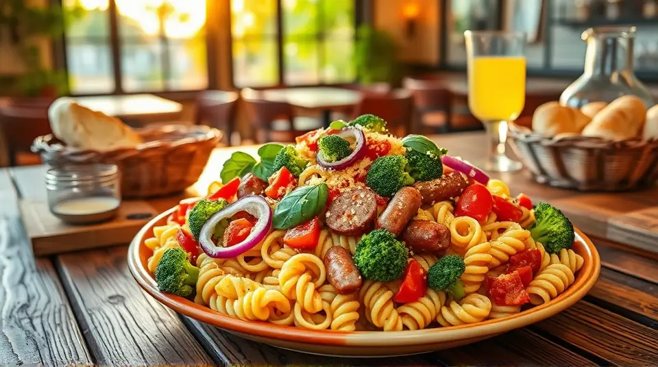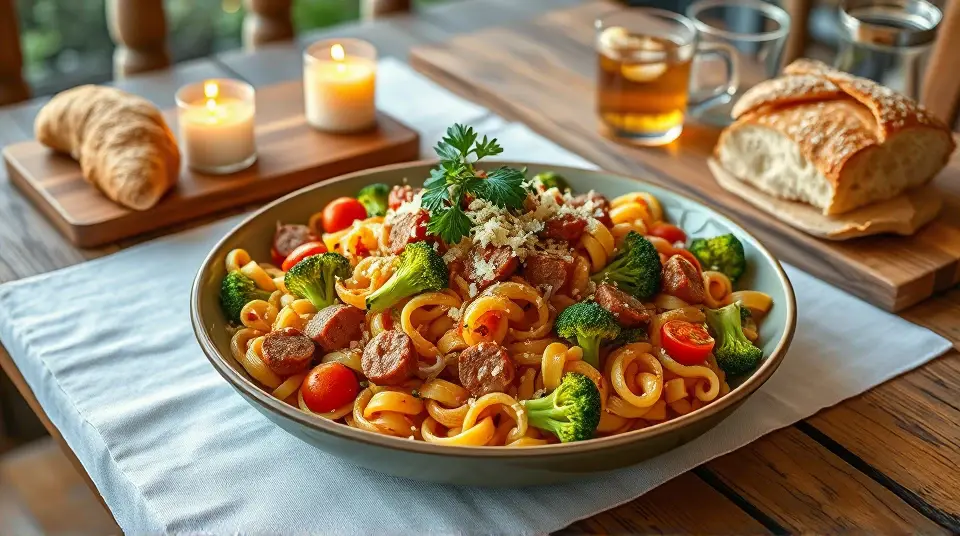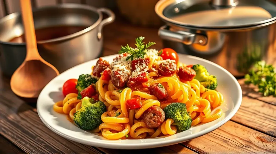 - Combine: Drain the cooked pasta, then gently fold it into the sausage and vegetable mixture.