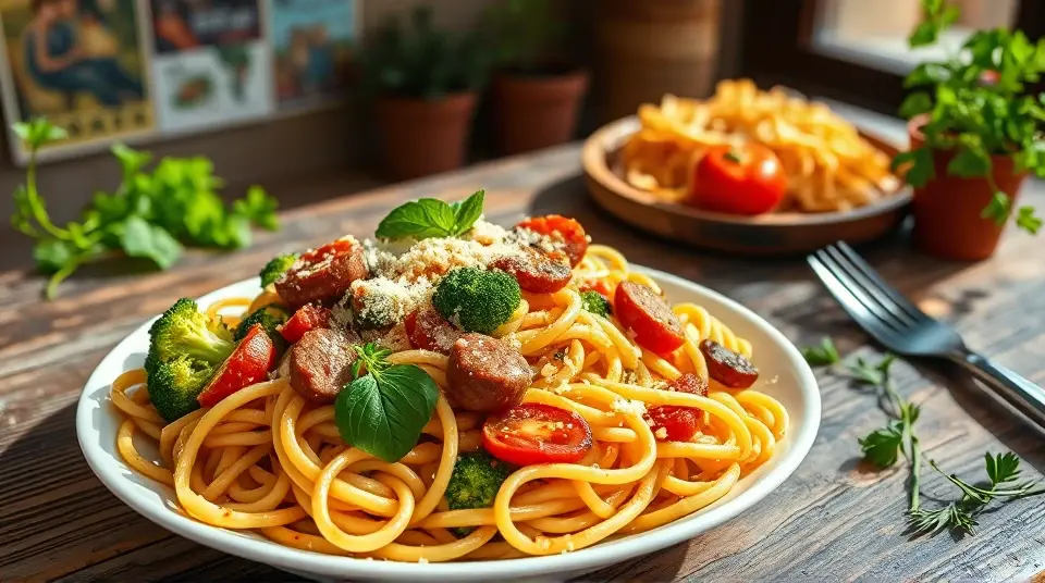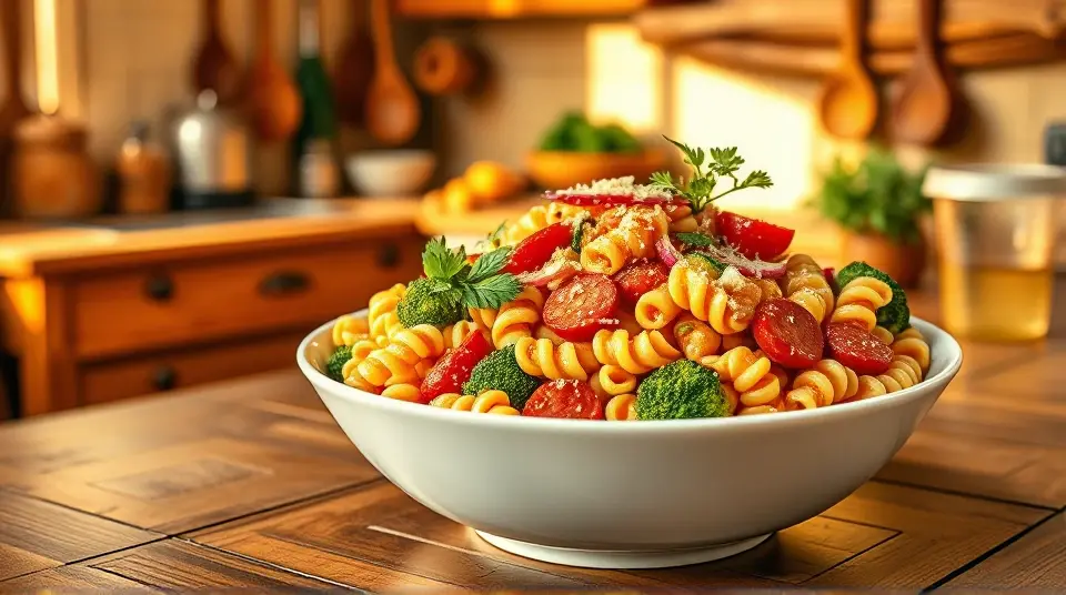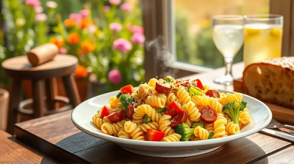 # Broccoli Pasta Delight 🍝🥦 This colorful and hearty dish is perfect for summer gatherings or a simple family dinner. Featuring tender pasta and fresh broccoli, it’s a crowd-pleaser that blends flavors beautifully. Whether you're enjoying it warm or at room temperature, this meal is both nutritious and satisfying. For an extra kick, consider adding a sprinkle of your favorite cheese or a dash of red pepper flakes! ## Ingredients ### For the pasta - 3 cups uncooked spiral pasta - 2 pounds smoked sausage, cut into 1/4-inch slices (or substitute with your favorite protein) - 2 medium bunches broccoli, cut into florets - 1 cup sliced red onion - 2 cans diced tomatoes (14-1/2 ounces each), undrained - 2 tablespoons minced fresh basil (or 2 teaspoons dried basil) - 2 tablespoons minced fresh parsley (or 2 teaspoons dried parsley flakes) - 2 teaspoons sugar ## Instructions 1. **Cook the Pasta**: Prepare the pasta according to package directions until al dente. 2. **Sauté the Vegetables and Sausage**: In a large Dutch oven, sauté the smoked sausage, broccoli, and red onion over medium heat for 5-6 minutes, or until the broccoli is crisp-tender. > 🔥 Stir occasionally to ensure even cooking and prevent sticking. If you prefer your broccoli softer, you can sauté it a bit longer. 3. **Add the Flavoring**: Stir in the diced tomatoes (with juice), basil, parsley, and sugar. Cover and let it simmer for about 10 minutes to allow the flavors to meld. > 🍅 The sugar balances the acidity of the tomatoes, bringing out a delightful sweetness. 4. **Combine**: Drain the cooked pasta, then gently fold it into the sausage and vegetable mixture. > 🍽️ For that perfect bite, make sure everything is mixed well so that the pasta captures the delicious sauce. 5. **Serve and Enjoy**: Ladle into bowls and enjoy warm, or let it cool slightly and serve at room temperature. ## Variations - **Vegetarian**: Substitute the sausage with chickpeas or lentils for a hearty plant-based option. - **Pasta Alternatives**: Whole grain or gluten-free pasta works beautifully as a substitute. Experiment with different shapes like penne or farfalle for variety. - **Creamy Version**: Stir in some cream or a dollop of ricotta cheese before serving for a rich, creamy texture. - **Extra Veggies**: Feel free to add in other vegetables such as bell peppers, zucchini, or spinach for an even more colorful dish! ## Serving Tips Pair this dish with a side salad or garlic bread for a complete meal. 🍞🥗 Sweeten the experience with a refreshing lemonade or iced tea!Images