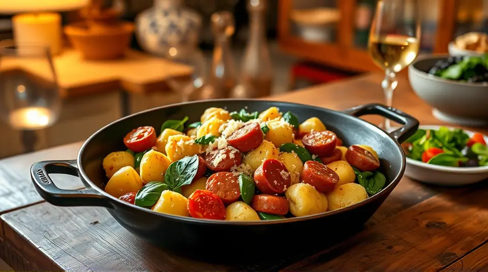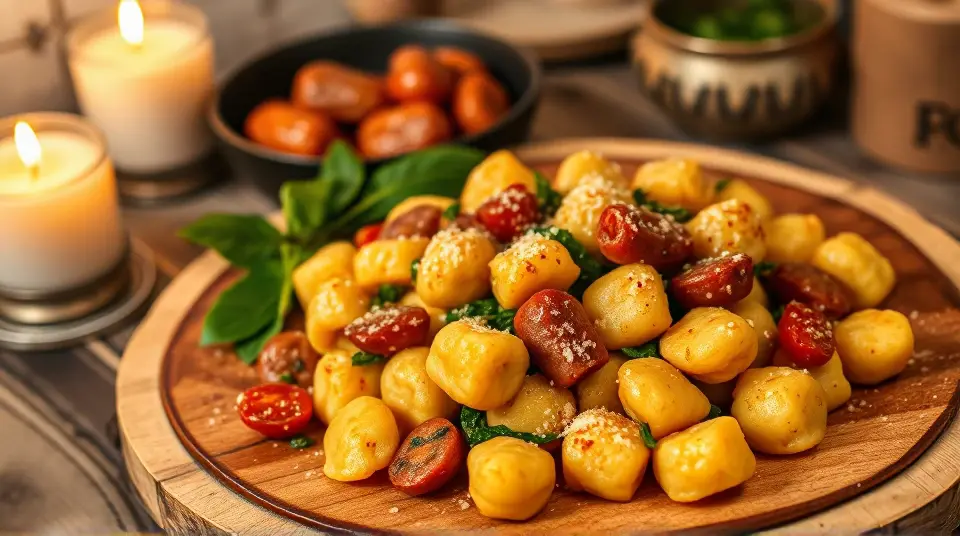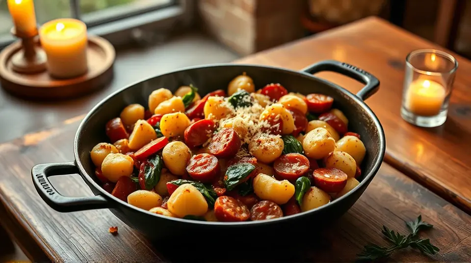 # Smoky Gnocchi Delight with Spinach & Sun-Dried Tomatoes 🌿🍅 This hearty and flavorful dish combines the comforting bite of gnocchi with the savory goodness of smoked sausage, complemented by the freshness of spinach and the tang of sun-dried tomatoes. Perfect for a family dinner or a cozy night in, it’s quick to prepare and bursting with flavors. Don't forget a sprinkle of parmesan on top to elevate this dish to the next level! 🧀✨ ## Ingredients ### Main Ingredients - 1 pound gnocchi - 1 pound smoked sausage, cut into 1/2-inch slices - 1/4 cup julienned sun-dried tomatoes in oil - 2 cloves garlic, minced - 4 cups baby spinach - 1/2 cup shredded parmesan cheese ## Instructions 1. **Cook the Gnocchi**: Prepare gnocchi according to package directions, drain, and keep warm. > 🔥 Tip: Adding a pinch of salt to the boiling water can enhance the flavor of the gnocchi. 2. **Sauté the Sausage**: In a large skillet over medium-high heat, cook and stir the sausage, garlic, and sun-dried tomatoes in the oil for about 5 minutes, or until the sausage is lightly browned. > 🌶️ Pro Tip: Feel free to add a sprinkle of red pepper flakes if you enjoy a bit of heat in your dishes! 3. **Add Spinach**: Stir in the baby spinach and cook gently until it wilts. 4. **Combine**: Add the cooked gnocchi to the skillet and heat everything through, ensuring the flavors meld together. 5. **Serve**: Sprinkle with shredded parmesan cheese and serve immediately. > 🍽️ Serving Suggestion: Pair this dish with a simple side salad and a glass of your favorite wine for a complete meal experience! ## Variations - **Vegetarian**: Swap out the smoked sausage for your favorite plant-based sausage or sautéed mushrooms for a meat-free delight. 🍄 - **Creamy Twist**: Stir in a splash of heavy cream or a dollop of cream cheese just before serving for a rich, creamy sauce. - **Herb Infusion**: Add fresh herbs like basil or parsley toward the end for a burst of freshness. 🌱 - **Meal Prep**: This dish can be prepared ahead of time! Store leftovers in an airtight container in the fridge for up to 3 days. Reheat on the stovetop with a little splash of water or broth to help revive the flavors. Get ready to impress your taste buds with this delicious combination! Enjoy!Images