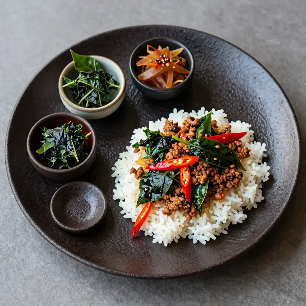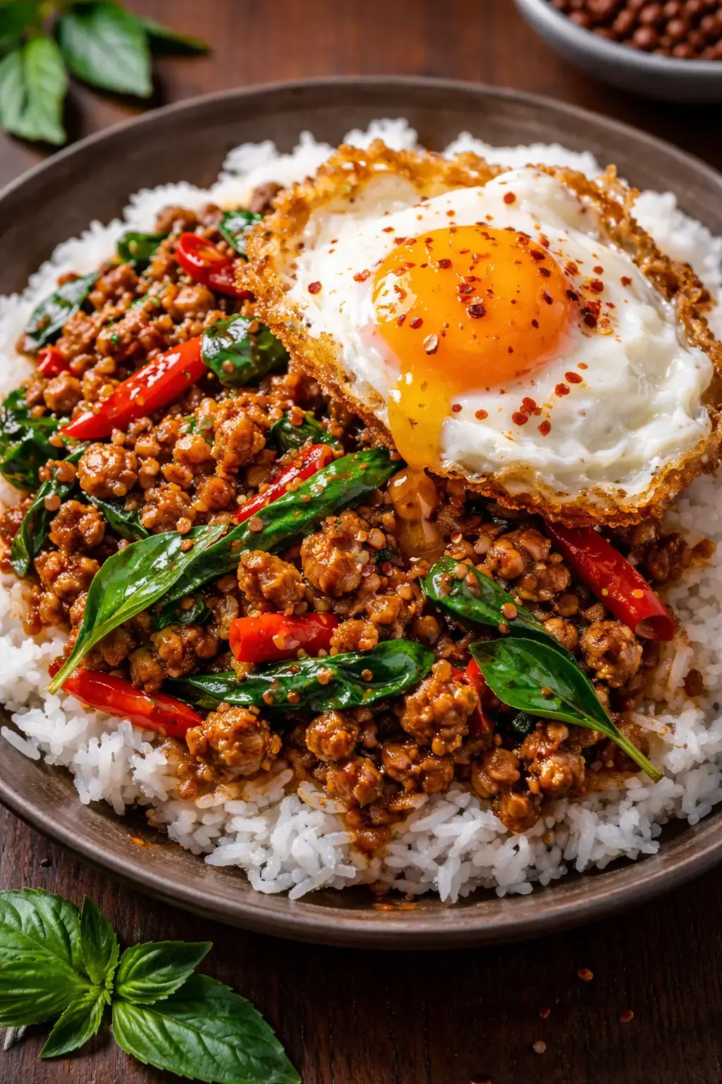 A glossy, fiery, unapologetically rich stir fry built around Thai basil, chilies, and a savory-sweet sauce. This version leans into indulgence: higher fat, a touch of sugar, and a crispy fried egg on top.