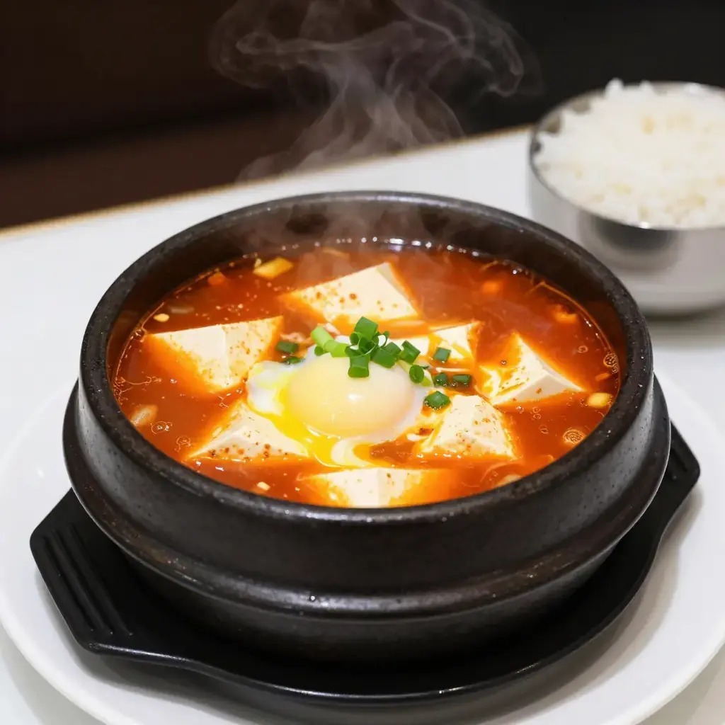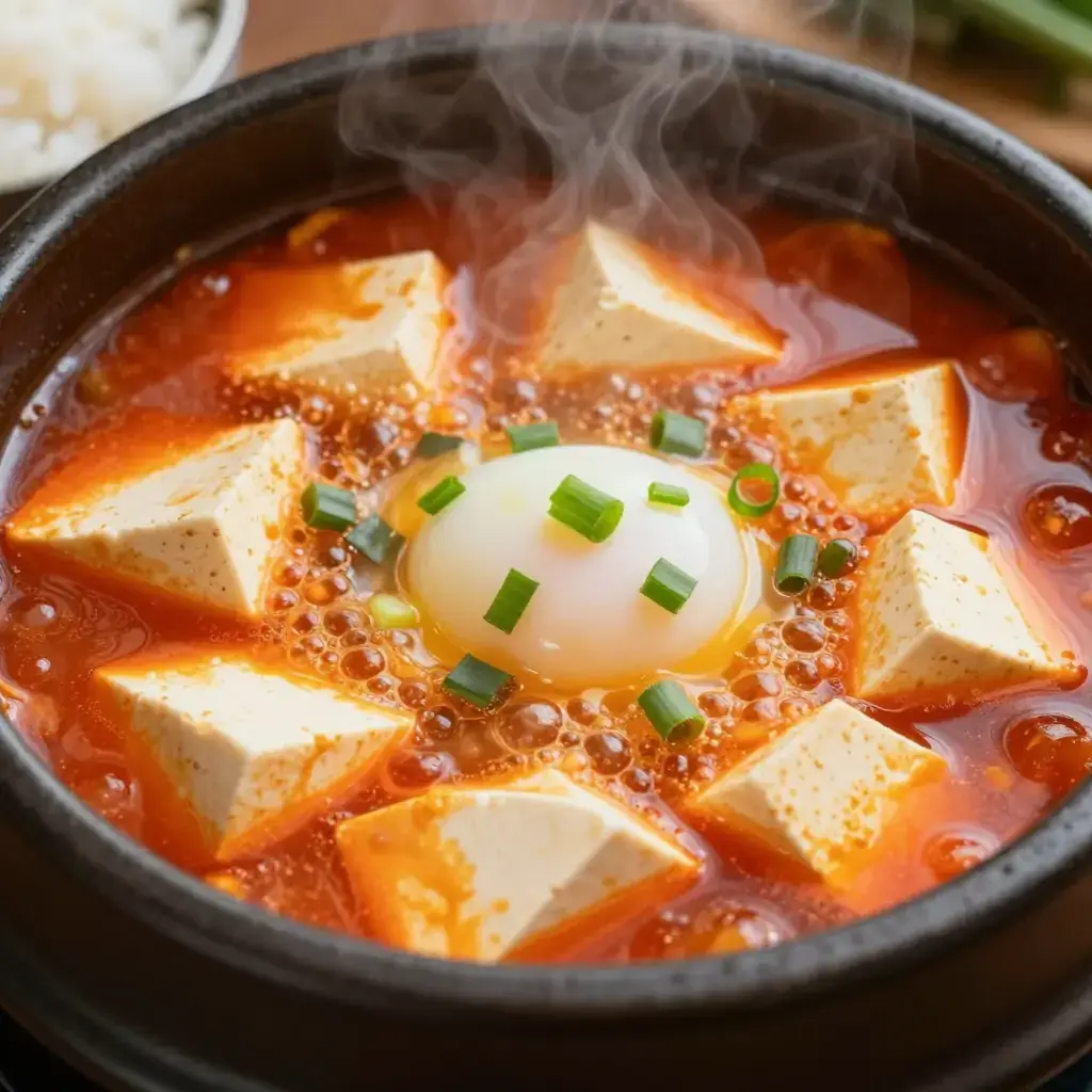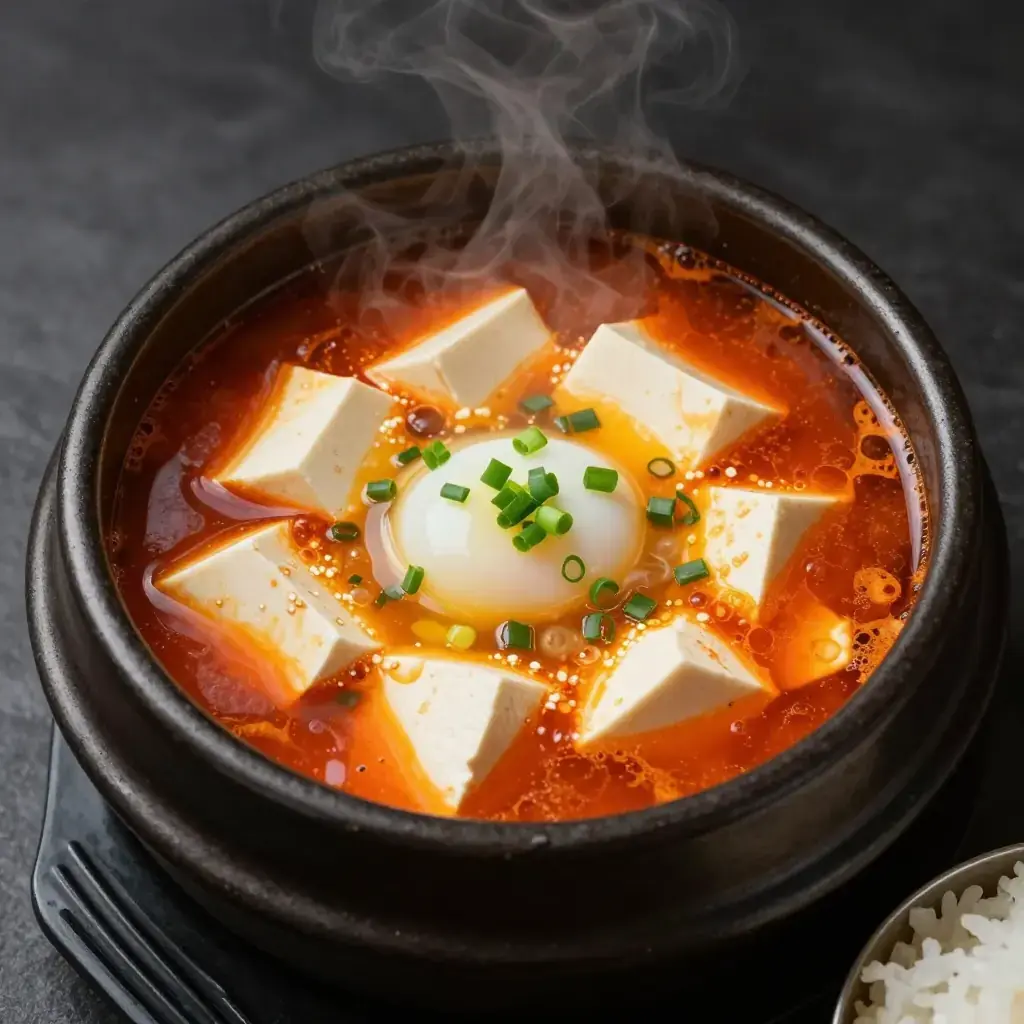 # Sundubu-jjigae Sundubu-jjigae is one of Korea's great comfort foods, a bubbling-hot stew built on silky uncurdled tofu. It arrived at its modern form in the 1960s but draws on centuries of Korean jjigae tradition. The stew must arrive at the table still boiling — the sizzle is part of the experience. Serves: 2 ## Ingredients - 1 package (350g / 12 oz) extra-soft (sundubu) tofu - 150g (5 oz) pork belly or clams (or both), thinly sliced - 1 tablespoon gochugaru (Korean chili flakes) - 1 tablespoon sesame oil - 3 cloves garlic, minced - 1 small zucchini, diced - 3 green onions, sliced - 1 tablespoon soy sauce - 1 teaspoon fish sauce - 350ml (1½ cups) anchovy-kelp stock - 1 egg - Salt to taste ## Instructions 1. Heat sesame oil in a stone pot (ttukbaegi) or small heavy saucepan over medium heat. Sauté the pork belly for 3-4 minutes until the fat renders. 2. Add garlic and gochugaru, stirring for 30 seconds until fragrant. 3. Pour in the anchovy-kelp stock. Add soy sauce and fish sauce. Bring to a boil. 4. Add zucchini and cook for 3 minutes until slightly softened. 5. Gently spoon in the soft tofu in large, loose curds — do not stir vigorously. 6. Simmer for 8-10 minutes on medium heat until the flavors meld. 7. Crack the egg directly into the bubbling stew. Add green onions and remove from heat immediately. 8. Serve in the hot pot with steamed rice on the side. **Cook's Notes:** The stew should still be bubbling when it reaches the table — a stone pot retains heat perfectly for this. The egg cooks from residual heat; leave the yolk runny for richness. For a vegetarian version, skip the pork and fish sauce, use mushroom stock, and add shiitake mushrooms.Images