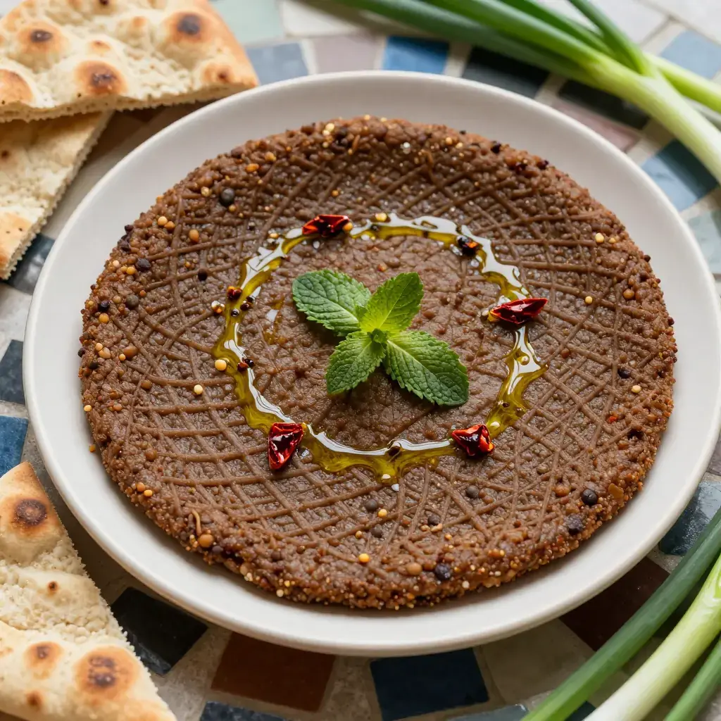 # Kibbeh Nayeh Kibbeh Nayeh — raw ground lamb mixed with fine bulgur, onion, and spices — is considered the crown jewel of Lebanese mezze, served at celebrations and family gatherings as a mark of hospitality. It is Lebanon's answer to steak tartare, and its preparation requires the freshest possible lamb, ideally purchased whole and ground to order on the day of serving. Serves: 4 ## Ingredients - 400 g (14 oz) very fresh lamb leg or shoulder, all fat and sinew removed, ground twice (ask your butcher) - 80 g (½ cup) fine bulgur wheat (No. 1 grade), rinsed and squeezed dry - 1 small white onion, finely grated, excess liquid squeezed out - 5 g (1 tsp) ground allspice - 3 g (½ tsp) ground cinnamon - 2 g (½ tsp) white pepper - 2 g (½ tsp) dried marjoram - 5–6 fresh basil leaves, very finely chiffonaded - Small handful fresh mint leaves, to garnish - 30 ml (2 tbsp) extra-virgin olive oil, for drizzling - Ice cubes (kept nearby to keep hands cold during mixing) - Flatbread and raw spring onions, to serve ## Instructions 1. Combine bulgur, grated onion, allspice, cinnamon, white pepper, and dried marjoram in a bowl. Mix with wet hands, adding 1–2 tablespoons of ice water to hydrate the bulgur slightly. Rest 10 minutes. 2. Add freshly ground lamb to the bulgur mixture. Working quickly with cold, damp hands (dip in ice water regularly), knead and fold the mixture for 3–4 minutes until completely homogeneous and slightly sticky. Do not overwork. 3. Taste a small amount — it should be aromatic, lightly spiced, and savory. Adjust seasoning. Fold in fresh basil. 4. Wet your hands and spread the kibbeh on a flat serving plate in a thin, even layer (about 1.5 cm / ½ inch thick). Use your fingers or a fork to make a crosshatch pattern on the surface. 5. Drizzle generously with olive oil, scatter mint leaves over the top, and serve immediately with flatbread and raw spring onions. **Cook's Notes:** Food safety is paramount: use only meat purchased fresh that morning from a trusted butcher, refrigerate until the last moment, and consume immediately. Keep the mixture cold throughout preparation — warm hands melt fat and the texture suffers. In Lebanon, kibbeh nayeh is sometimes dressed with a thin drizzle of pomegranate molasses for a fruity counterpoint. Never freeze raw lamb intended for kibbeh nayeh.Images