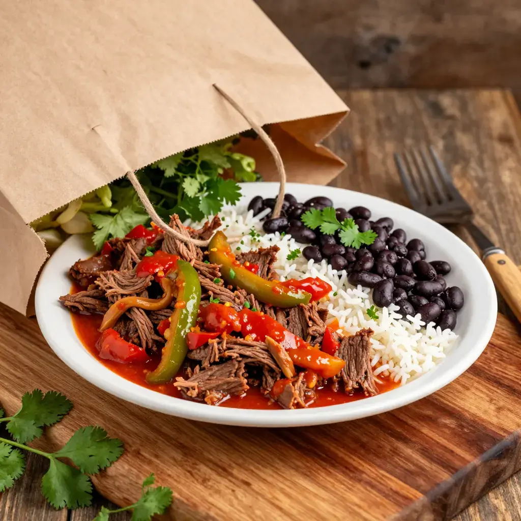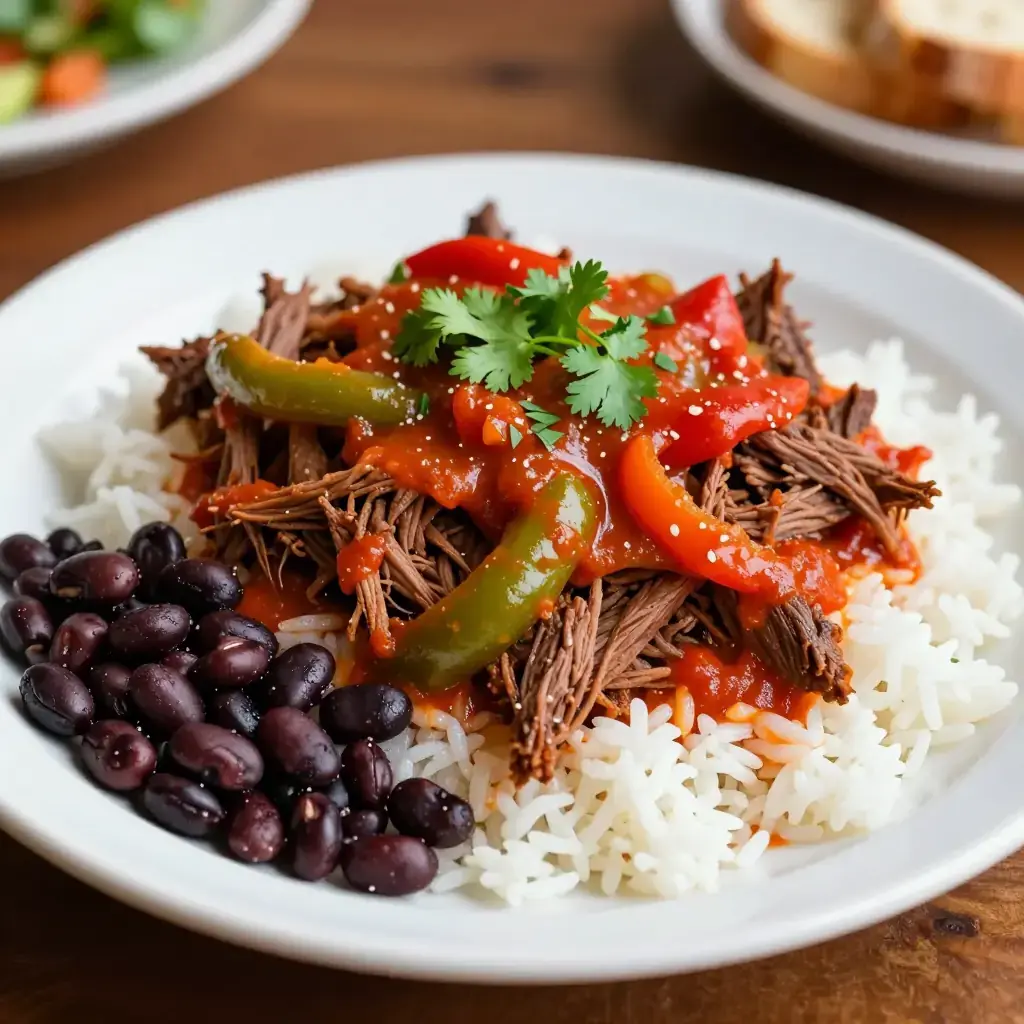 # Ropa Vieja Ropa Vieja — literally "old clothes" — is Cuba's national dish, a slow-braised shredded beef stew that gets its whimsical name from the way the pulled meat resembles colorful rags. It arrived with Spanish colonizers in the 16th century and became deeply Cubanized over generations. Serves: 6 ## Ingredients - 1kg (2.2 lbs) flank steak or beef brisket - 2 tbsp olive oil - 1 large onion, thinly sliced - 1 green bell pepper, thinly sliced - 1 red bell pepper, thinly sliced - 6 garlic cloves, minced - 400g (14 oz) canned crushed tomatoes - 120ml (½ cup) dry white wine - 120ml (½ cup) beef broth - 2 tsp ground cumin - 1 tsp smoked paprika - 1 tsp dried oregano - 2 bay leaves - 100g (3.5 oz) pimento-stuffed green olives, sliced - 2 tbsp capers, drained - Salt and black pepper to taste - Fresh cilantro for serving - Cooked white rice and black beans to serve ## Instructions 1. Season the beef generously with salt and pepper. Heat olive oil in a heavy Dutch oven over medium-high heat and sear the beef for 3–4 minutes per side until deeply browned. Remove and set aside. 2. In the same pot, sauté the onion and bell peppers over medium heat for 8 minutes until softened. Add garlic and cook 1 minute more. 3. Pour in the white wine and scrape up any browned bits from the bottom. Add crushed tomatoes, beef broth, cumin, smoked paprika, oregano, and bay leaves. Stir to combine. 4. Return the seared beef to the pot. Cover and braise at a bare simmer on the stovetop for 2.5–3 hours, or transfer to a slow cooker on low for 8 hours, until the beef pulls apart easily. 5. Remove beef to a cutting board and shred using two forks, pulling along the grain into long strips. Return shredded beef to the sauce. 6. Stir in olives and capers. Simmer uncovered for 15 minutes to meld the flavors and thicken slightly. Remove bay leaves. 7. Serve over white rice with black beans, garnished with fresh cilantro. **Cook's Notes:** The slow cooker is ideal here — the low, moist heat transforms tough flank steak into impossibly tender strands. Olives and capers bring a briny punch that is authentic and essential; do not omit them. Leftovers improve dramatically overnight as the flavors meld.Images
