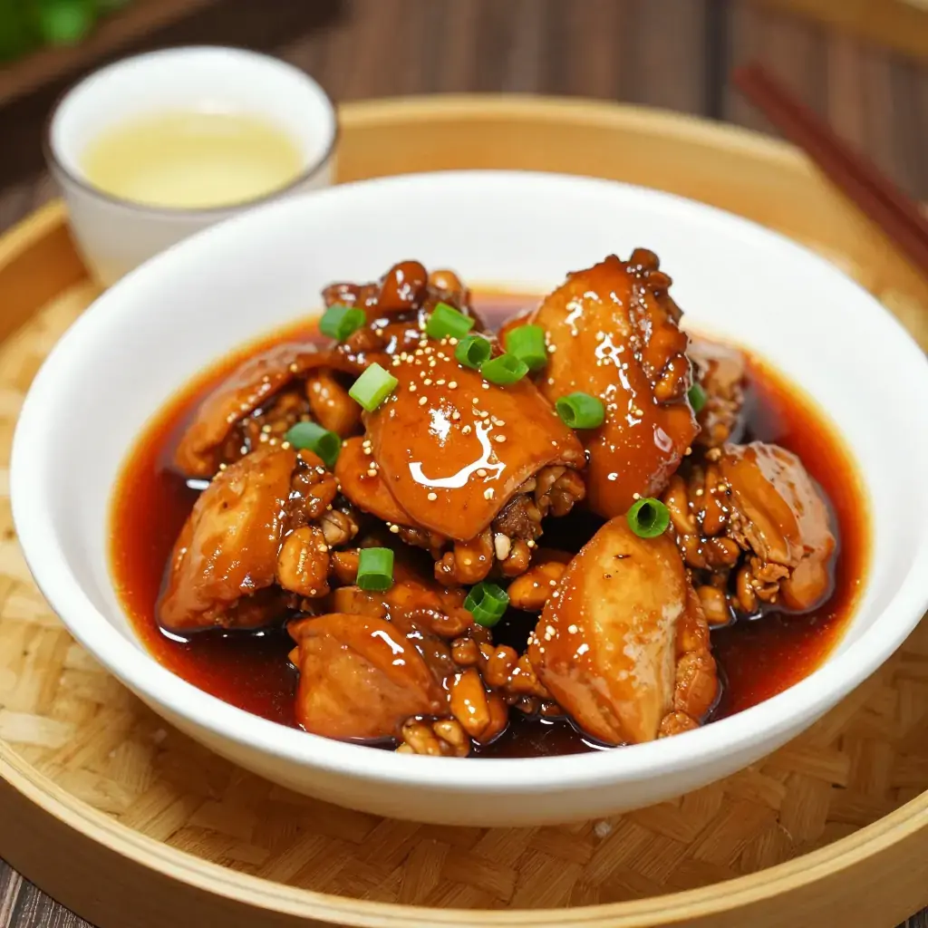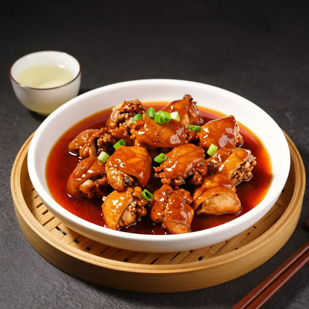 # Fujian Red Wine Lees Chicken (Hóng Zāo Jī) Fujian province faces the Taiwan Strait, and its cuisine is defined by the sea, by mountains, and by a profound love of fermented ingredients. Hong zao — the crimson lees left after pressing Fujian red glutinous rice wine — is the defining flavoring of the region. It imparts a deep brick-red color, a gentle sweetness, and a complex umami earthiness that no other ingredient replicates. This braised chicken dish is served at Fujianese festivals and family reunions; it signals abundance and effort. The lees are whisked into the braising liquid where they slowly dissolve, tinting everything around them. Finding hong zao outside China may require a trip to a well-stocked Chinese grocery, but the hunt is worthwhile. Serves: 4 ## Ingredients - 1 whole chicken (about 1.5 kg / 3 lb 5 oz), cut into 10 pieces, or equivalent bone-in thighs - 120 g (½ cup) hong zao (Fujian red wine lees / red glutinous rice lees) - 2 tbsp Shaoxing rice wine - 1 tbsp light soy sauce - 1 tsp sesame oil - 1 tbsp neutral oil - 6 garlic cloves, roughly chopped - 4 slices fresh ginger - 1 tsp sugar - 250 ml (1 cup) water - Salt to taste - 2 spring onions, sliced, to garnish ## Instructions 1. Rinse chicken pieces and pat dry. Season lightly with salt and let rest 10 minutes at room temperature. 2. In a small bowl whisk together the hong zao, Shaoxing wine, soy sauce, and sugar until the lees are mostly dissolved into a paste. Set aside. 3. Heat neutral oil in a wok or wide skillet over high heat. Working in batches, sear the chicken pieces skin-side down for 3–4 minutes until the skin is golden and pulls away cleanly. Flip and sear the other side 2 minutes. Remove to a plate. 4. Reduce heat to medium. Add garlic and ginger to the wok and stir-fry 30 seconds until fragrant. 5. Add the hong zao paste and stir constantly for 1 minute — it will deepen in color and smell toasty. 6. Return all the chicken to the wok. Pour in water, stir to combine, and bring to a boil. 7. Reduce heat to low, cover, and braise 35 minutes, turning chicken halfway through. 8. Uncover, increase heat to medium-high, and reduce the sauce 5–8 minutes until it coats the back of a spoon. 9. Finish with sesame oil, taste and adjust salt. Garnish with spring onions and serve with steamed rice. **Cook's Notes:** Hong zao (also labelled as hong qu zao or red yeast rice lees) is available in Chinese supermarkets refrigerated or in sealed pouches. It is the byproduct of making Fujian rice wine and carries living cultures — refrigerate and use within two weeks of opening. For a smokier version traditional cooks add a small piece of dried tangerine peel to the braise.Images