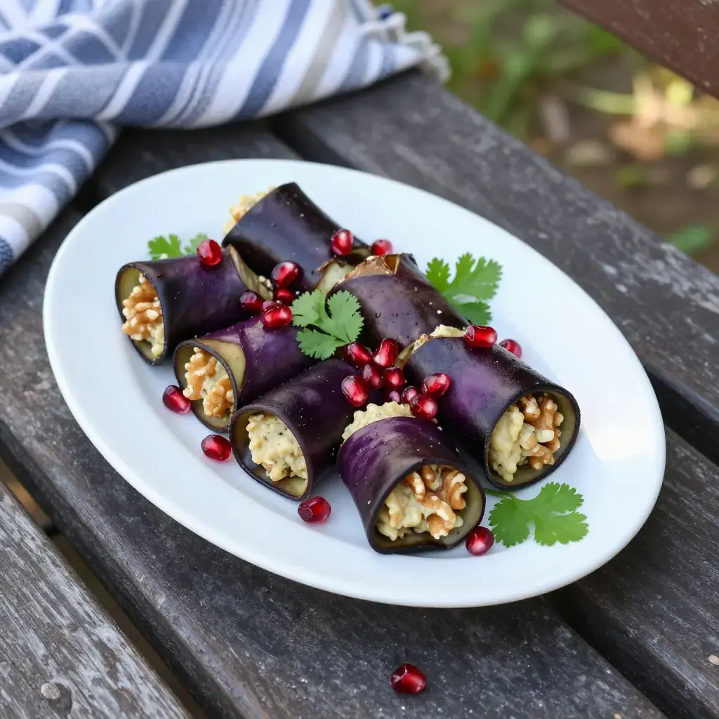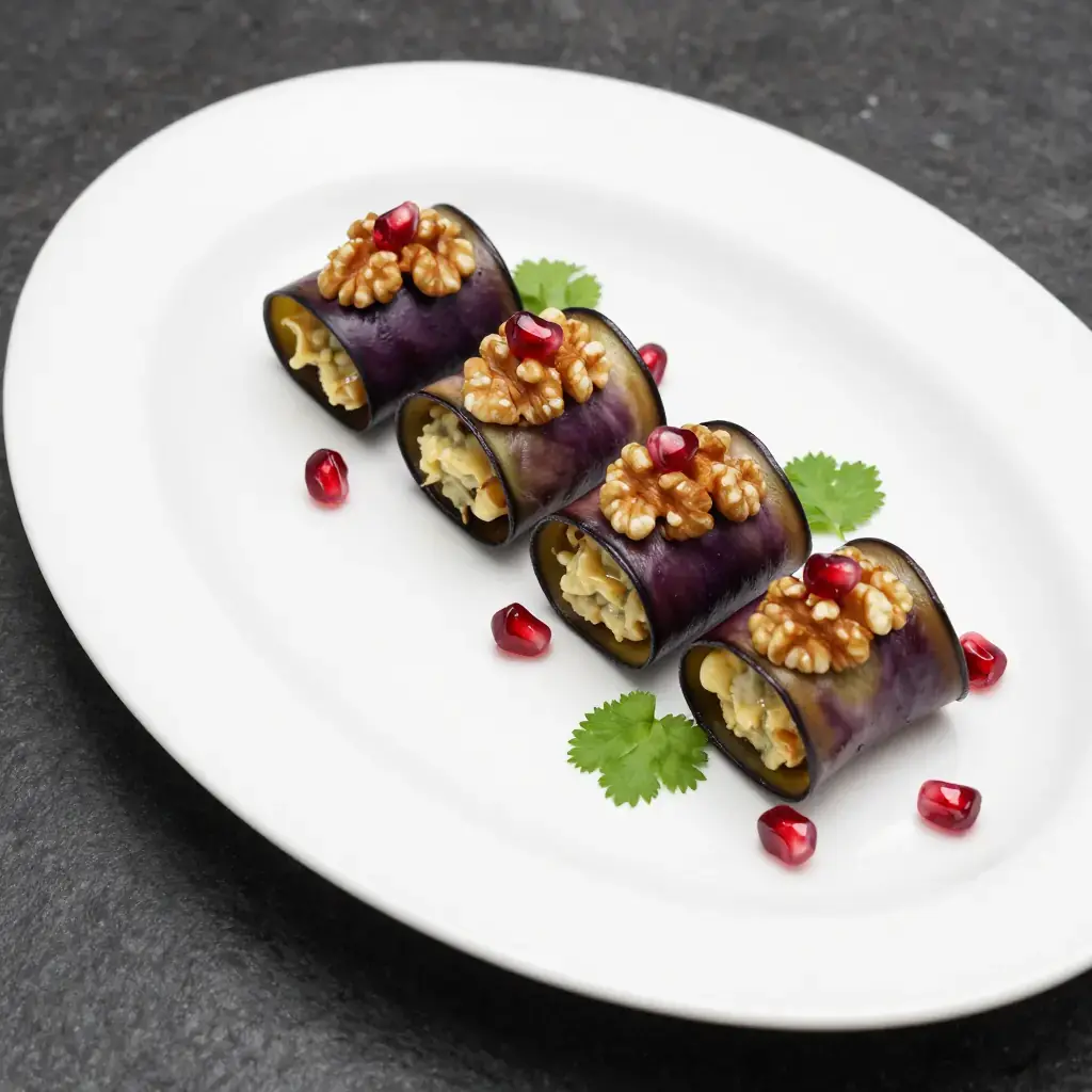 # Georgian Walnut-Stuffed Eggplant Rolls (Badrijani Nigvzit) Georgia sits at one of history's great crossroads — between the Black Sea and the Caspian, between Europe and Asia, between Christianity and Islam — and its cuisine reflects every collision. Badrijani nigvzit is arguably the country's most beloved cold appetizer: thin-sliced eggplant fried until silky, then spread with a boldly spiced walnut paste and rolled into tight cylinders. The paste, garo, is the backbone of Georgian cooking — ground walnuts beaten with garlic, blue fenugreek (utskho suneli), coriander, chili, and wine vinegar until it becomes a dense, fragrant mortar. The dish is always served at room temperature, often decorated with pomegranate seeds and a single fresh herb leaf. It appears on every supra (Georgian feast table) as part of the cold course alongside pkhali salads and pickled vegetables. Serves: 6 as a starter ## Ingredients **For the eggplant:** - 2 large eggplants (aubergines), about 600 g (1 lb 5 oz) total - 1 tsp salt - 120 ml (½ cup) neutral oil for frying **For the walnut filling (garo):** - 200 g (7 oz / 2 cups) walnuts - 3 garlic cloves - 1 tsp utskho suneli (blue fenugreek) — substitute regular fenugreek if unavailable - 1 tsp ground coriander - ½ tsp ground marigold (imereti saffron) or a pinch of turmeric - ½ tsp dried chili flakes - 2 tbsp white wine vinegar - 3–4 tbsp cold water, as needed - Salt to taste **To garnish:** - Seeds from ½ pomegranate - Small bunch fresh coriander (cilantro) leaves ## Instructions 1. Slice eggplants lengthways into planks about 5 mm (¼ in) thick. Lay on a tray, sprinkle with salt, and leave 20 minutes to draw out moisture. Pat very dry with paper towel. 2. Heat 3 tbsp oil in a large frying pan over medium-high heat. Fry eggplant slices in batches, 2–3 minutes per side, until deep golden and completely soft through the centre. Add oil between batches. Drain on paper towel and cool completely. 3. Make the garo: pulse walnuts and garlic in a food processor to a coarse crumb. Add utskho suneli, coriander, marigold, chili, vinegar, and a pinch of salt. Process while drizzling in water until you have a thick, spreadable paste — it should hold its shape but not crumble. Taste and adjust salt and vinegar. 4. Lay a cooled eggplant slice on a board. Spread a generous tablespoon of walnut paste evenly across the surface, leaving a 5 mm border at one end. Roll firmly from the filled end and set seam-side down on a serving plate. 5. Repeat with remaining slices and filling. Refrigerate at least 30 minutes before serving. 6. Just before serving, scatter pomegranate seeds over the rolls and tuck fresh coriander leaves alongside. **Cook's Notes:** The rolls improve after a few hours in the refrigerator and are even better the next day once the walnut paste has softened and merged with the eggplant. Utskho suneli (blue fenugreek) is available online and in Middle Eastern or Eastern European grocery stores — it has a gentler, slightly sweeter flavor than regular fenugreek and is worth seeking out. This dish is naturally gluten-free and vegan.Images